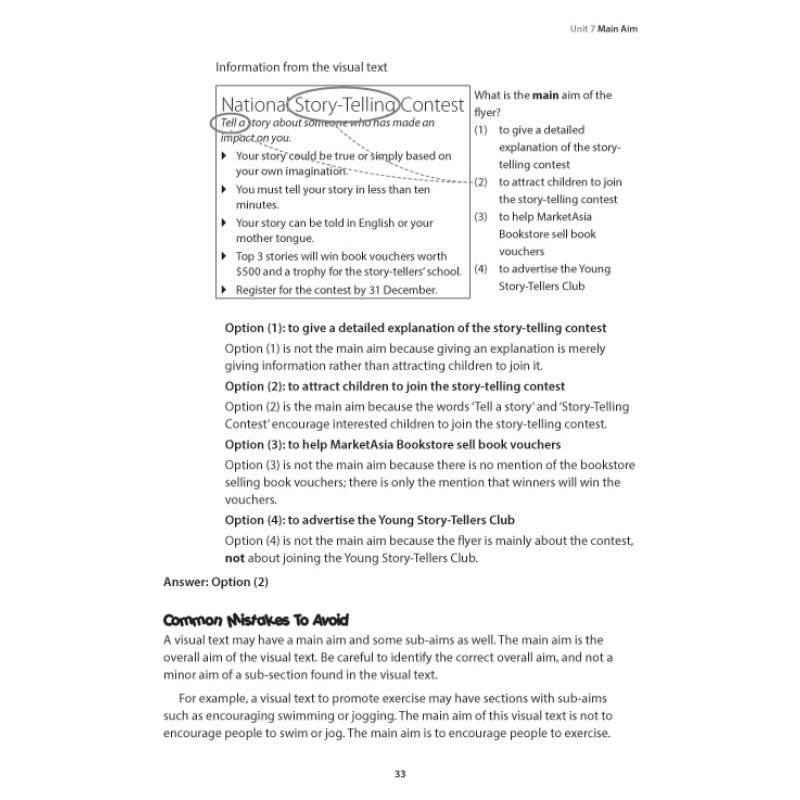 The following common types of questions in Comprehension Visual Text are explained in this section: (a) True statement, (b) Vocabulary in context, (c) Important details, (d) Reasons, (e) Evidence, (f) Facts vs. non-facts, (g) Main aim, (h) Punctuation. 10 full tests in Comprehension Visual Text follow this section.