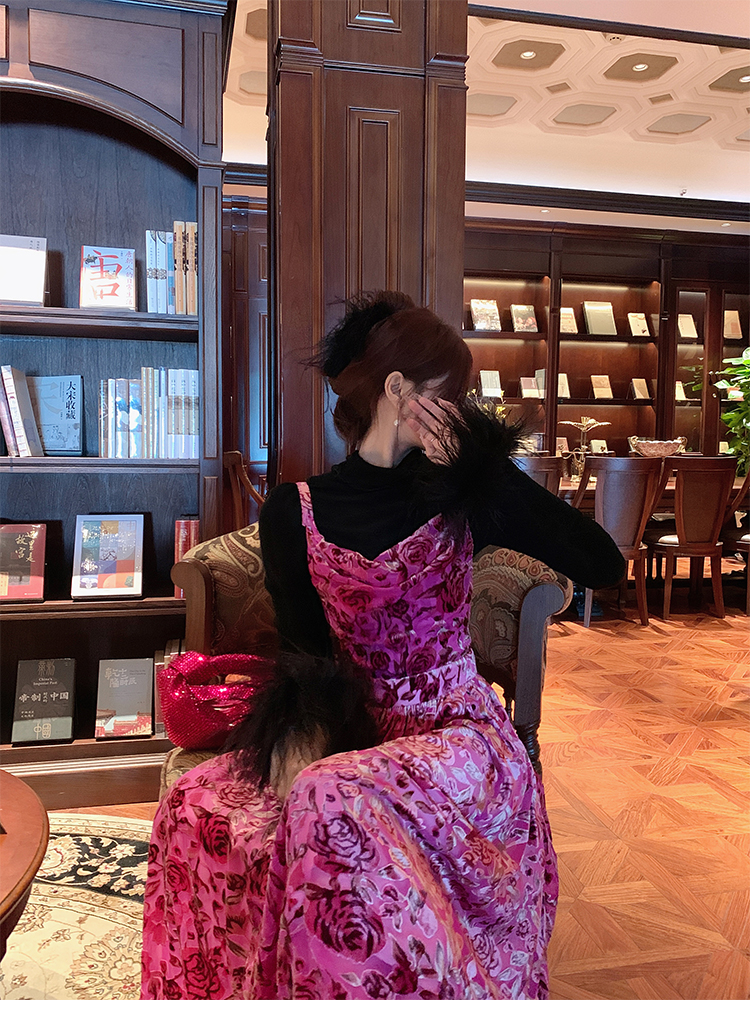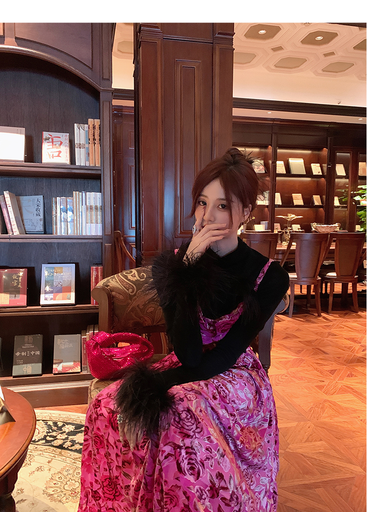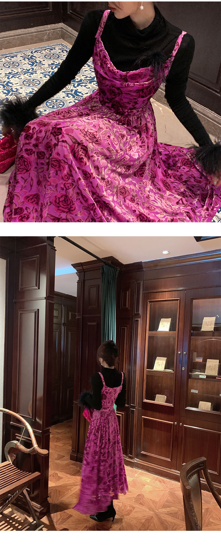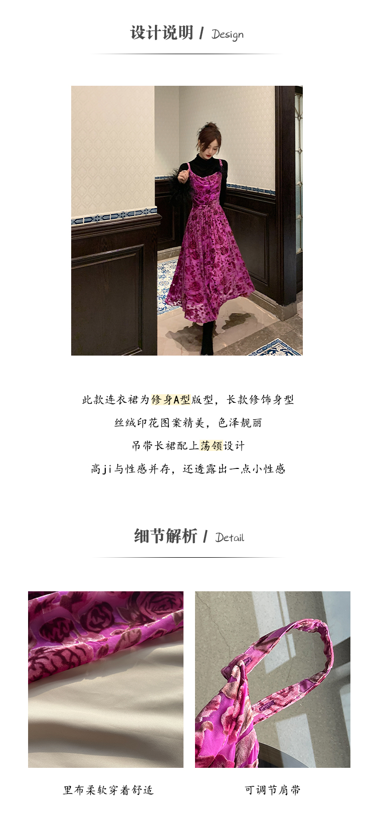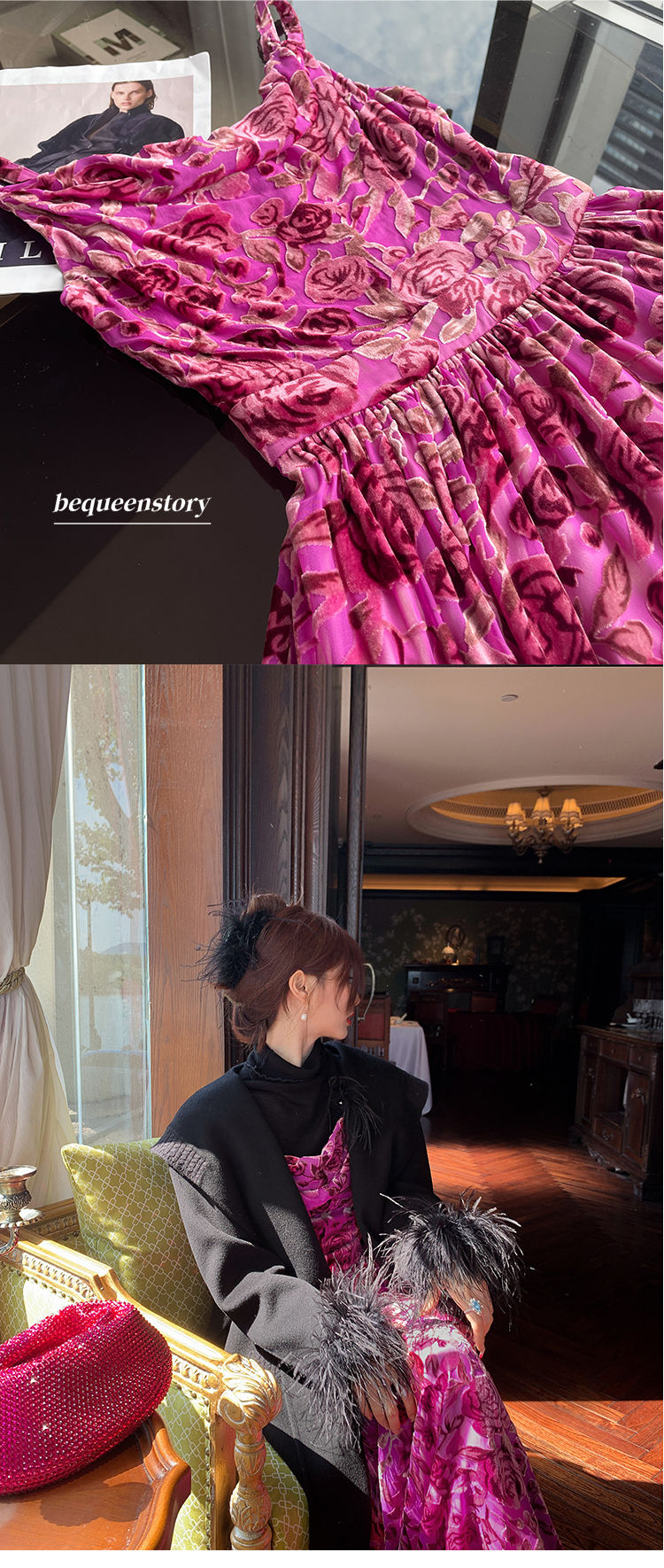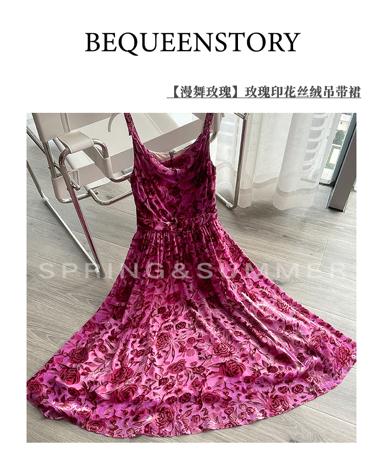BeQueenStory 【漫舞玫瑰】修身吊带玫瑰印花丝绒连衣裙