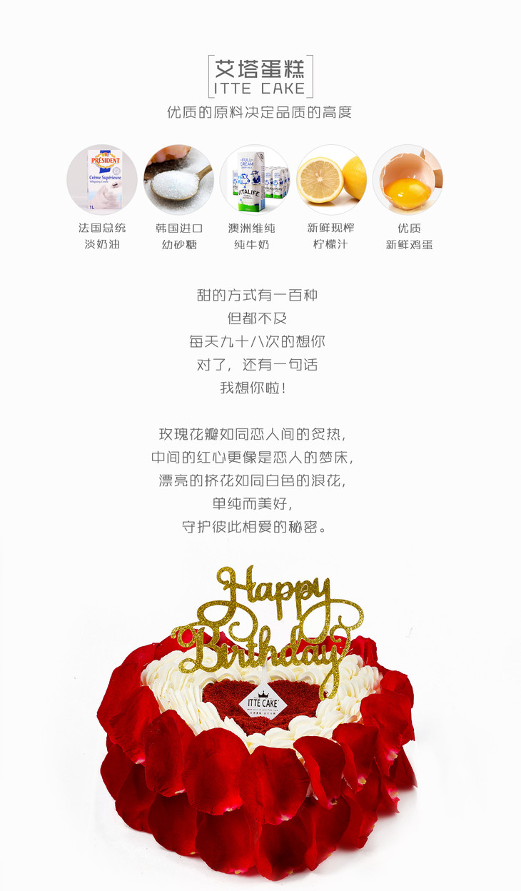 【红丝绒甜心】红丝绒蛋糕胚,酸奶油加新鲜水果夹心,新鲜玫瑰花瓣装饰;七夕 情人节 表白 女友 恋人