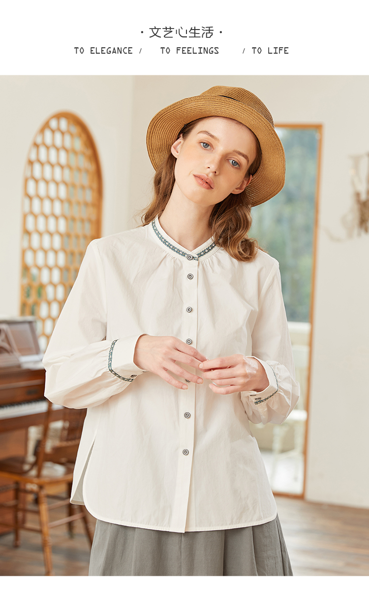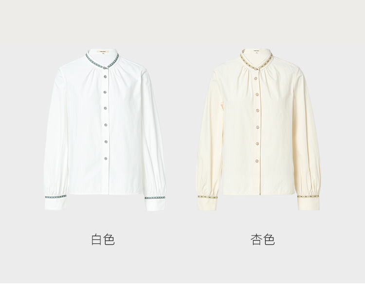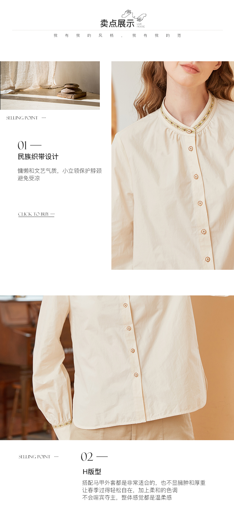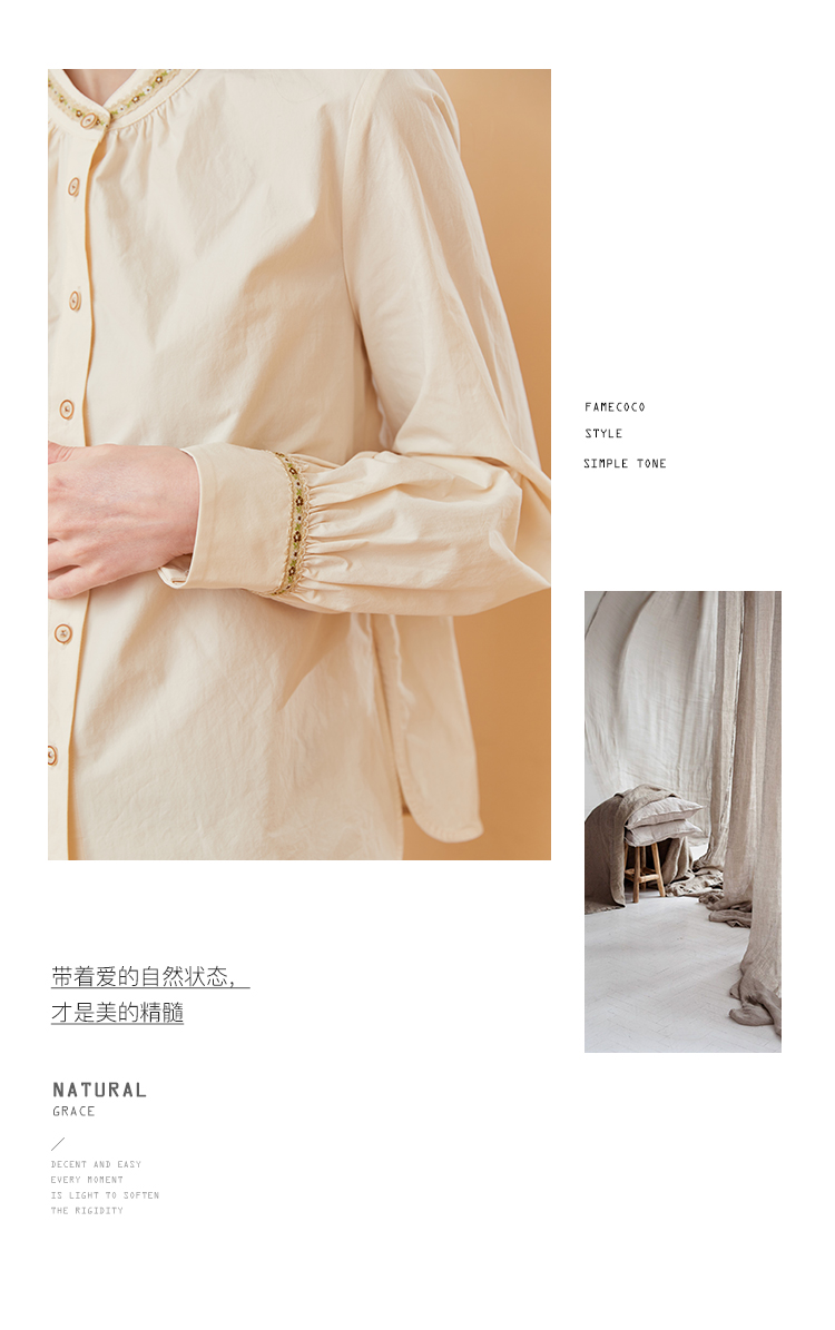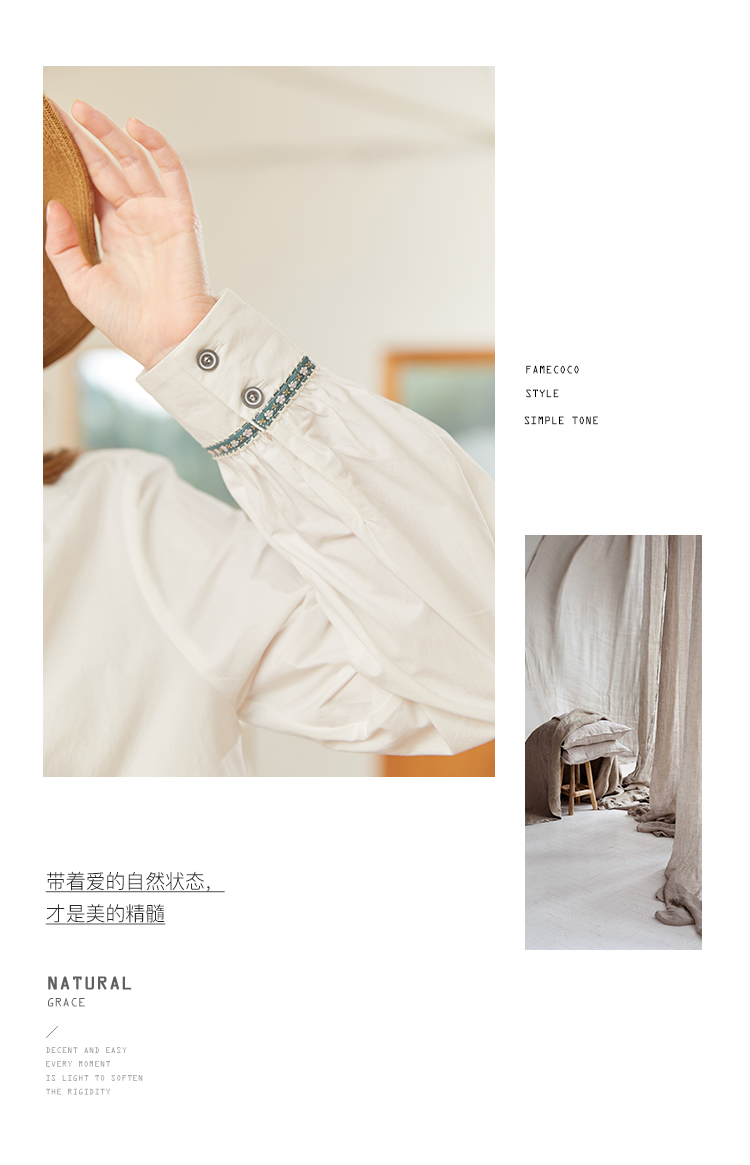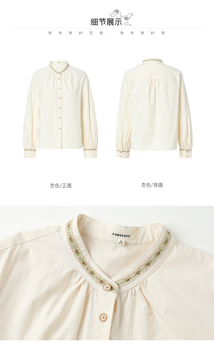 Famecoco范可儿小立领衬衣女春款拼接花边织带衬衫纯棉