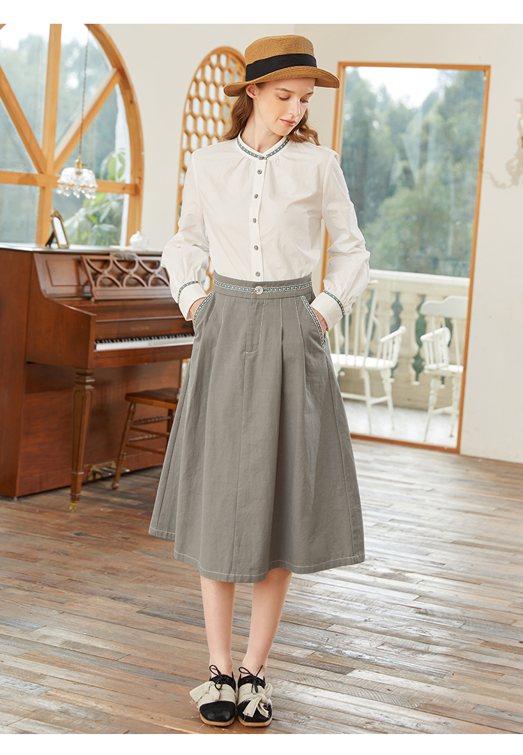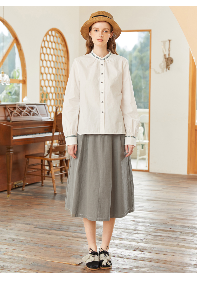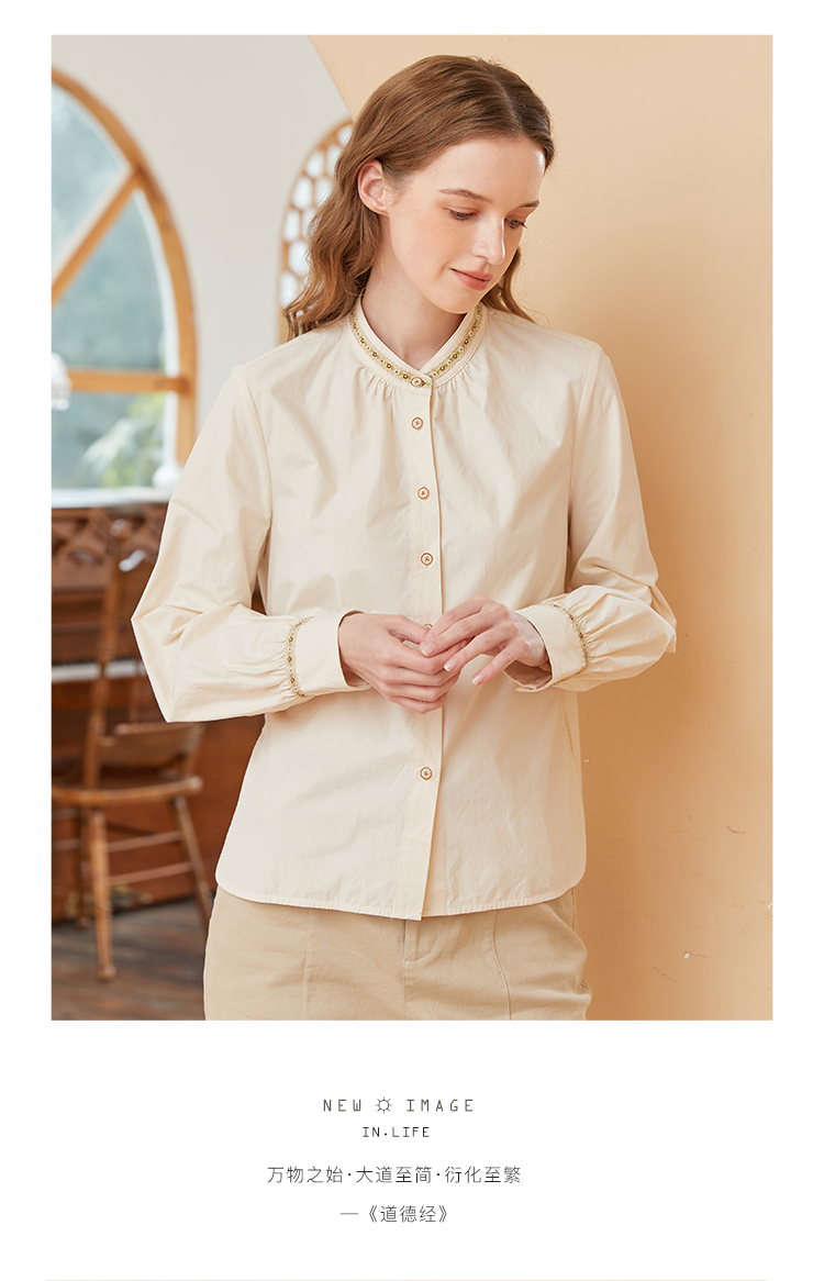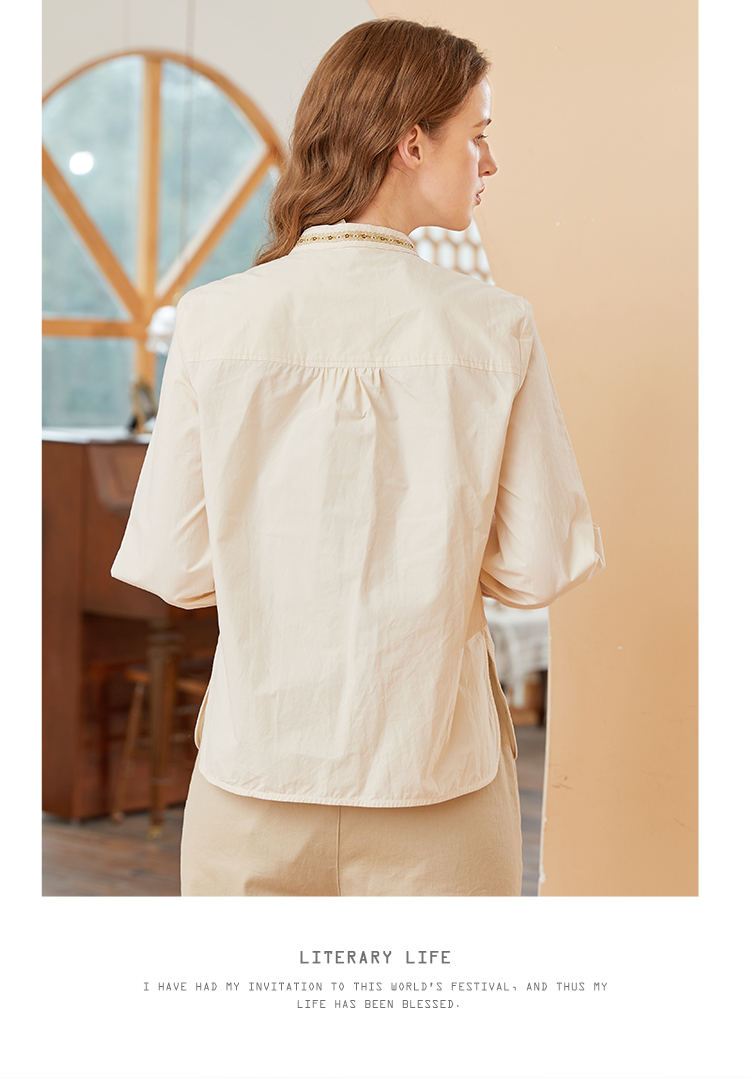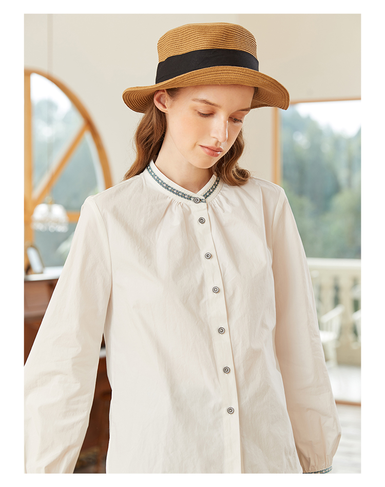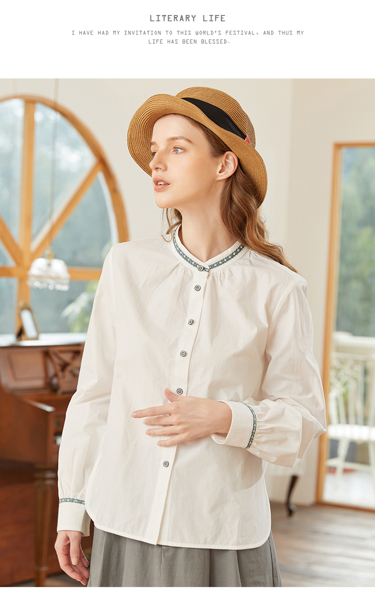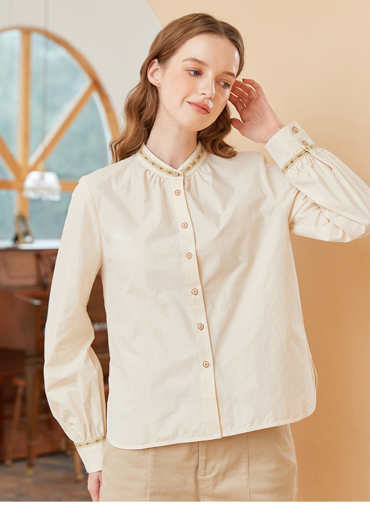 Famecoco范可儿小立领衬衣女春款拼接花边织带衬衫纯棉
