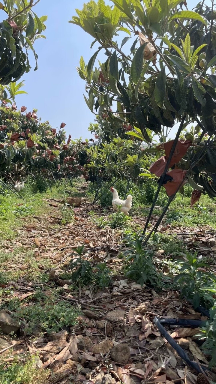 我们的枇杷树就在海拔2000米以上的鸡足山山脉上从上一年春天长到现在。为了枇杷的健康,农户套上无铅纸袋生态防虫;尽量不施虫害药物,满园的走地鸡是最好的除草助手。