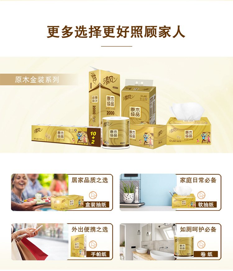清风(APP)抽纸 原木纯品金装系列 3层130抽软抽纸巾*16包(整箱销售)(新老包装交替发货)