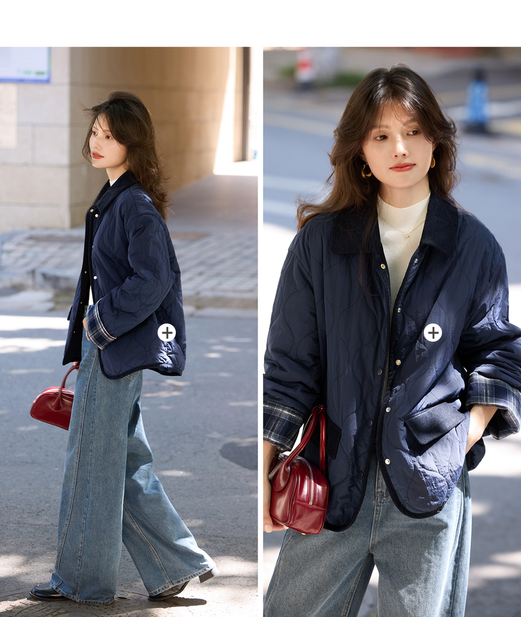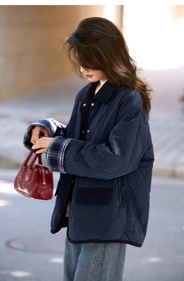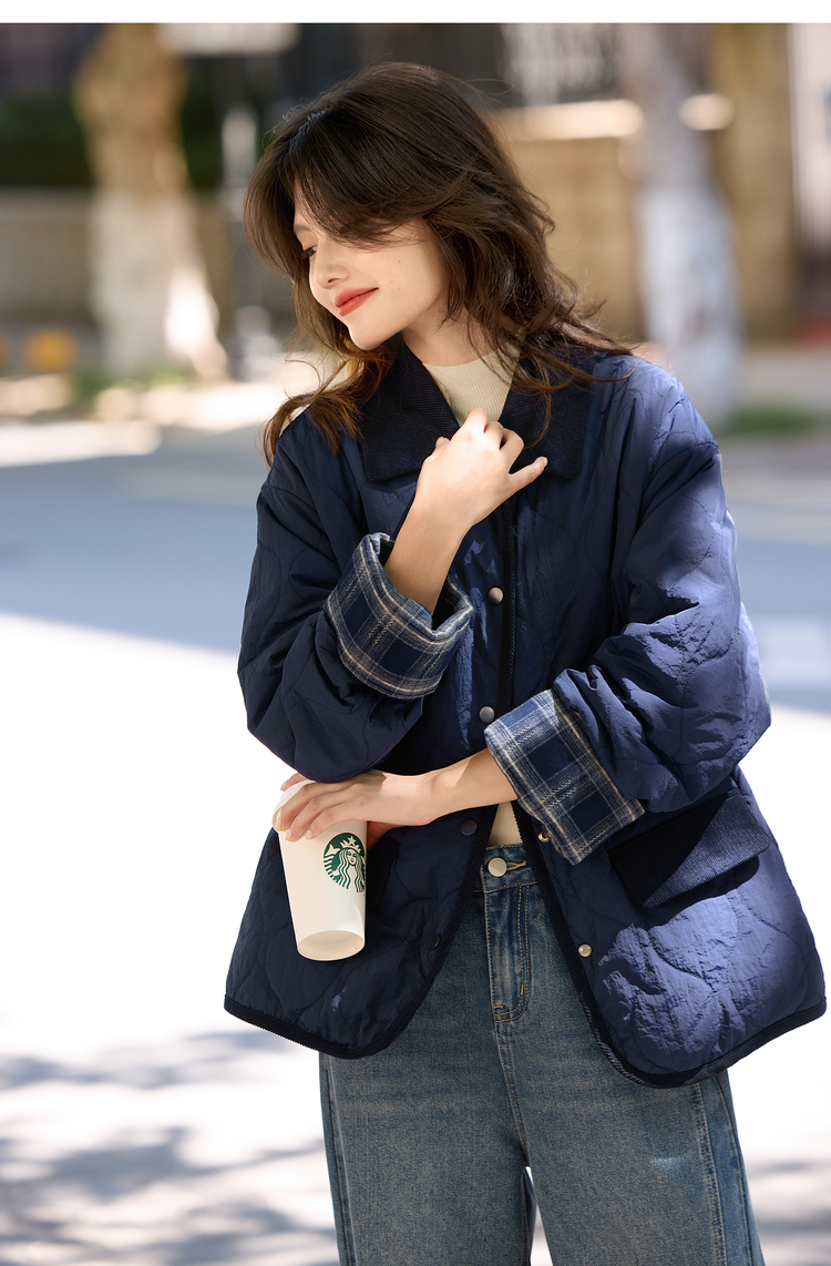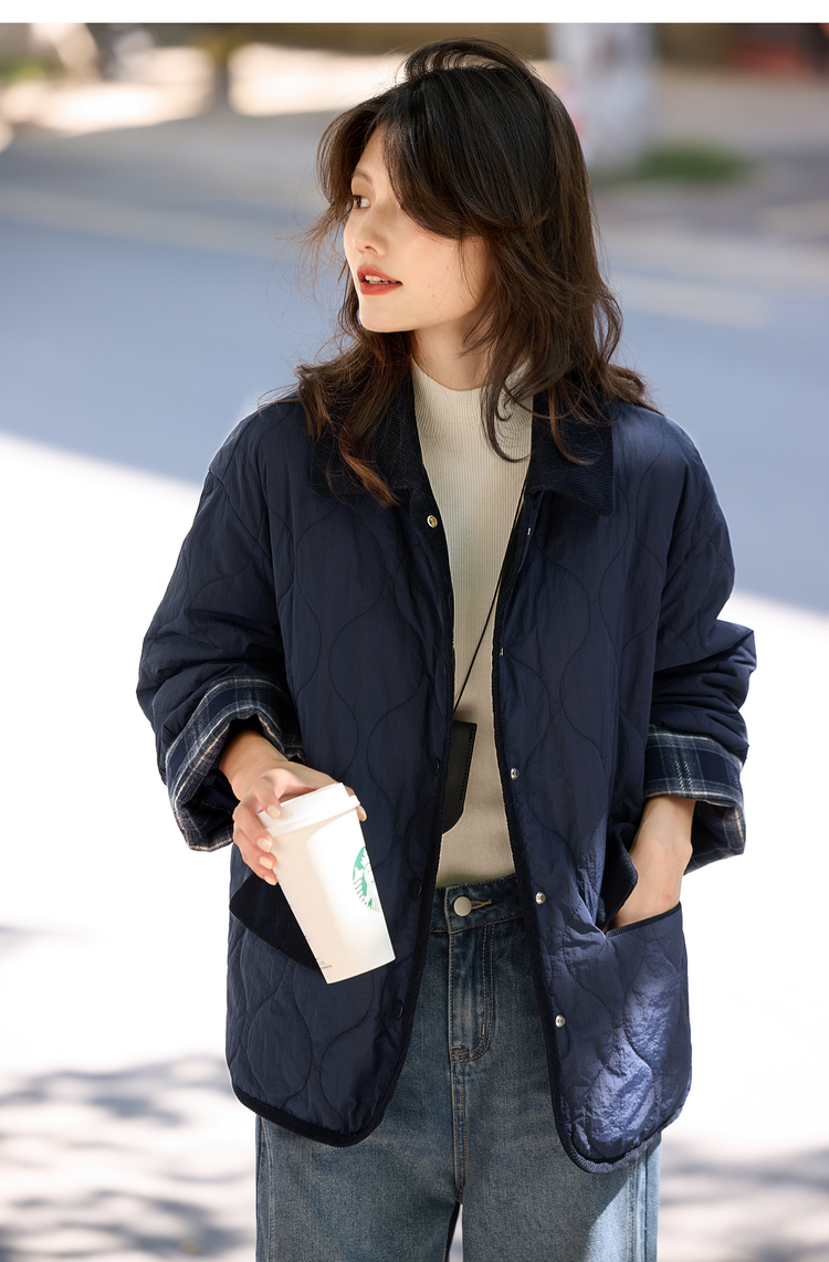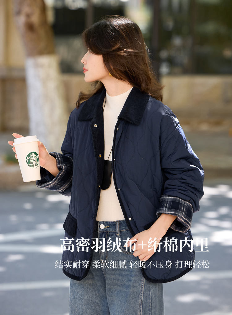 【周末秒杀】熙世界巴恩工装风菱格棉服短外套女2025秋冬新款宽松保暖翻领棉衣