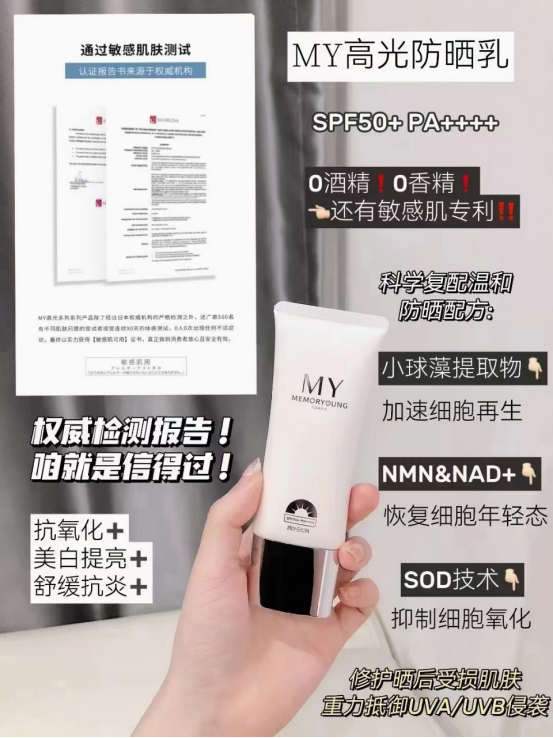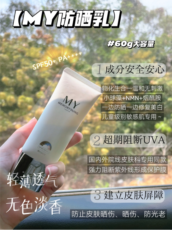 MY光养防晒乳 还特别是添加了多重养肤成分,仿佛塞进一整瓶的修护精华! 小球藻C.G.F → 抗衰净化引擎,光损伤“清道夫” 高纯度烟酰胺 → 油暗皮亲妈!白净哑光一手抓 大中小透明质酸 → 💧 深水炸弹级 层层锁水保湿 芍药根+红没药醇 → 【院线级舒缓配方】术后/暴晒后,红/肿/痒/烂脸,复配灭焱退红 高浓度NMN/NAD+ → 【千元项目同款】抵御胶原流失,紧致弹润肌肤,远离松垮脸