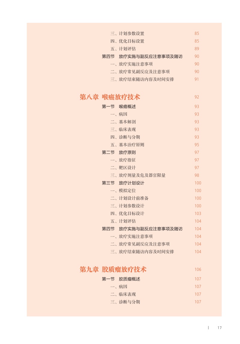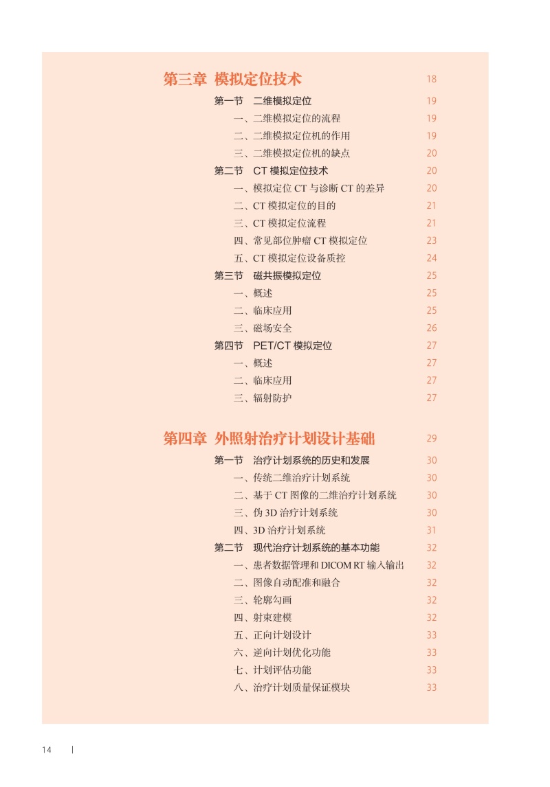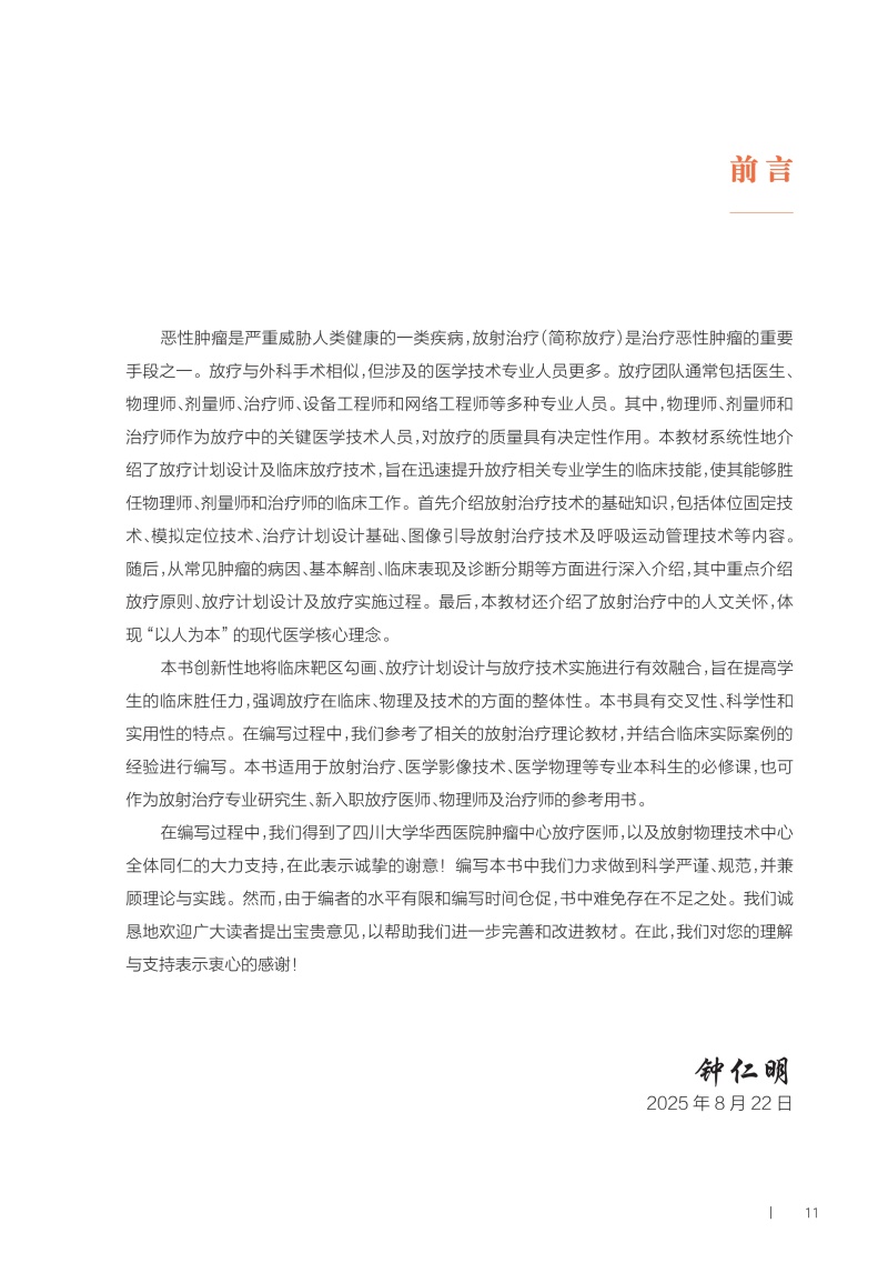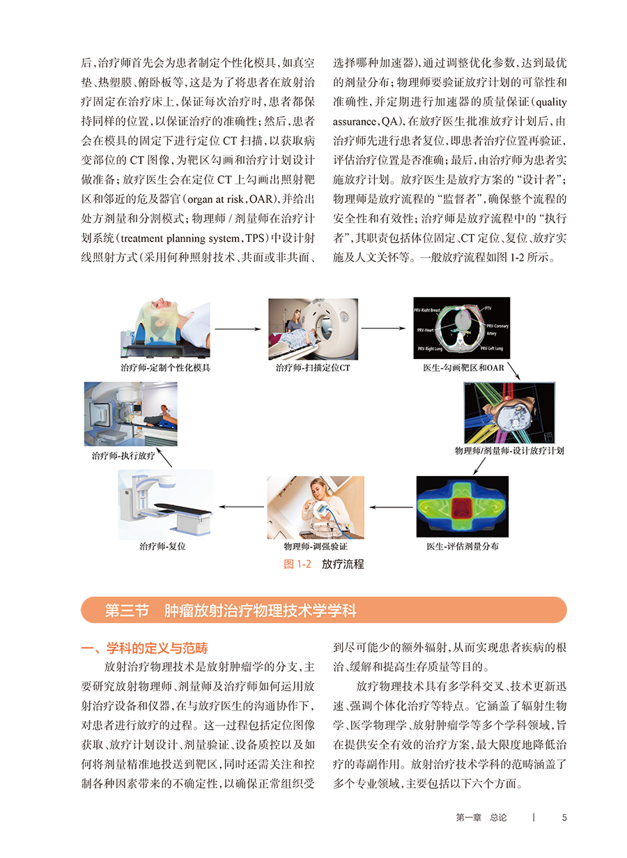 本教材系统性地介绍了放疗计划设计及临床放疗技术,旨在迅速提升放疗相关专业学生的临床技能,使其能够胜任物理师、剂量师和治疗师的临床工作。首先介绍放射治疗技术的基础知识,包括体位固定技术、模拟定位技术、治疗计划设计基础、图像引导放射治疗技术及呼吸运动管理技术等内容。随后,从常见肿瘤的病因、基本解剖、临床表现及诊断分期等方面进行深入介绍,其中重点介绍放疗原则、放疗计划设计及放疗实施过程。最后,本教材还介绍了放射治疗中的人文关怀,体现“以人为本”的现代医学核心理念。