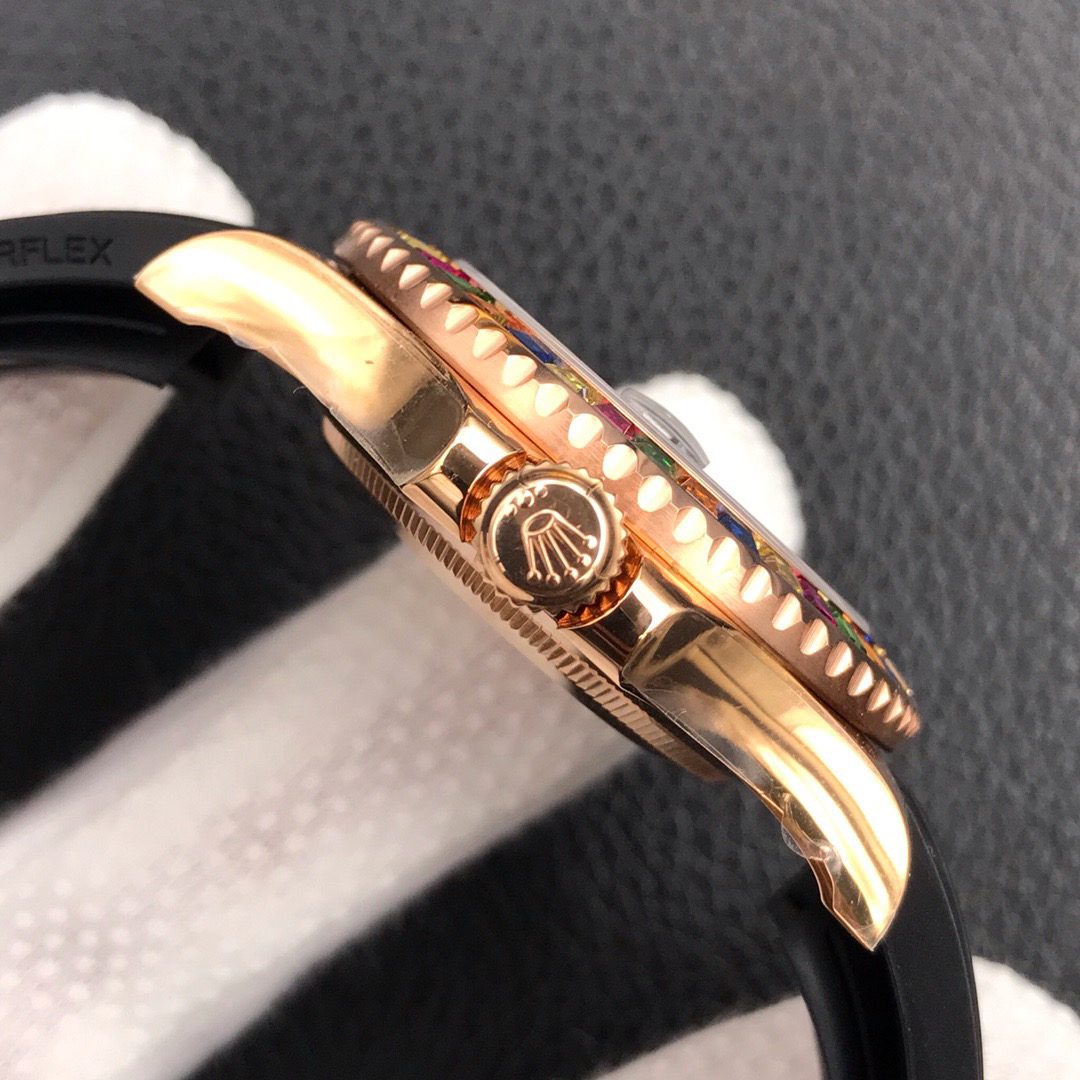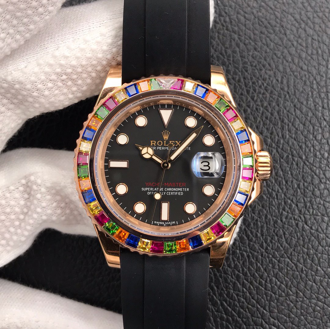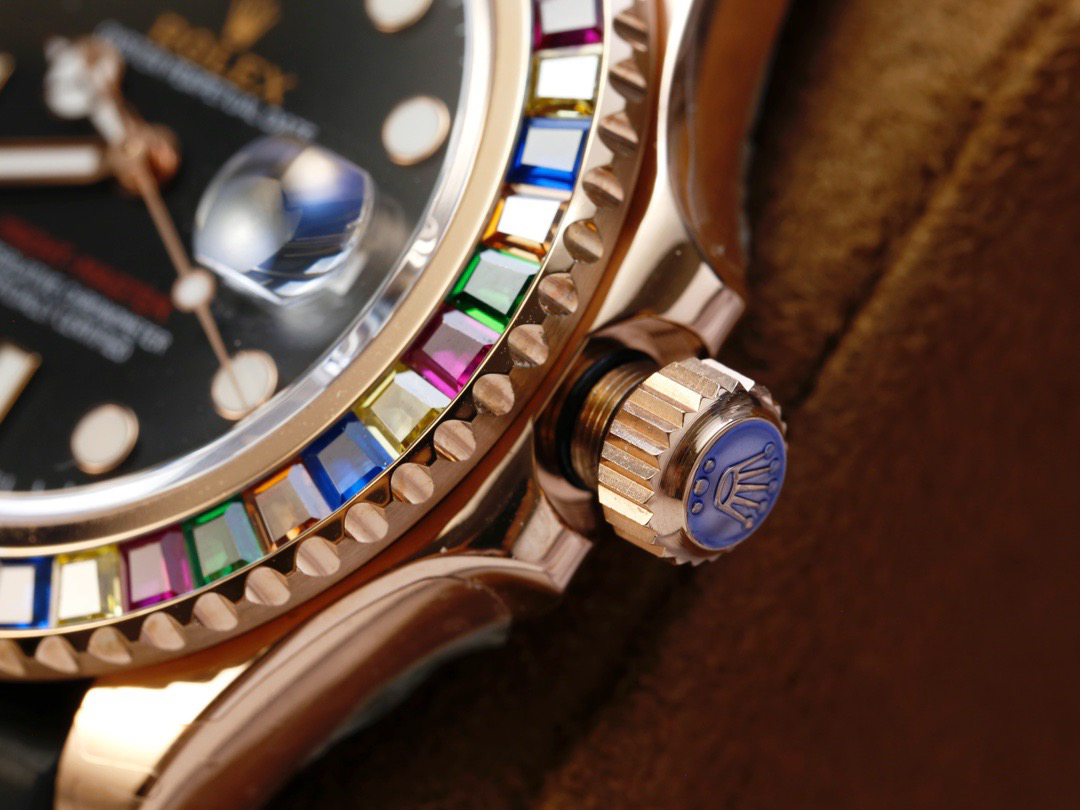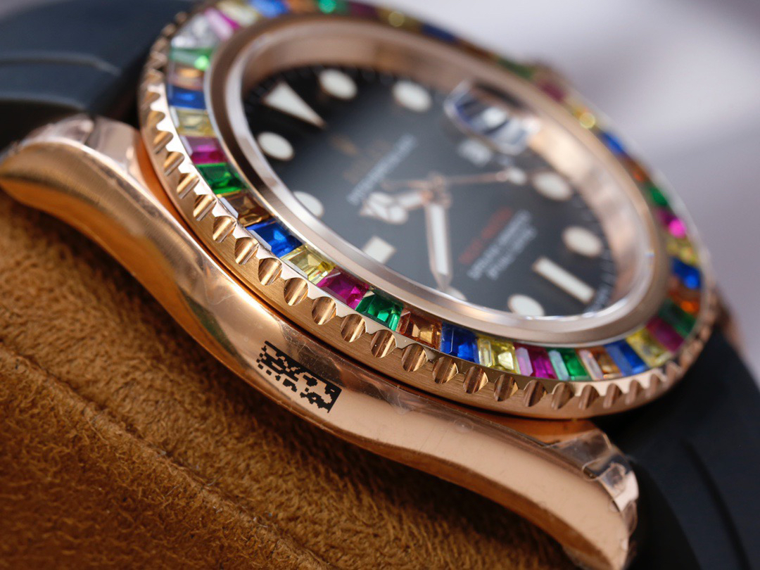 2017年瑞士巴塞尔钟表展劳力士推出新款"糖豆"圈劳力士游艇,型号:116695SATS,史上最精湛的彩钻潜水腕表,经典航海表首次以镶宝石款惊艳亮相,如此有创意的做法在巴塞尔表展上引起了不小的轰动。N厂自然不会错过这么一个大热款,复刻版本采用和正品一致的定制级Tutti Frutti风格五色彩钻,纯手工独立镶嵌,三角钻石采用明亮式切割最接近正品的切割方式