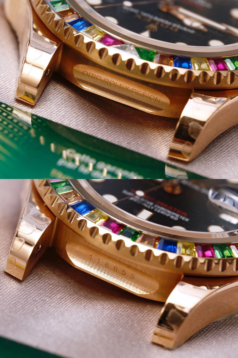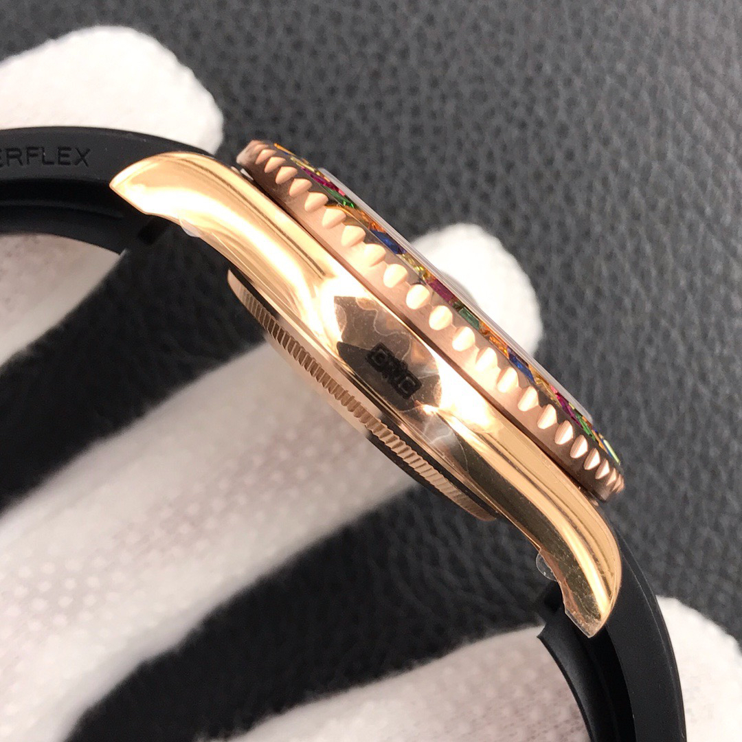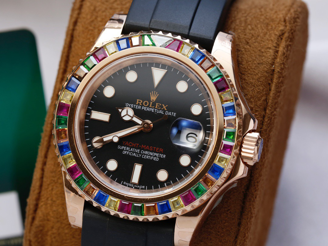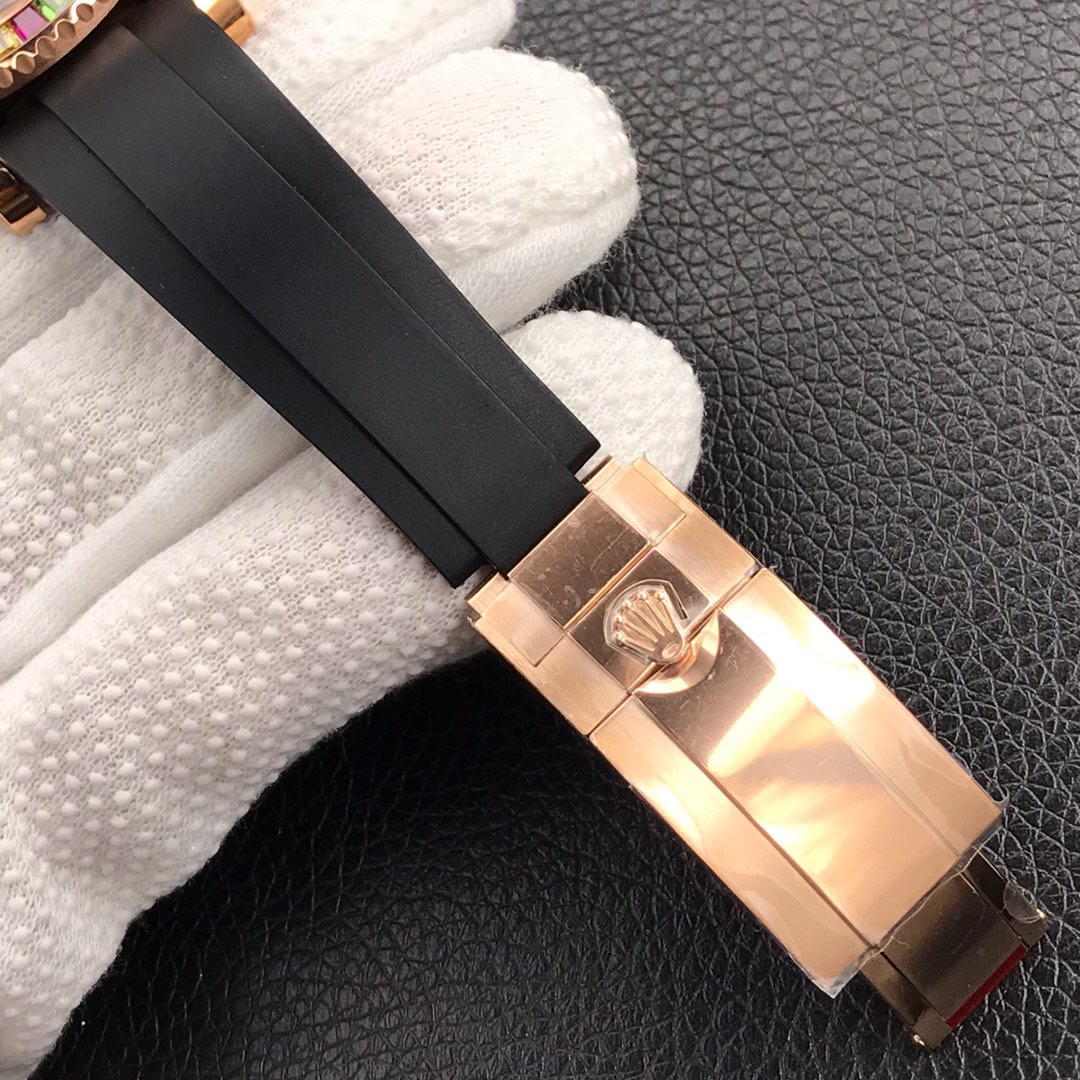 2017年瑞士巴塞尔钟表展劳力士推出新款"糖豆"圈劳力士游艇,型号:116695SATS,史上最精湛的彩钻潜水腕表,经典航海表首次以镶宝石款惊艳亮相,如此有创意的做法在巴塞尔表展上引起了不小的轰动。N厂自然不会错过这么一个大热款,复刻版本采用和正品一致的定制级Tutti Frutti风格五色彩钻,纯手工独立镶嵌,三角钻石采用明亮式切割最接近正品的切割方式