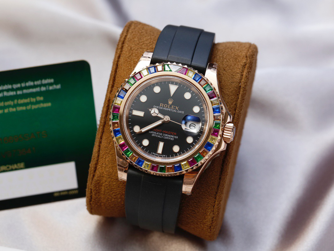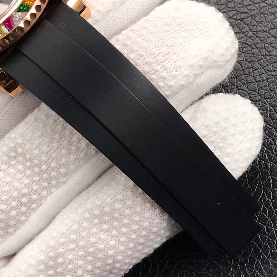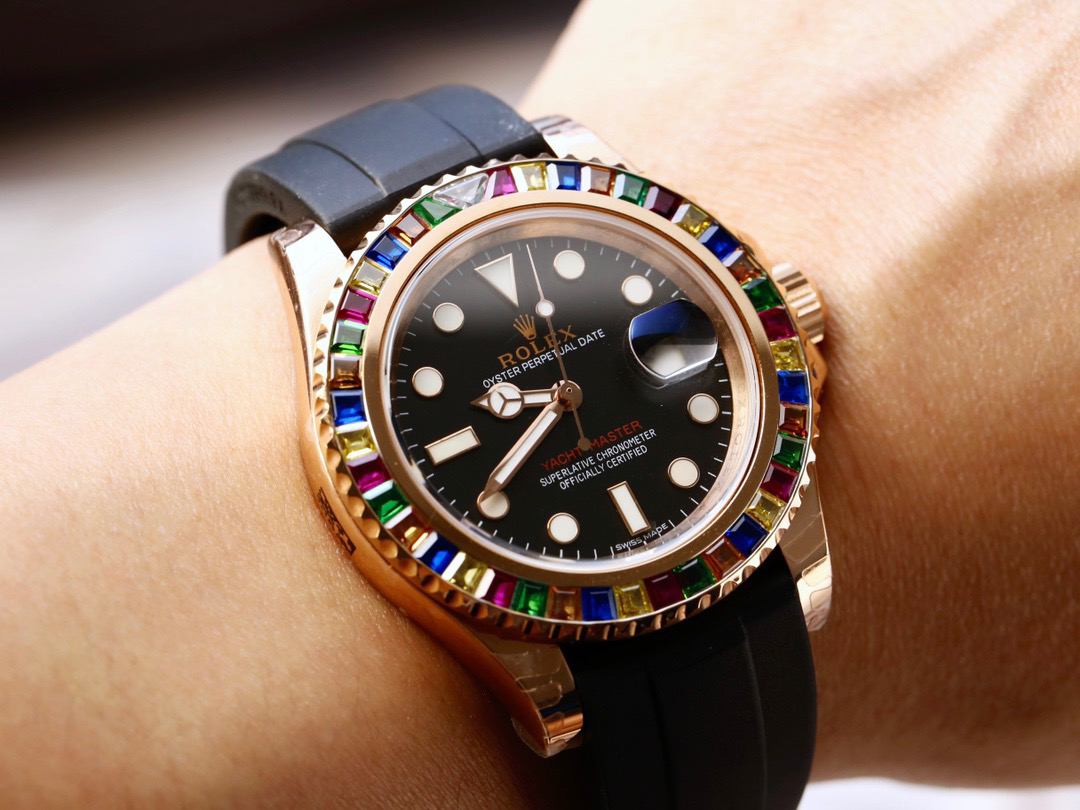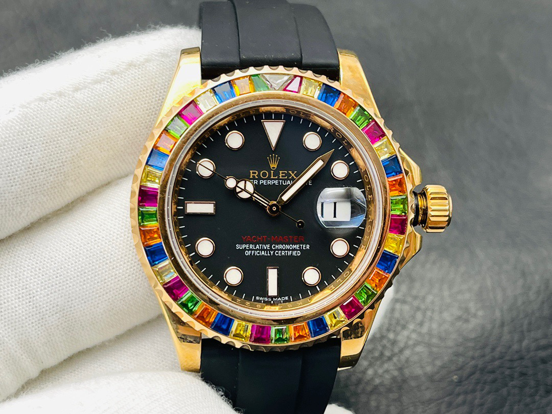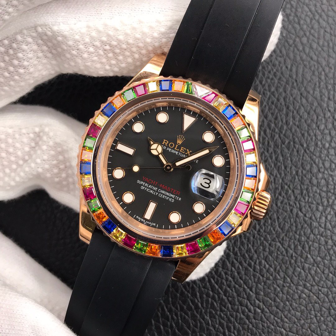 2017年瑞士巴塞尔钟表展劳力士推出新款"糖豆"圈劳力士游艇,型号:116695SATS,史上最精湛的彩钻潜水腕表,经典航海表首次以镶宝石款惊艳亮相,如此有创意的做法在巴塞尔表展上引起了不小的轰动。N厂自然不会错过这么一个大热款,复刻版本采用和正品一致的定制级Tutti Frutti风格五色彩钻,纯手工独立镶嵌,三角钻石采用明亮式切割最接近正品的切割方式