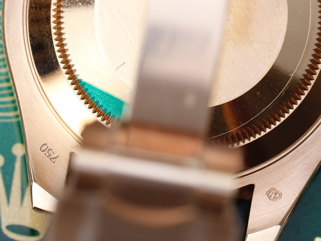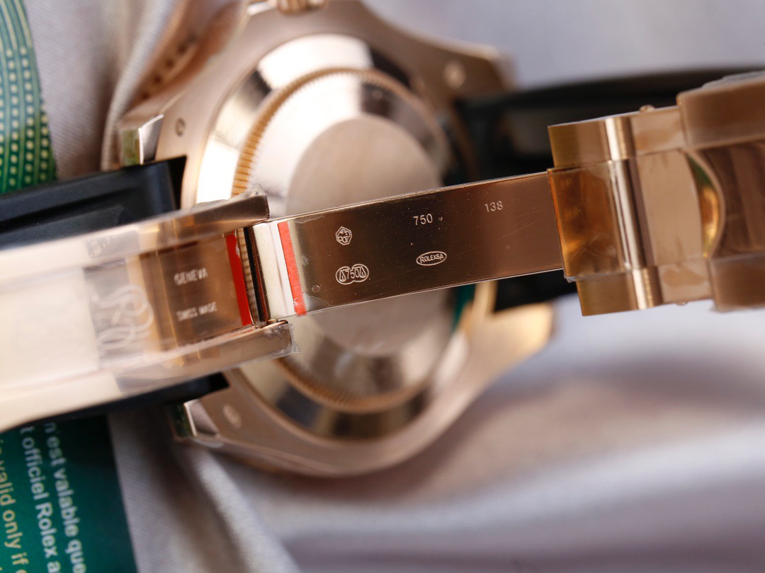 表盘黑色部分处理的非常的细腻,这是n厂复刻金游艇以来一直积累的功力,我们可以看清表盘里面细腻的磨砂质感。产品的logo,防水以及系列等标示在颜色、粗细、长短方面都是高度还原出正品韵味,同时没有任何油漆的溢出现象。时标和指针都是边绿采用玫瑰金材质,我们可以着出玫瑰金的部分处理的非常有光泽,而且没有伤痕的情况,这点在仿表里实际上是非常的常见