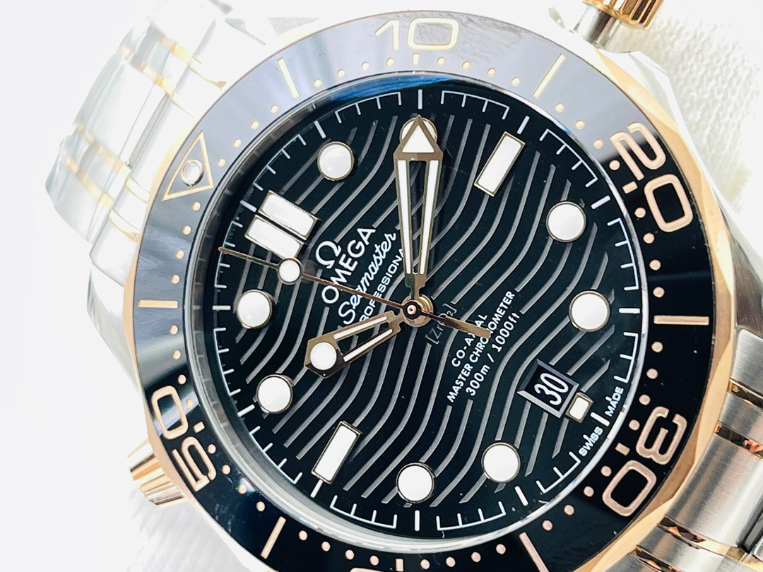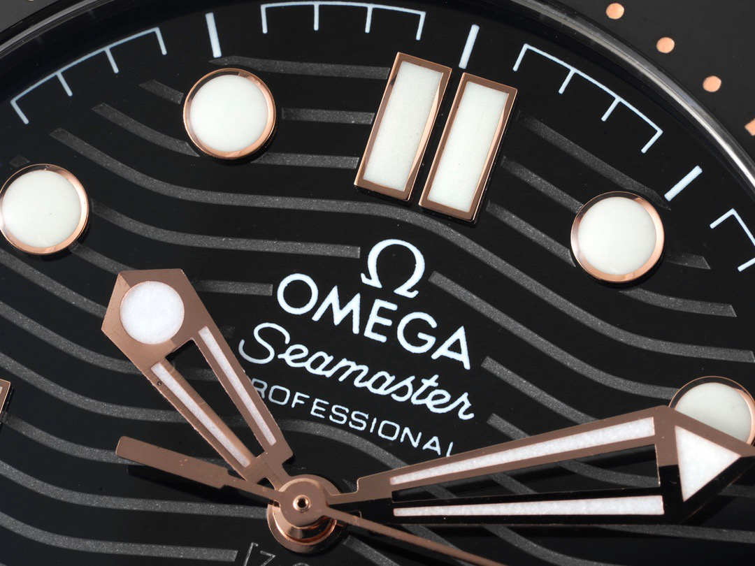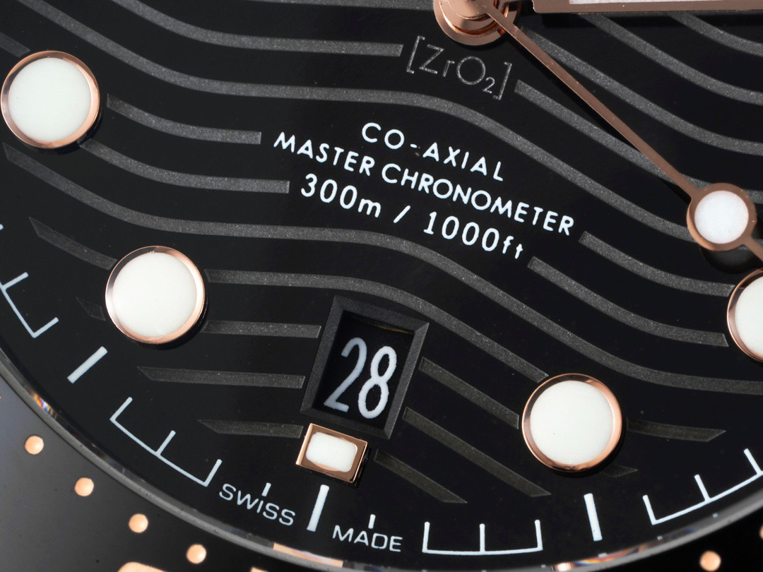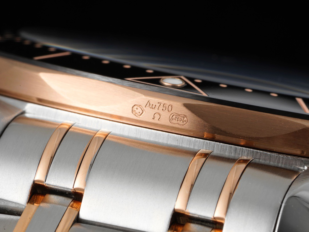 VS欧米茄海马300M间金,选对版本很重要。VS版本和正品在12点位外圈口带有贵金属印记:AU750 、狗头标 、天平秤 、欧logo,可以看是否有这个印记区分出是VS/市面版本。买家、卖家都不用担心打脸的版本