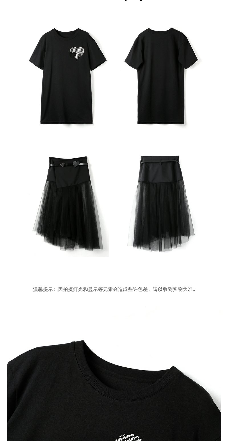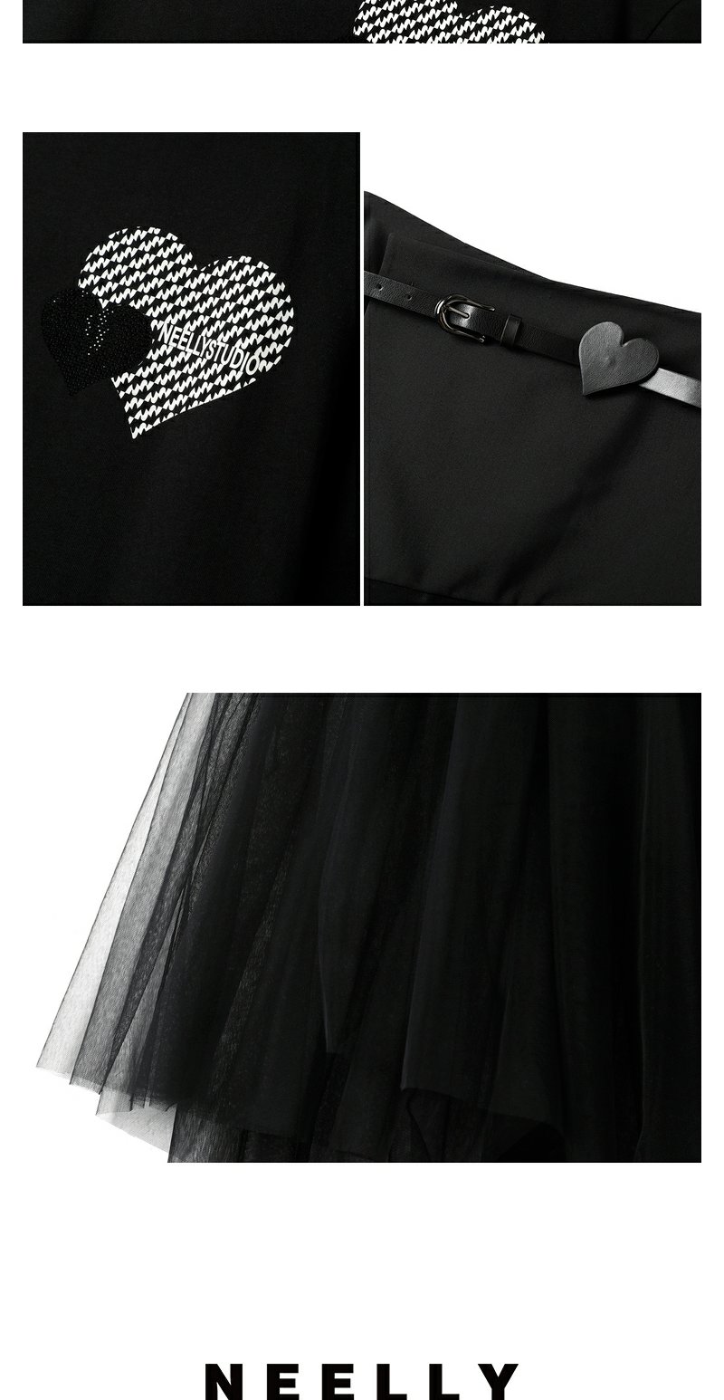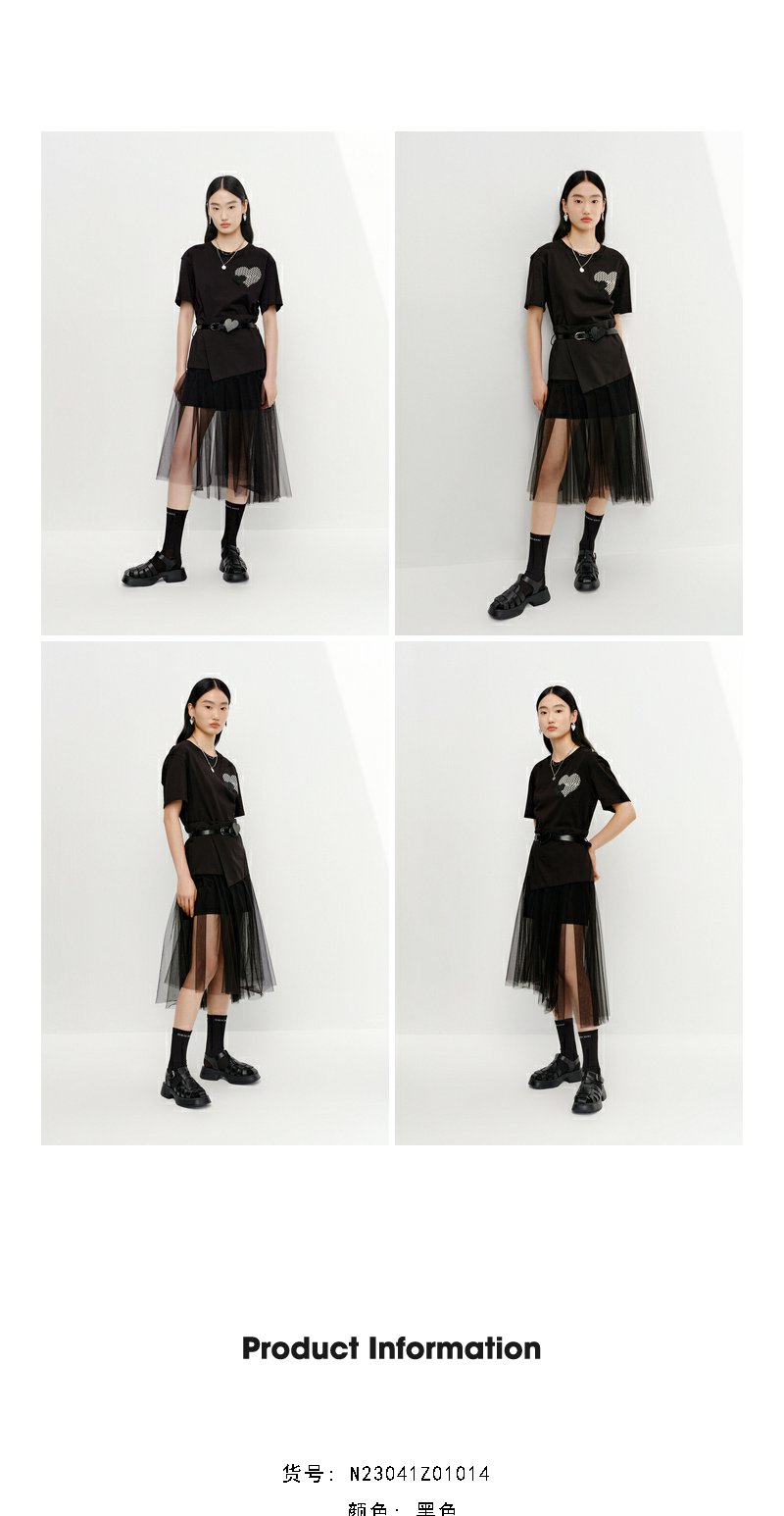 NEELLY纳俪夏季新款黑色圆领T恤女时尚套装不规则纱裙百搭显瘦N23041Z01014