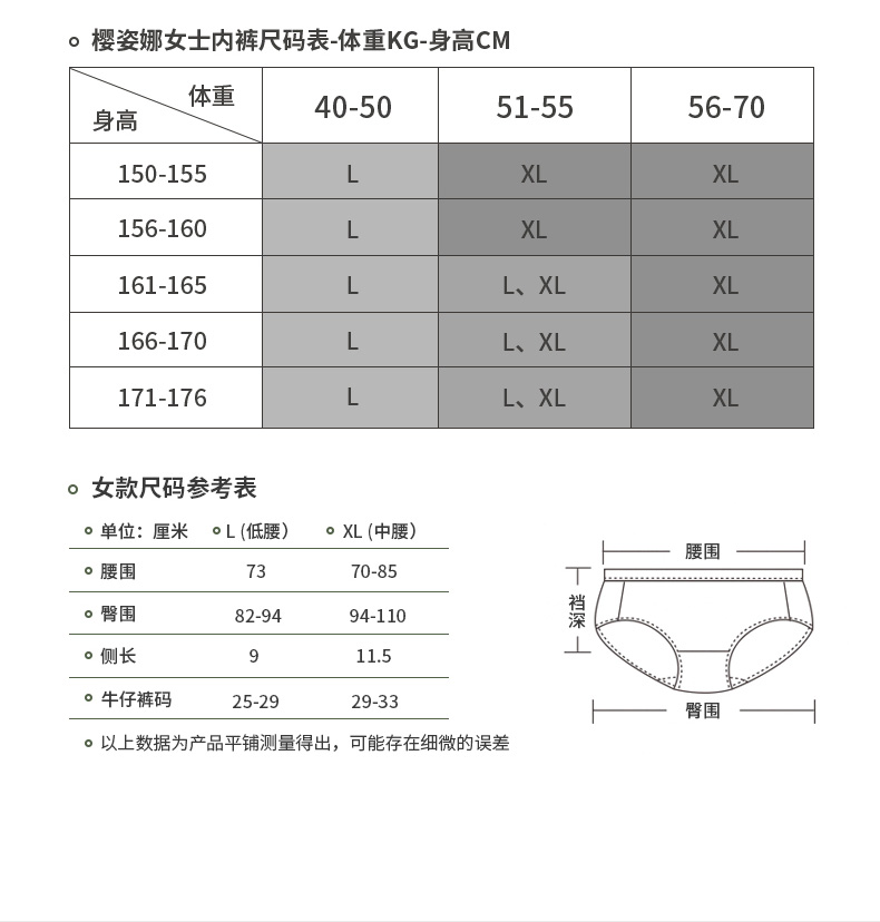 品名:樱姿娜无痕冰丝面膜内裤6条装 规格:低腰L码-80-110斤、中腰XL码-100-140斤 包装:盒装 快递:圆通/德邦 发货时效::48小时 运费模板:国内包邮 发货地:广东汕头 售后标准:内裤是特殊产品,非质量问题不退换(退回需未拆封且未使用)