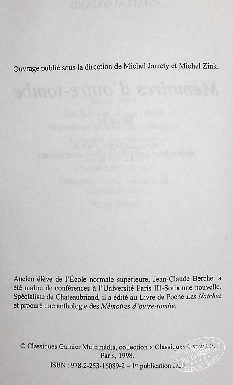 【中商原版】夏多布里昂 墓畔回忆录 卷3 Memoires doutre tombe Tome 3 法文原版 Francois Rene de Chateaubriand