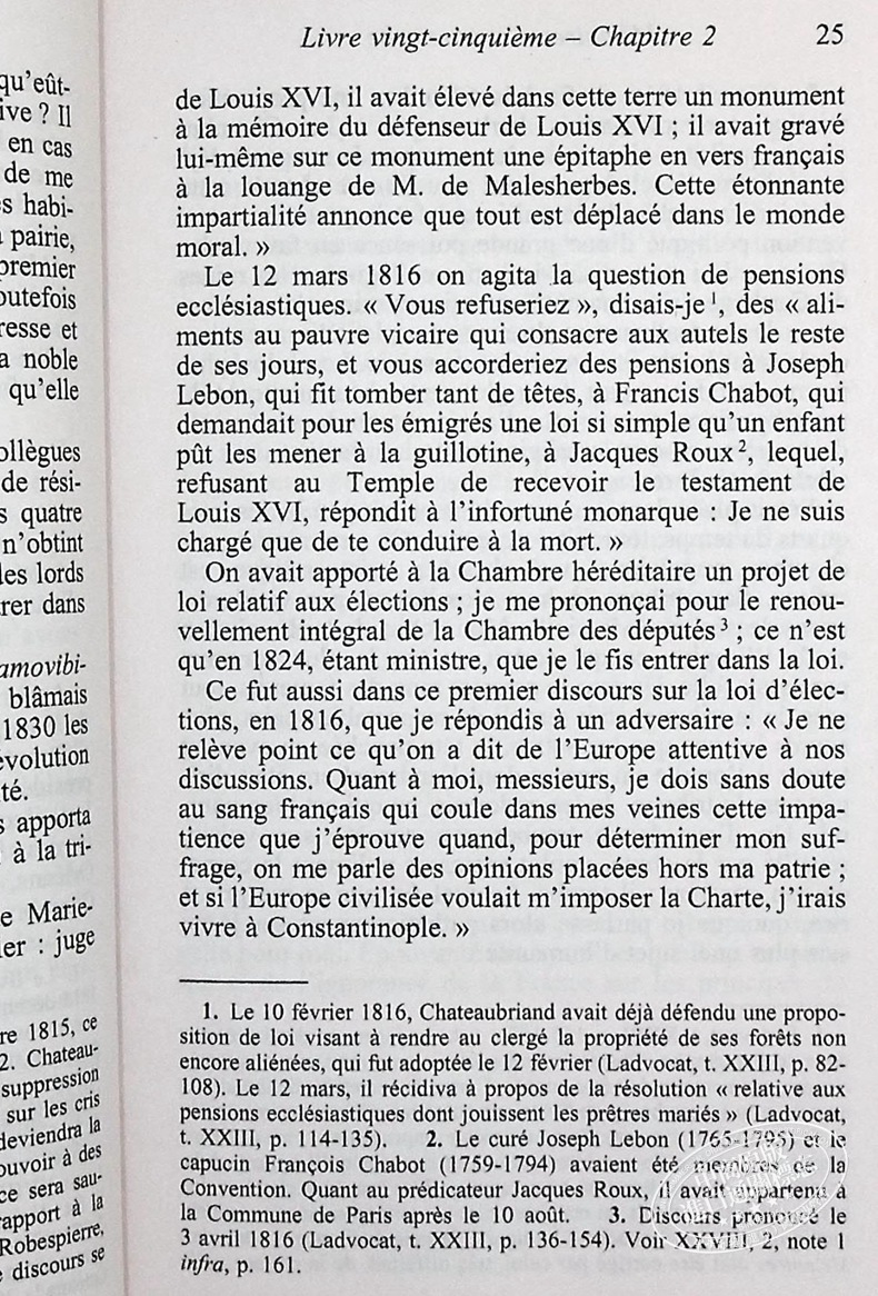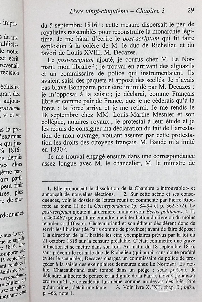 这第三卷以复辟为开端,将我们引向1830年的革命:在旅行者和作家的生涯之后,政治家的时代已经到来。1815年被任命为法国贵族,夏多布里昂成为驻欧洲多个国家首都的大使。但是,当谈到唤起权力的真正行使时,这位回忆录作家仿佛被打懵了,对这几个月的政府保持沉默,突然间无力将自己完全代表为历史中的一个演员。无论如何,作者把他对一个在我们眼前逐渐解体的复辟王朝的描绘支离破碎,并从一开始就以失落的语气呈现出来:"从波拿巴和帝国回落到他们之后的东西,就是从现实落入虚无,从山巅落入深渊。"但就是这部分《墓畔回忆录 》的写作时间较晚,在它完成时,拿破仑神话的浪潮正席卷法国,在1840年随着皇帝的骨灰回归而达到高峰:民族英雄的巨大阴影让君主制的太阳黯然失色。