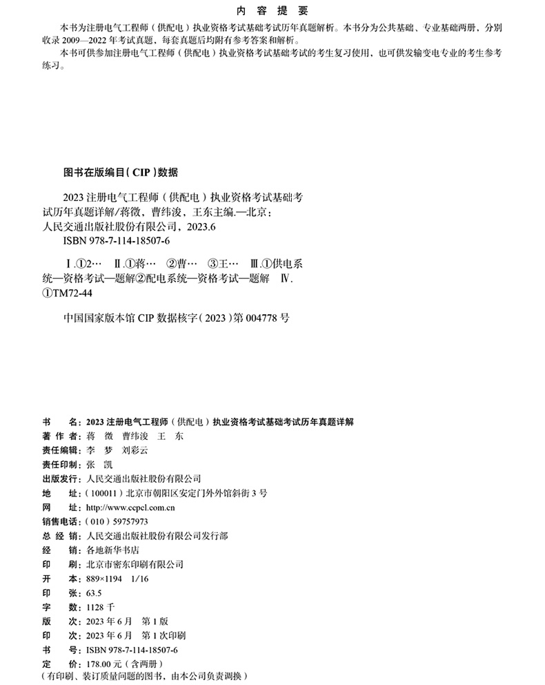 书名:2023注册电气工程师(供配电)执业资格考试基础考试历年真题详解
