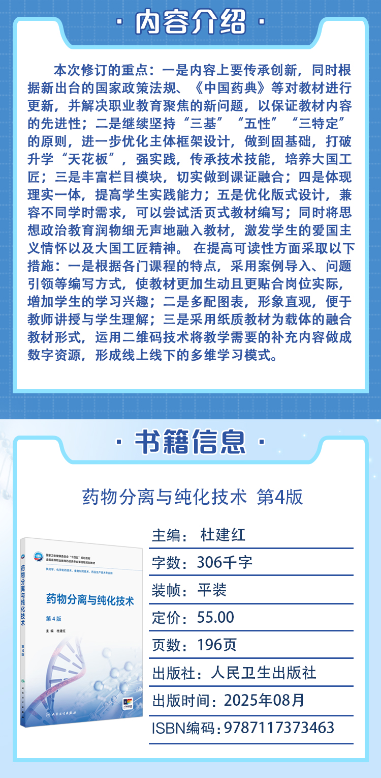 本次修订的重点:一是内容上要传承创新,同时根据新出台的国家政策法规、《中国药典》等对教材进行更新,并解决职业教育聚焦的新问题,以保证教材内容的先进性;二是继续坚持“三基”“五性”“三特定”的原则,进一步优化主体框架设计,做到固基础,打破升学“天花板”,强实践,传承技术技能,培养大国工匠;三是丰富栏目模块,切实做到课证融合;四是体现理实一体,提高学生实践能力;五是优化版式设计,兼容不同学时需求,可以尝试活页式教材编写;同时将思想政治教育润物细无声地融入教材,激发学生的爱国主义情怀以及大国工匠精神。 在提高可读性方面采取以下措施:一是根据各门课程的特点,采用案例导入、问题引领等编写方式,使教材更加生动且更贴合岗位实际,增加学生的学习兴趣;二是多配图表,形象直观,便于教师讲授与学生理解;三是采用纸质教材为载体的融合教材形式,运用二维码技术将教学需要的补充内容做成数字资源,形成线上线下的多维学习模式。