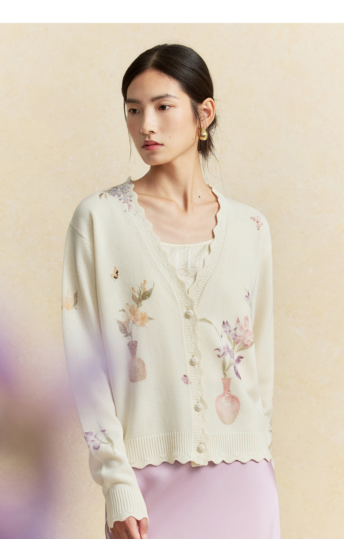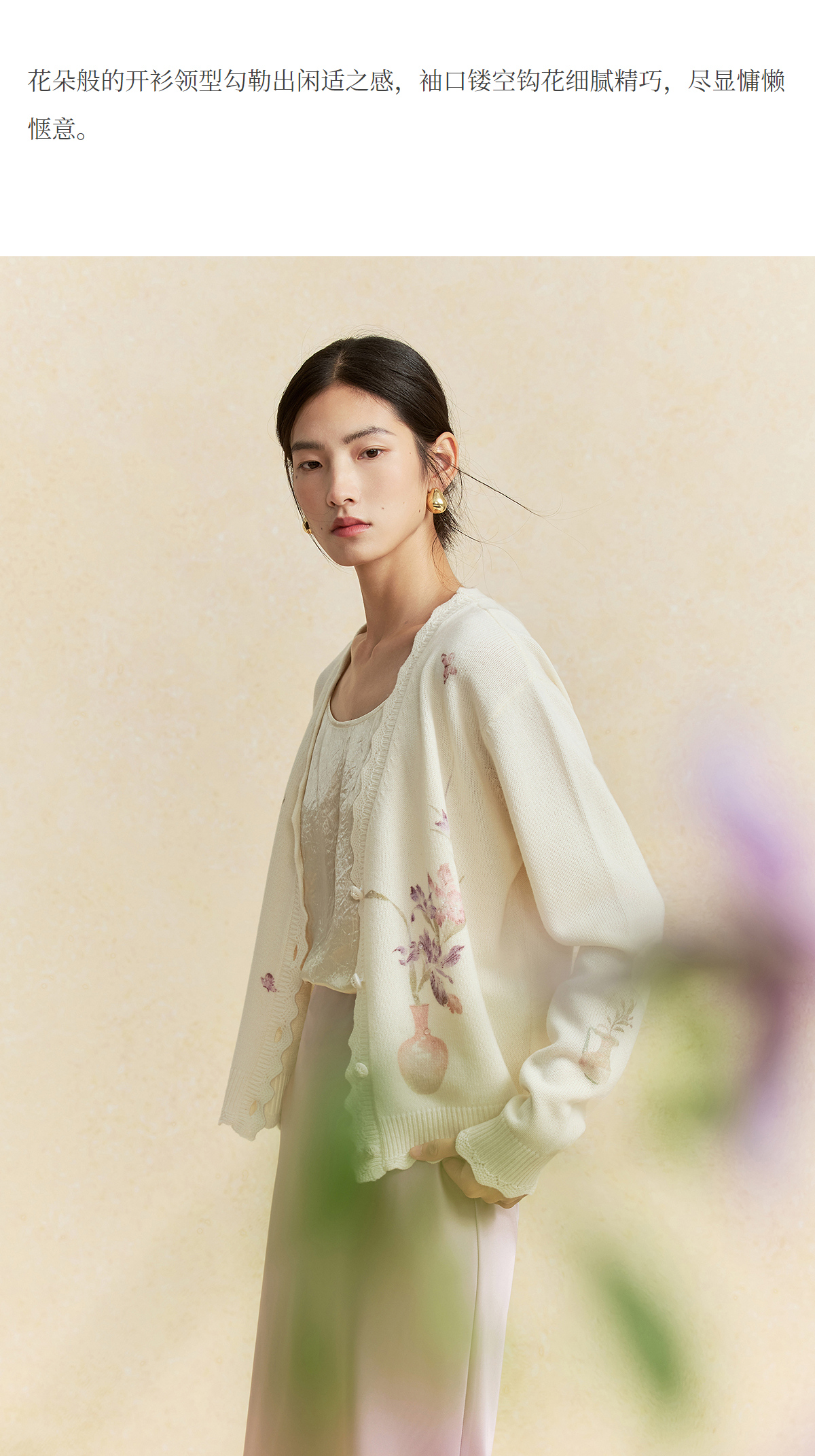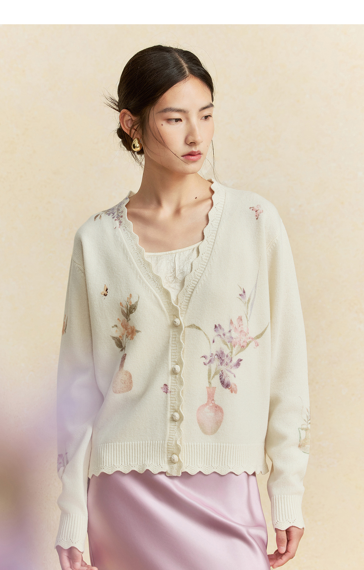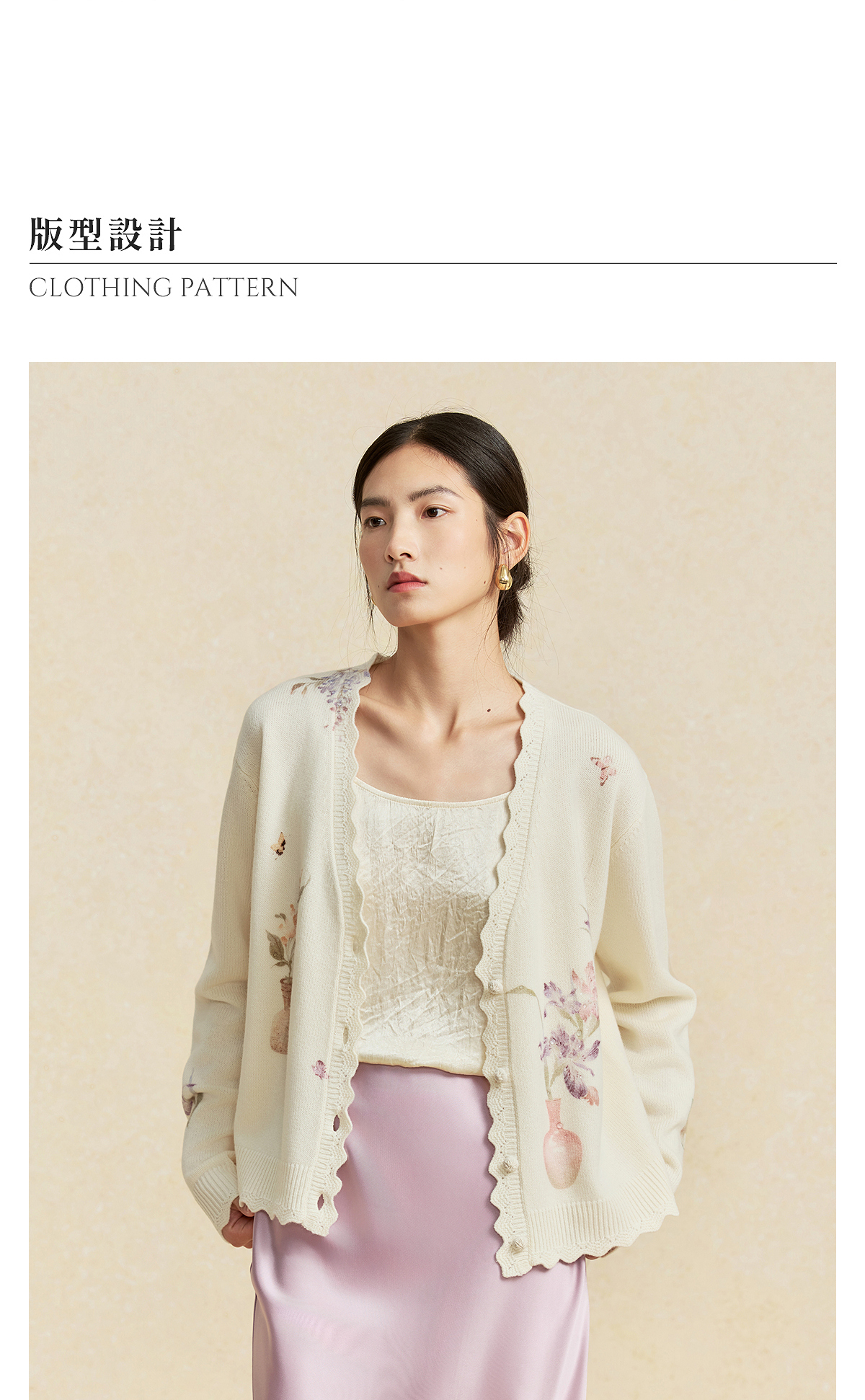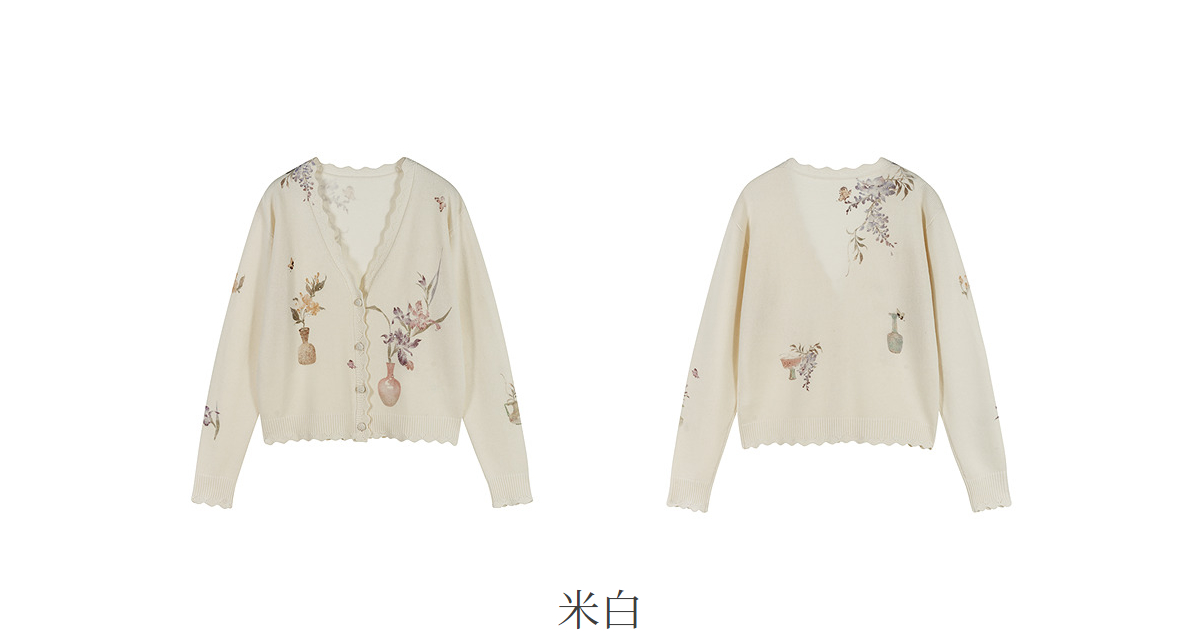 【林栖设计小店】宋瓷雅画|绵羊毛印花米白花边新中式2026春新款毛织外套1961050