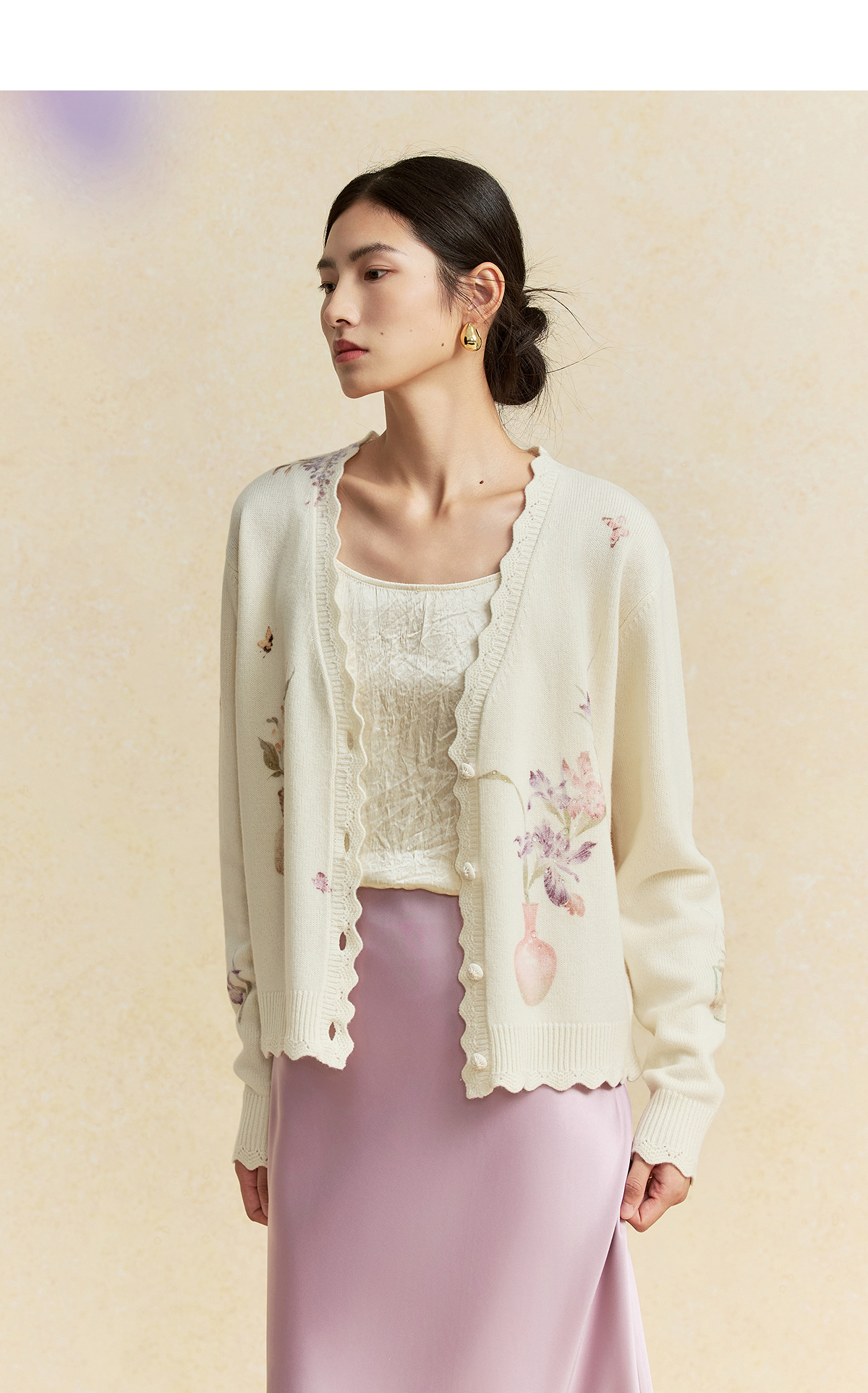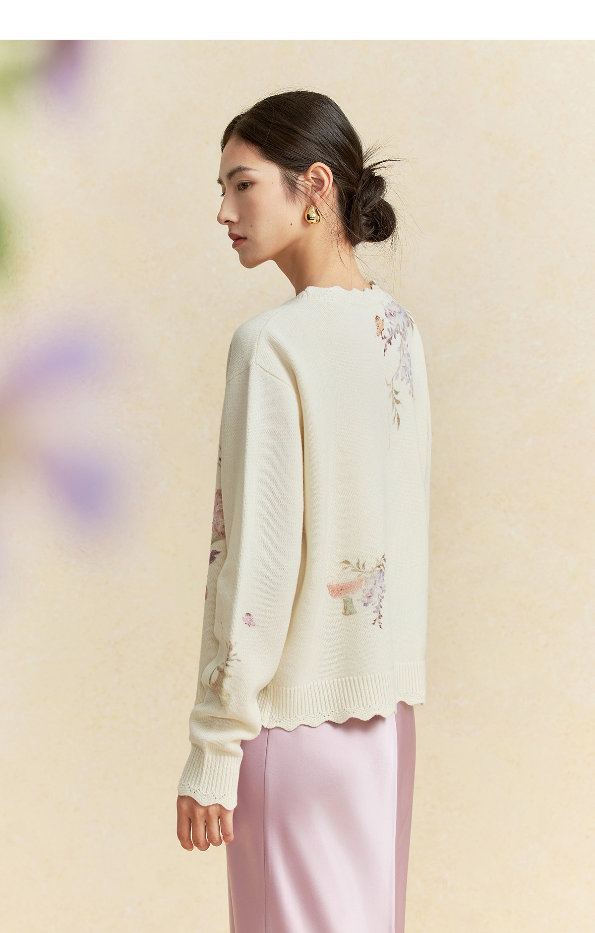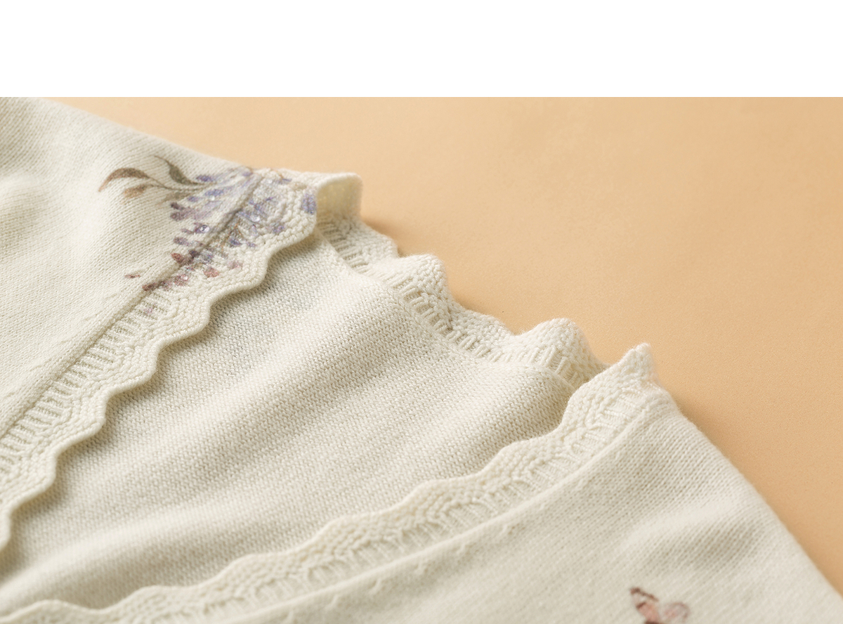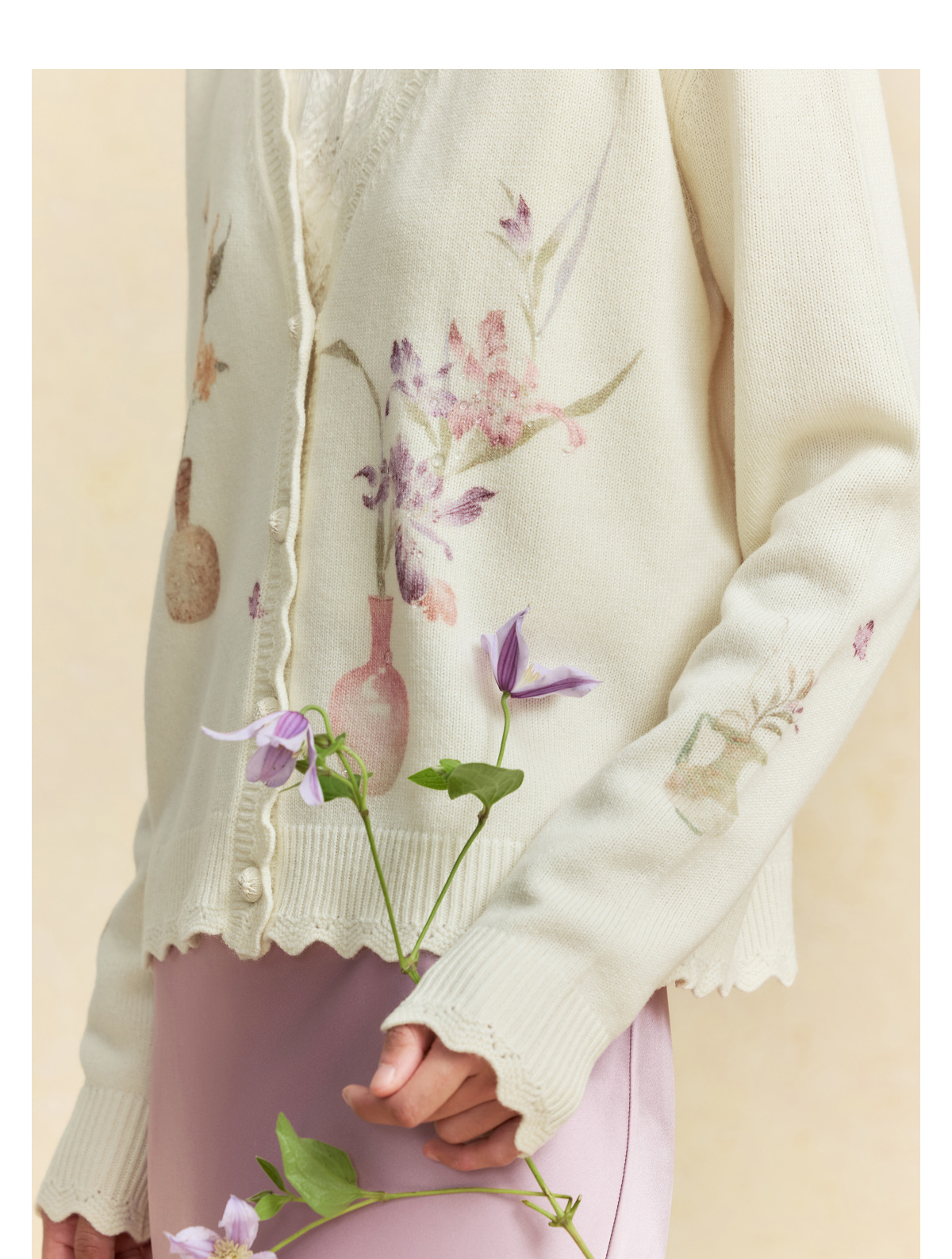 【林栖设计小店】宋瓷雅画|绵羊毛印花米白花边新中式2026春新款毛织外套1961050