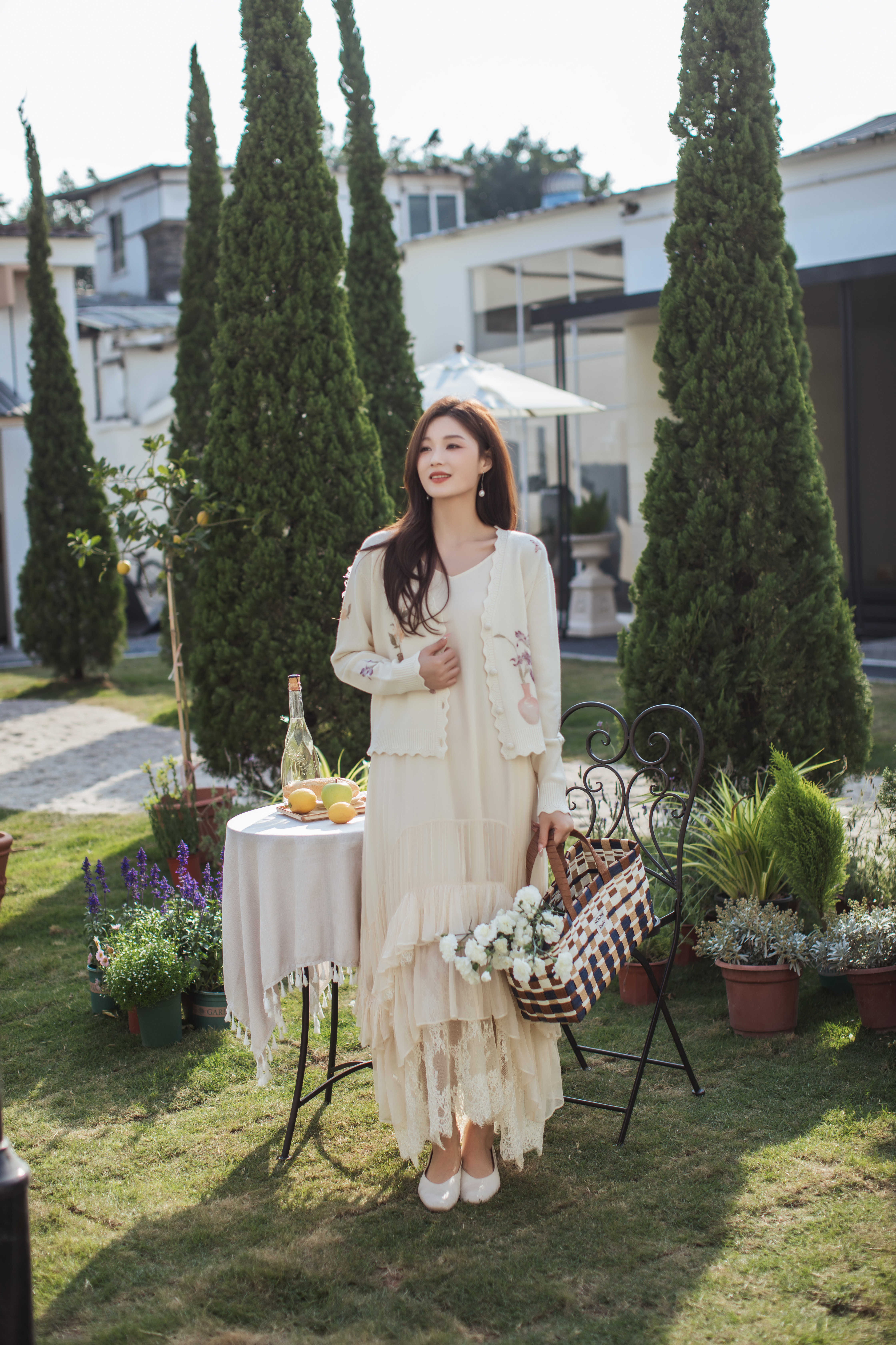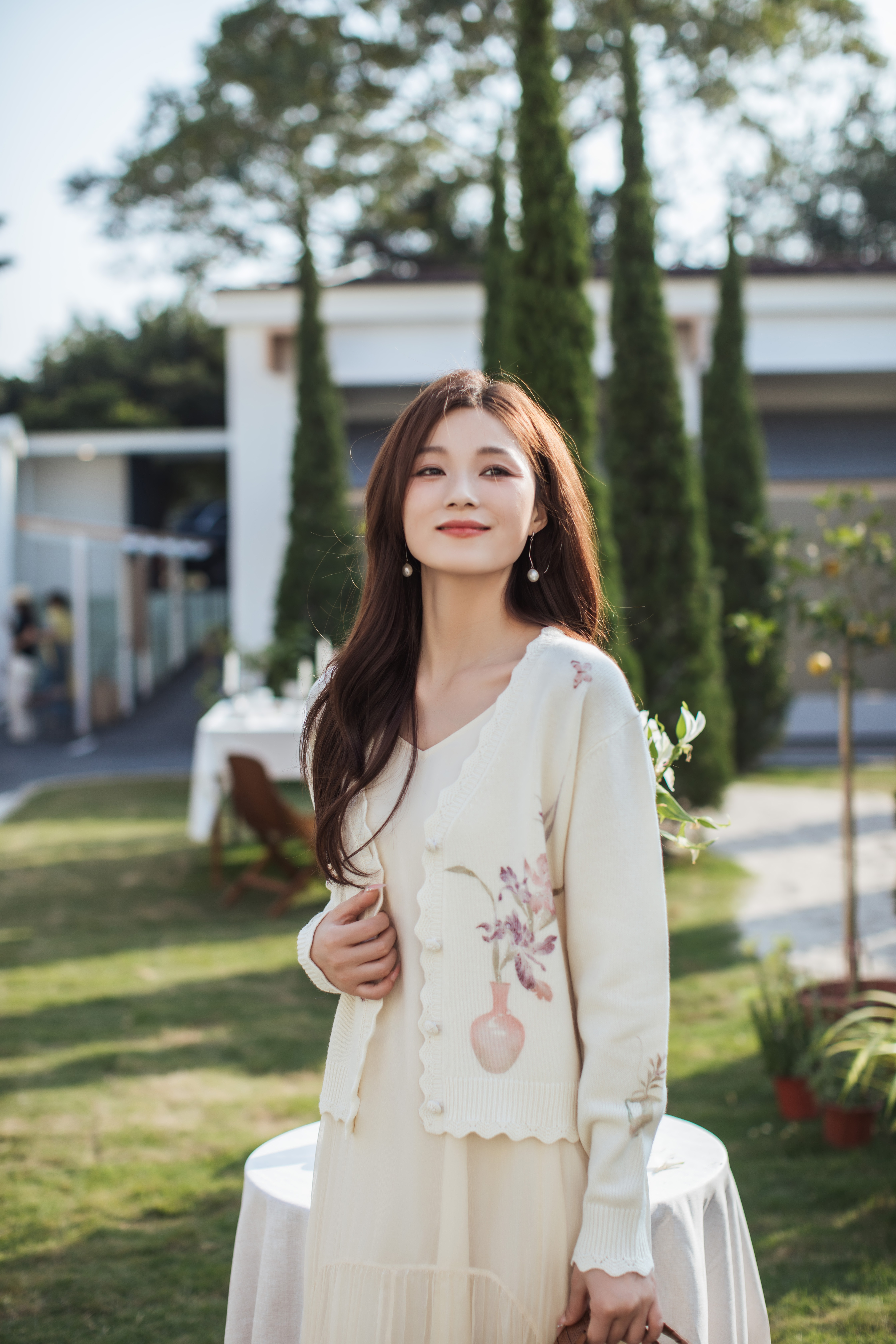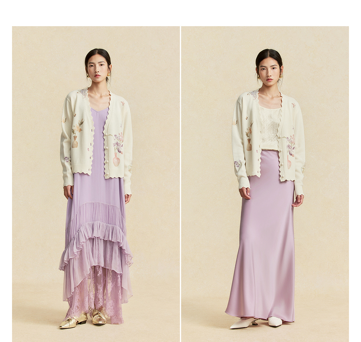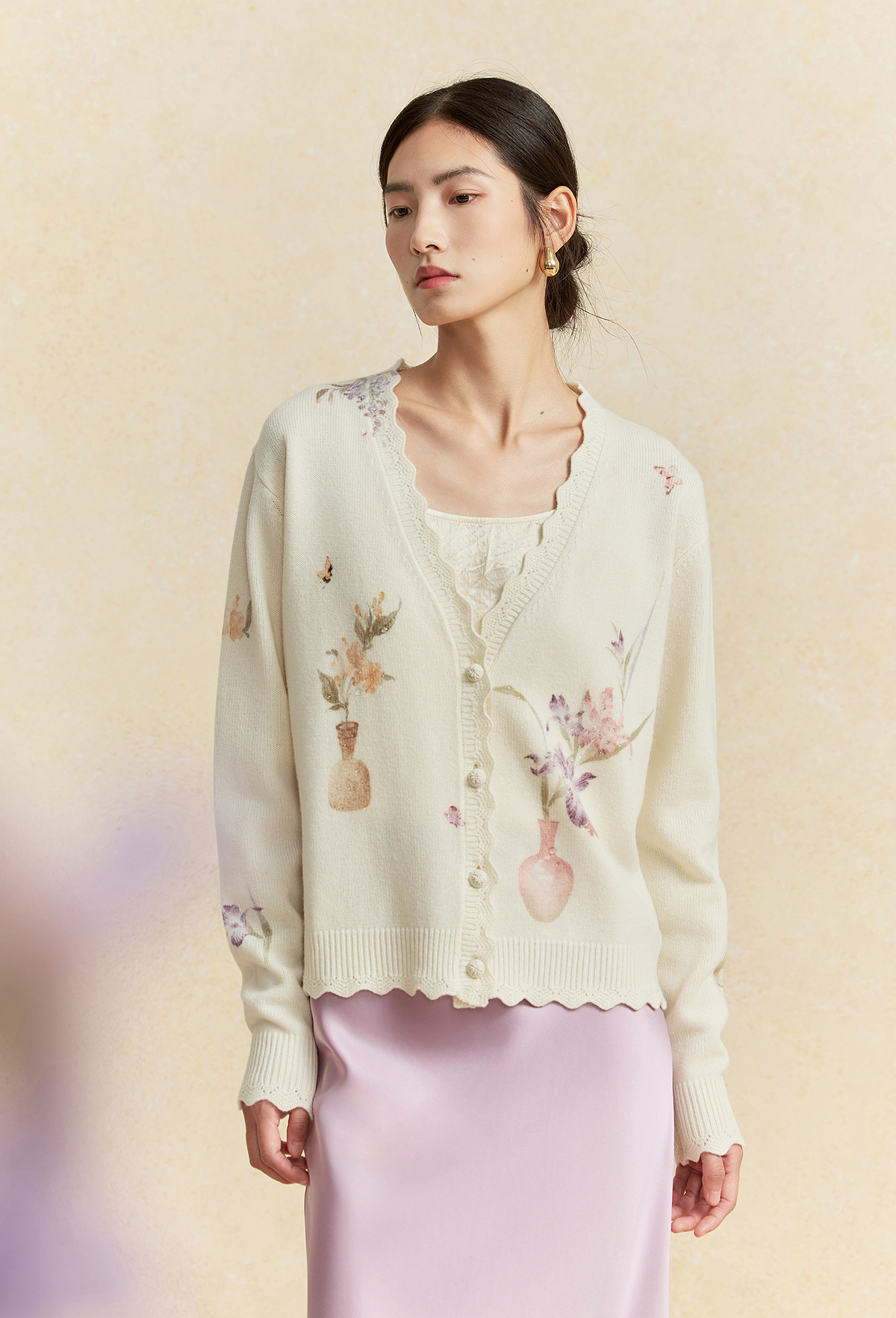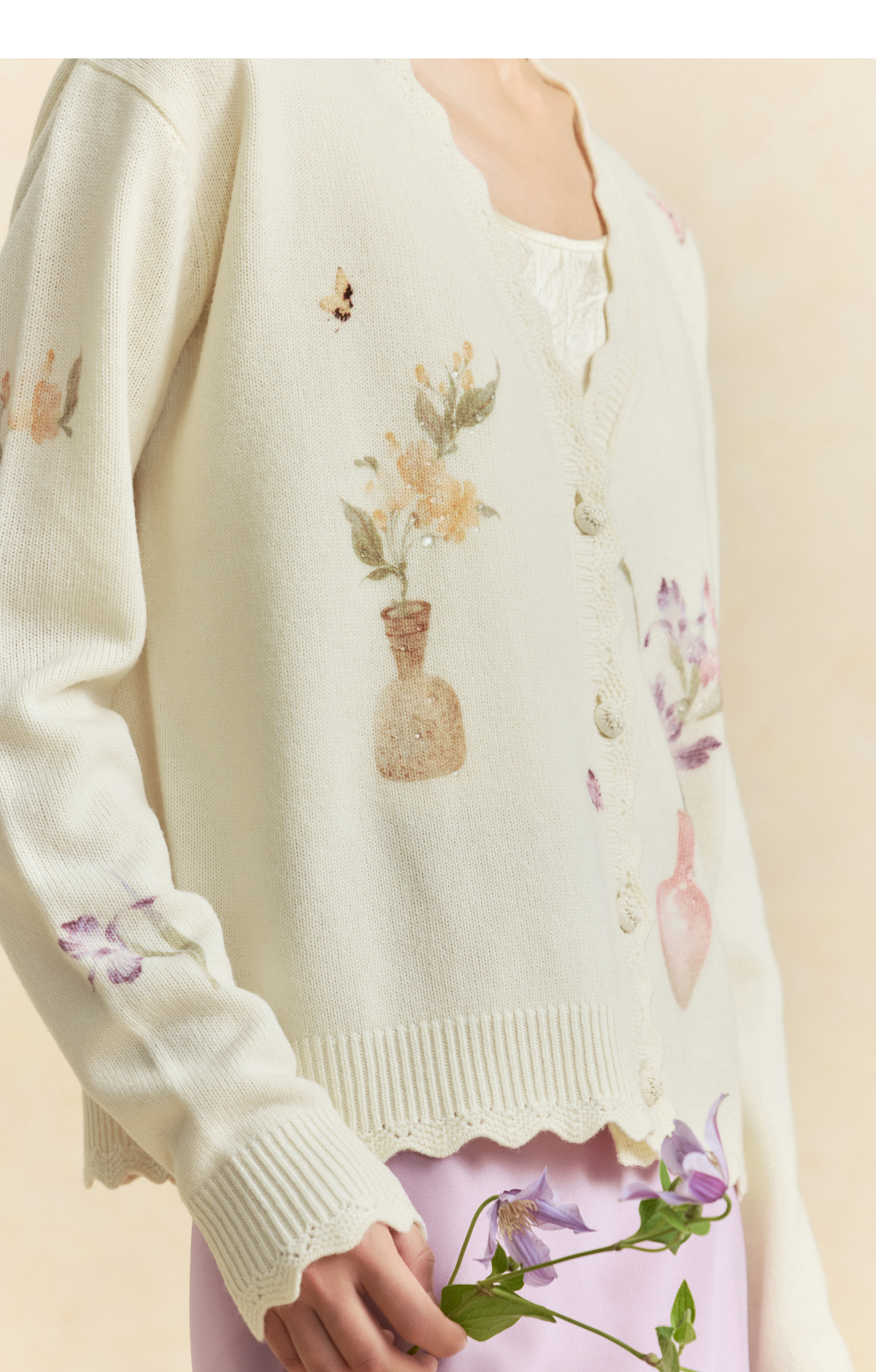 【林栖设计小店】宋瓷雅画|绵羊毛印花米白花边新中式2026春新款毛织外套1961050