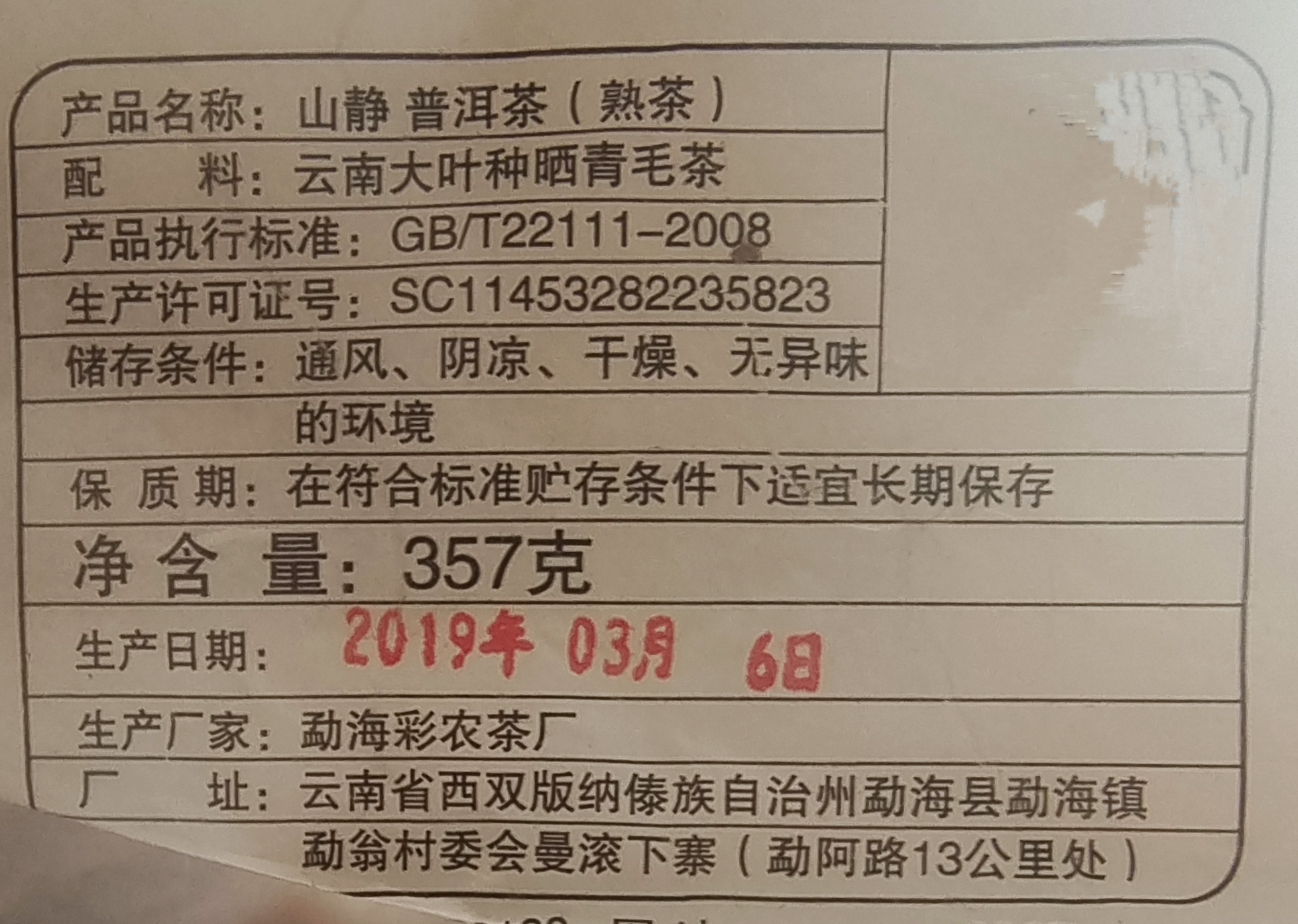 彩农茶|山静2019年熟饼