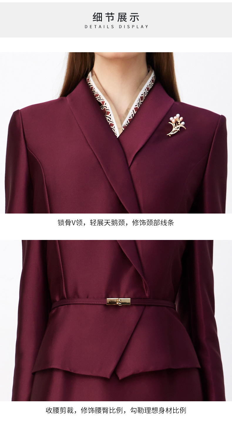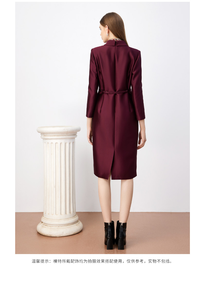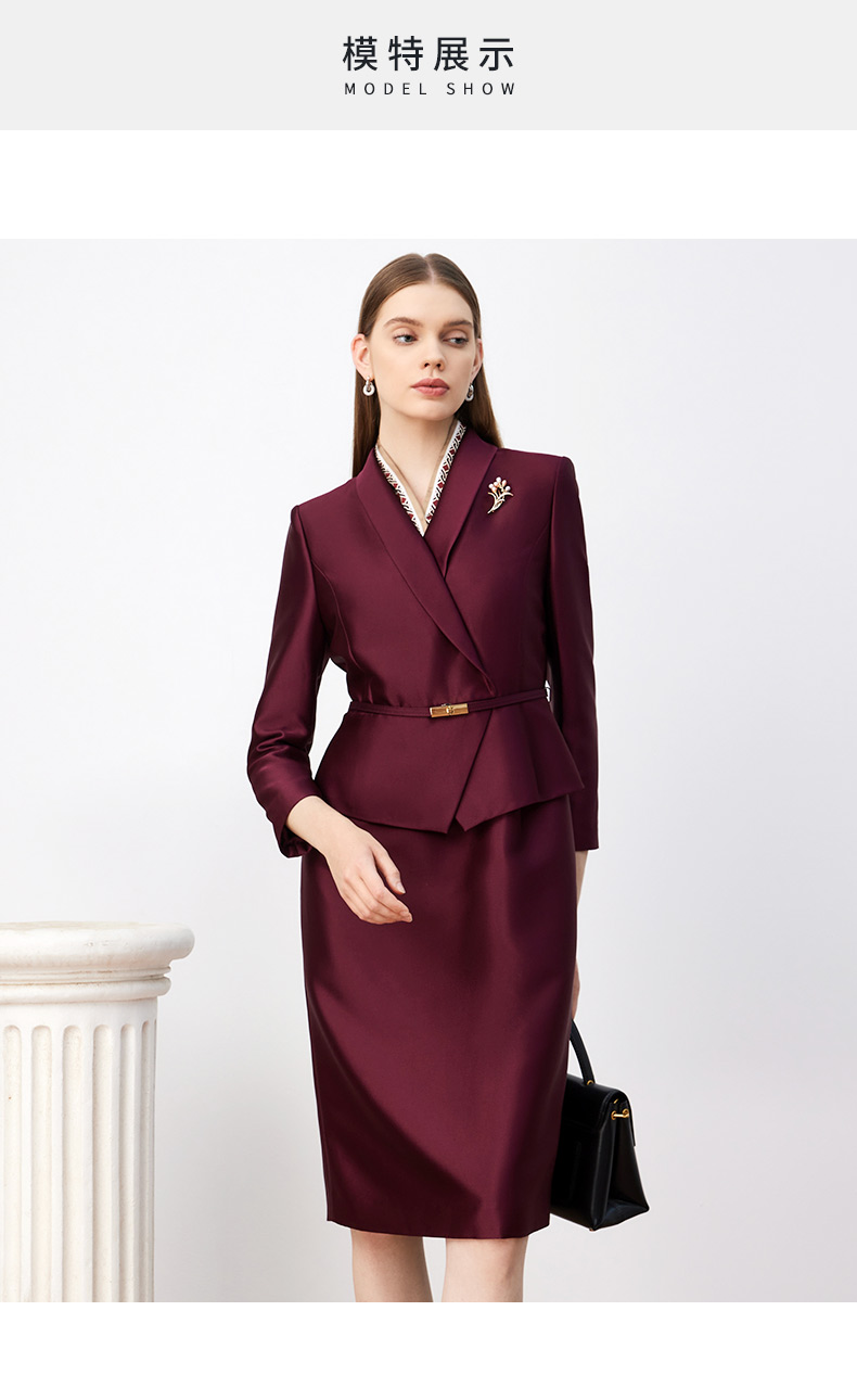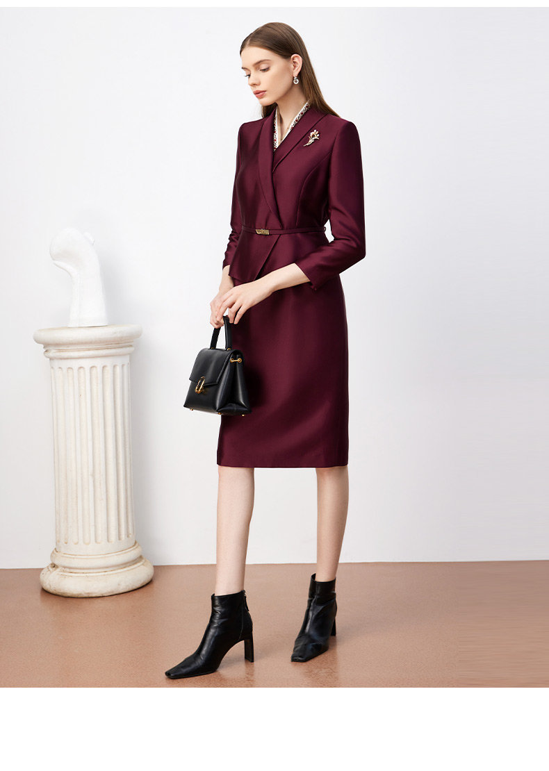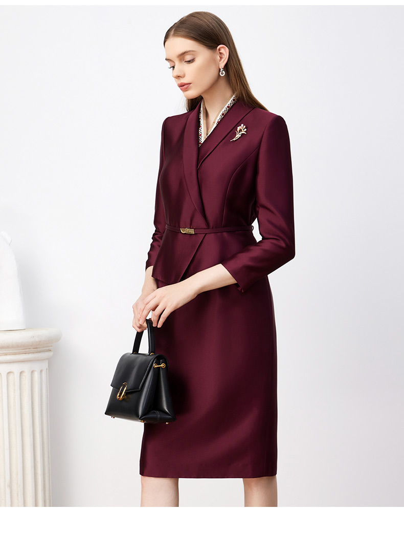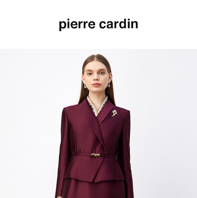 皮尔卡丹女装连衣裙酒红色缎面高贵醋酸假两件西服裙P3308E3983T0
