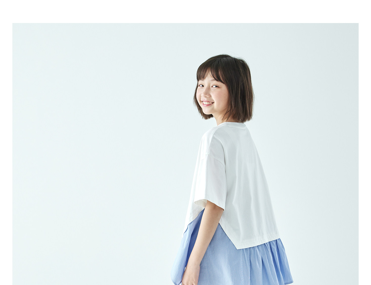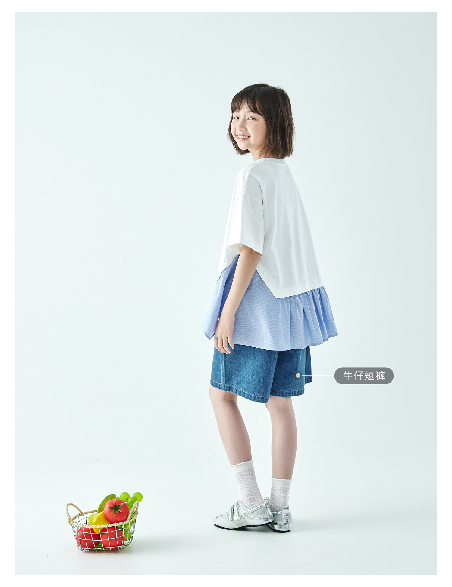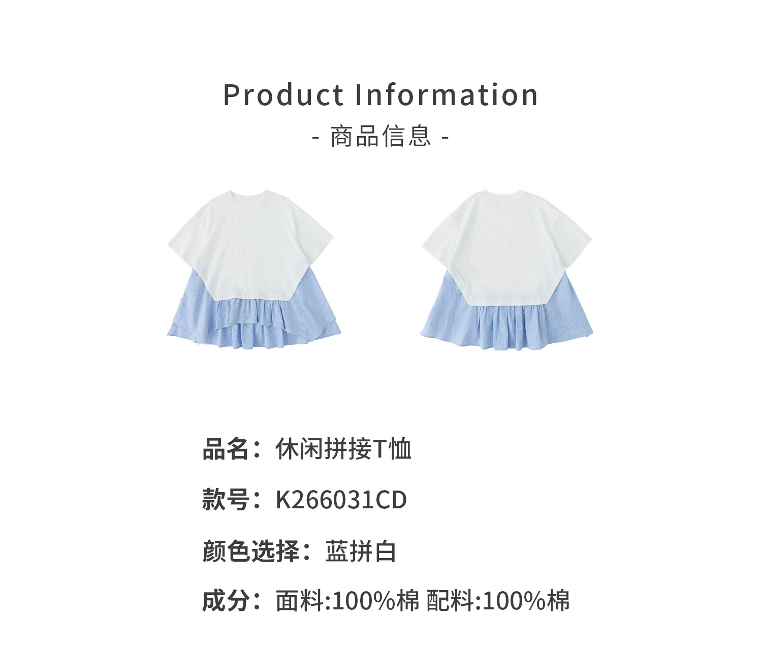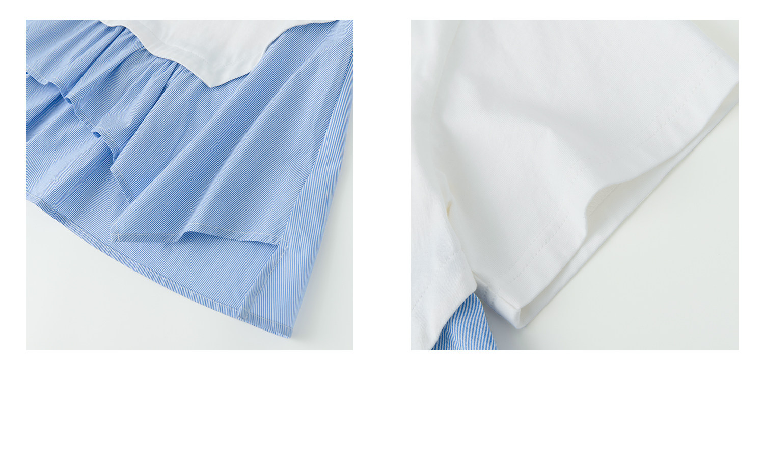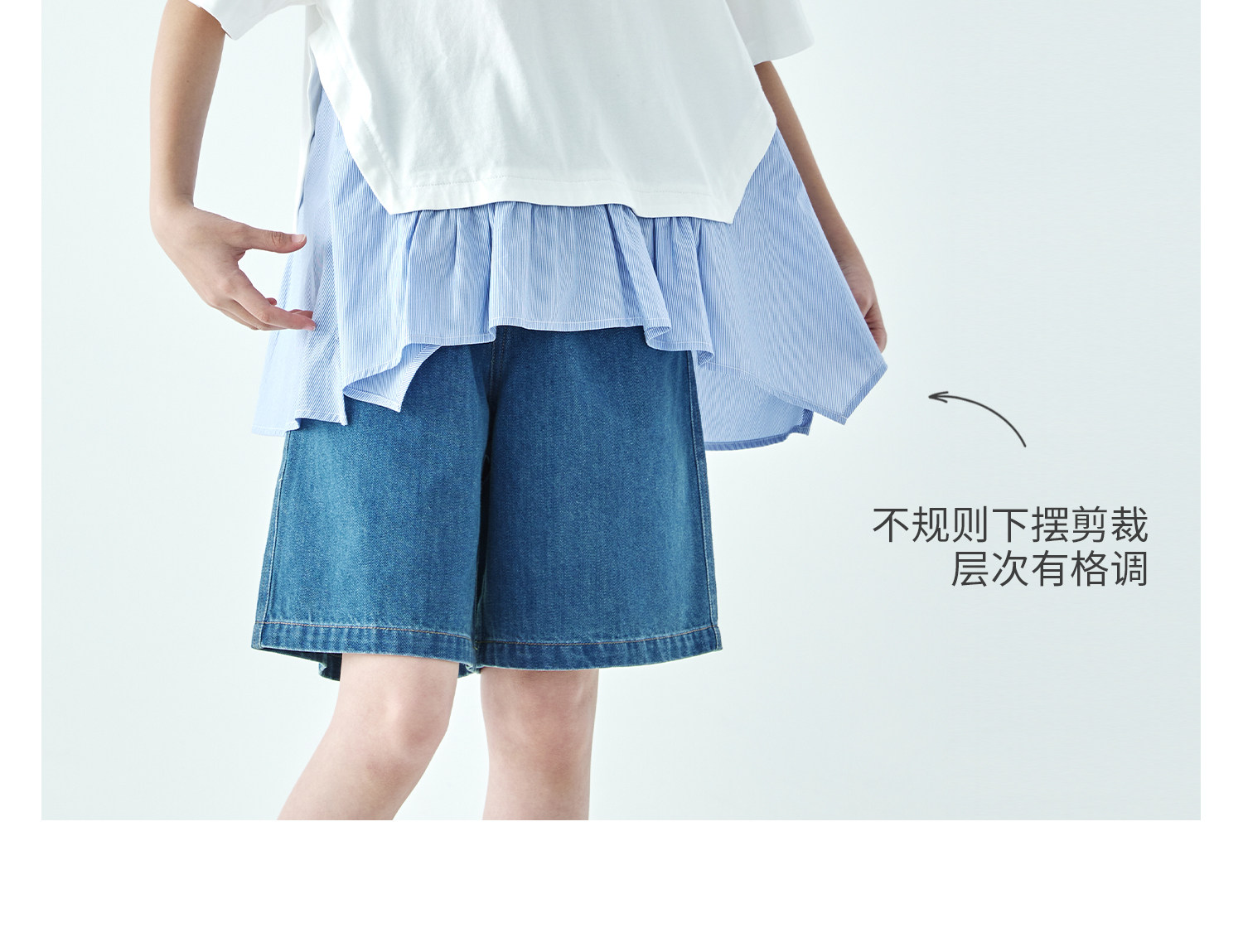 棵初26年夏季新款中大女童不规则拼接休闲短袖纯棉条纹假两件T恤