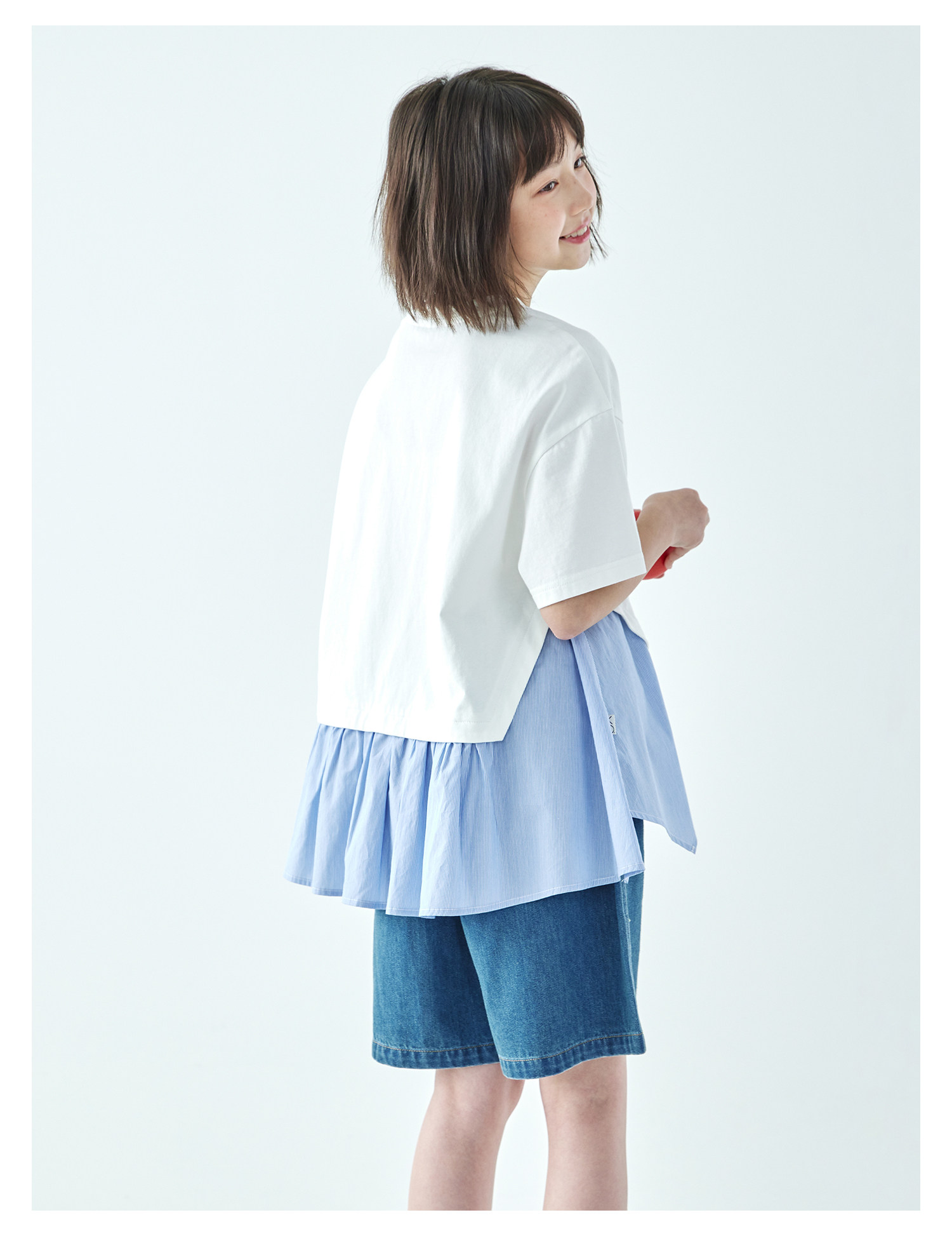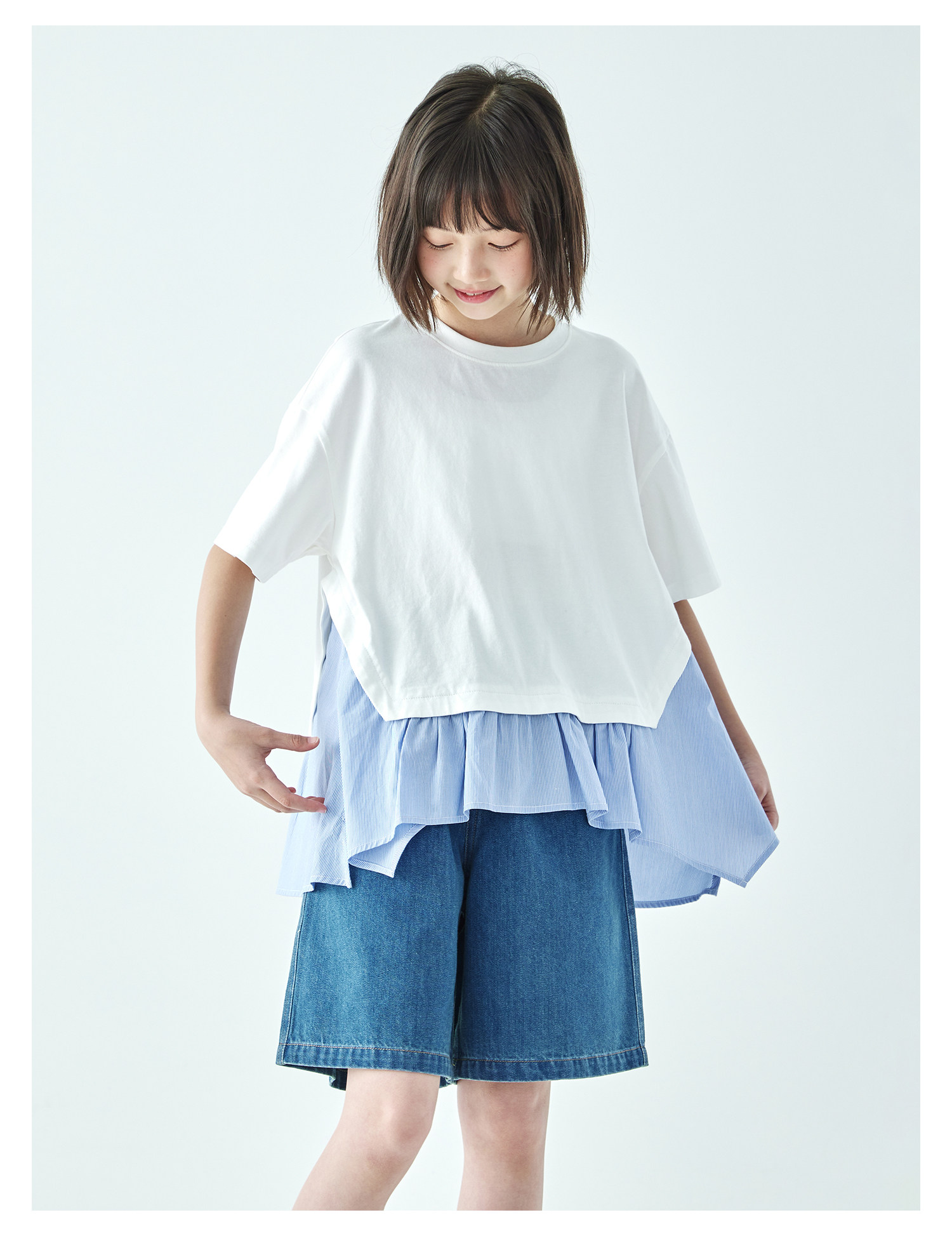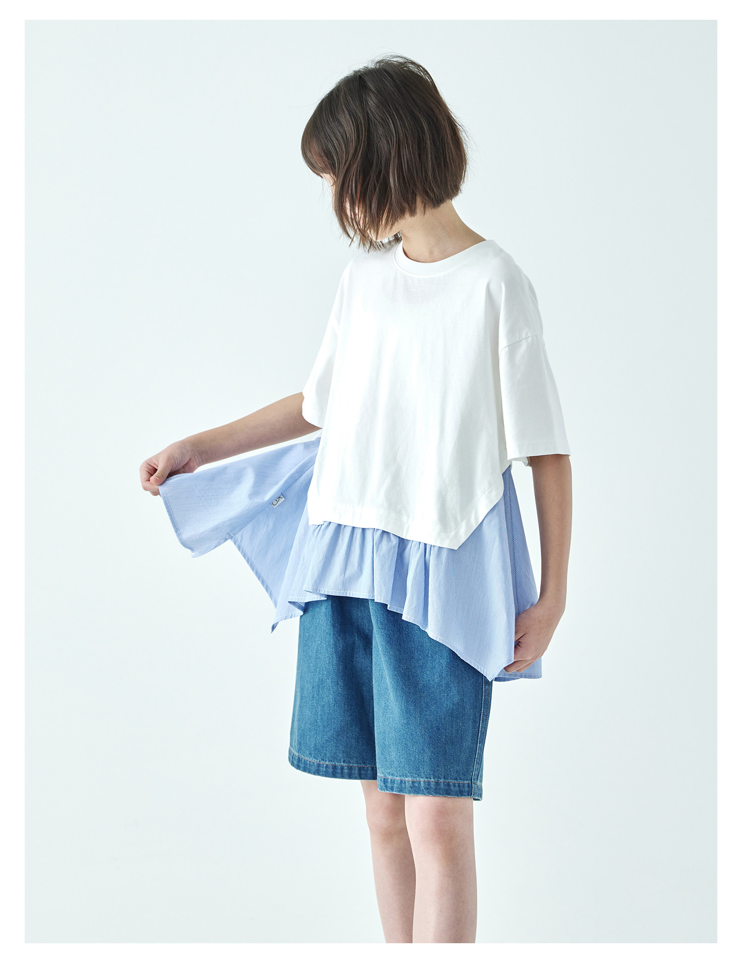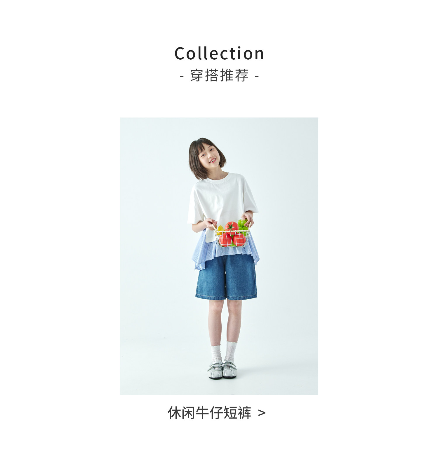 棵初26年夏季新款中大女童不规则拼接休闲短袖纯棉条纹假两件T恤