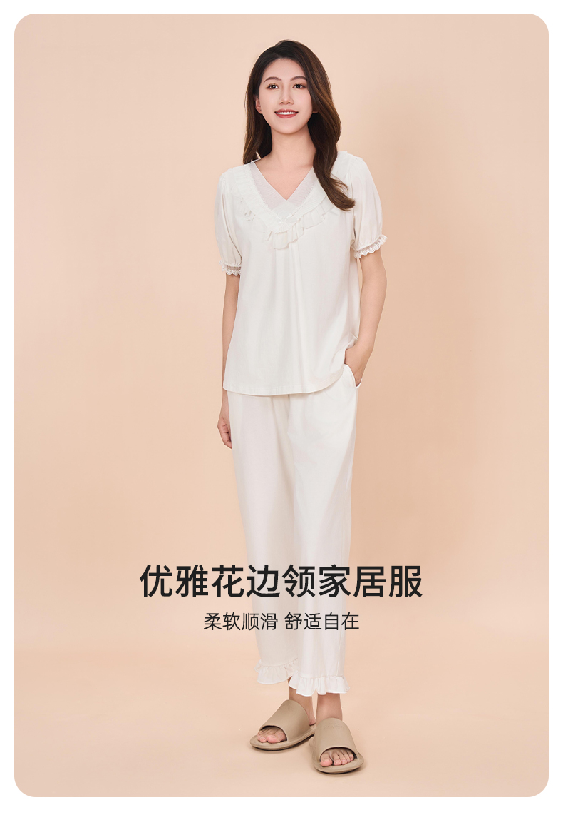 【商场同款】熳洁儿 女士家居服短袖长裤套装棉莱卡V领公主风24203231