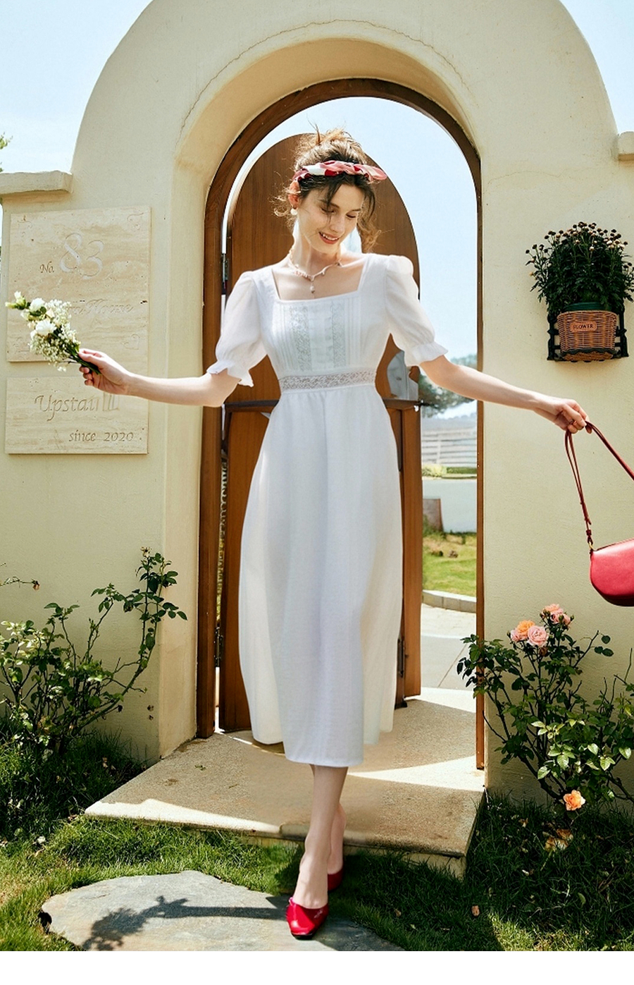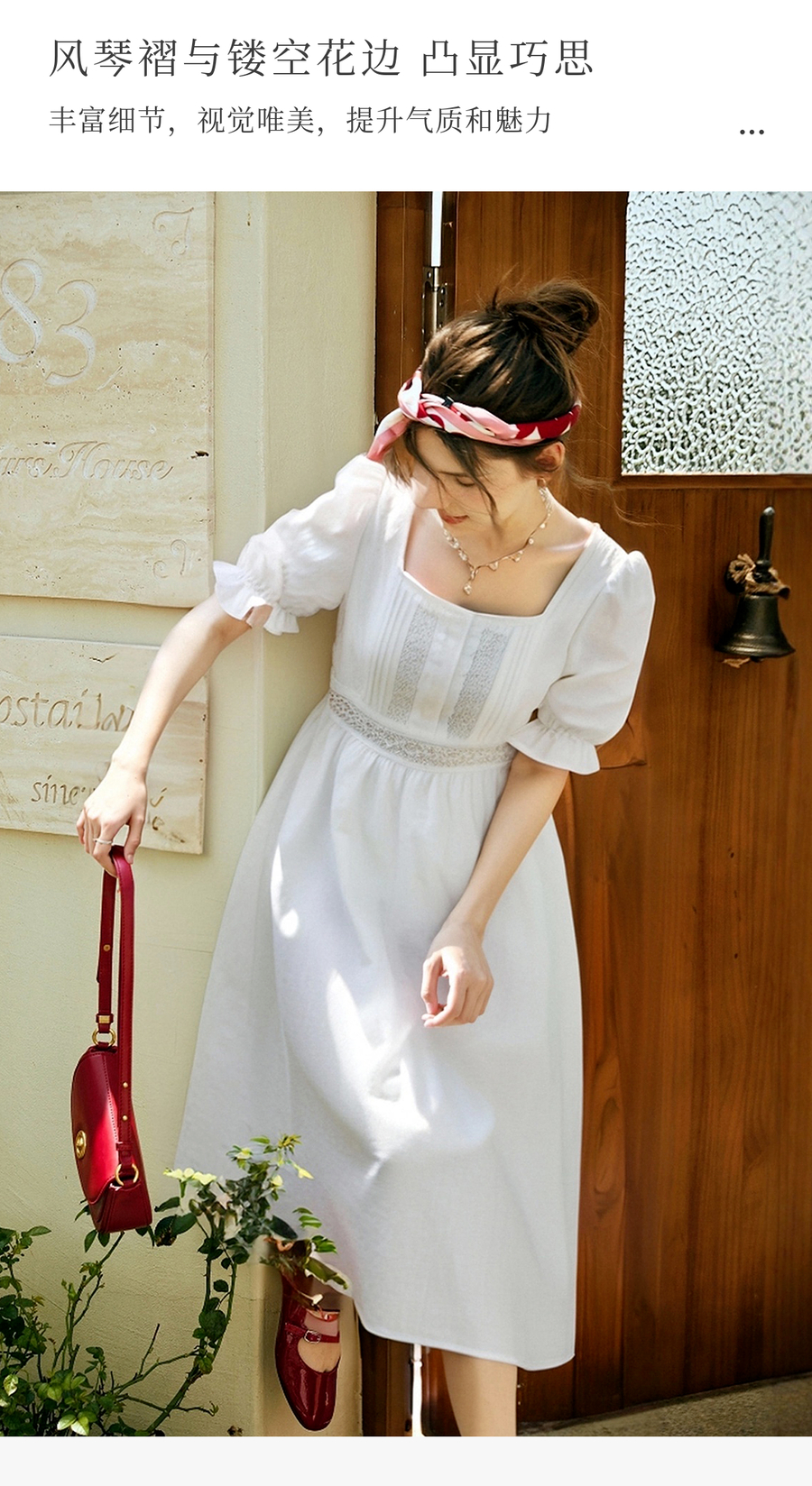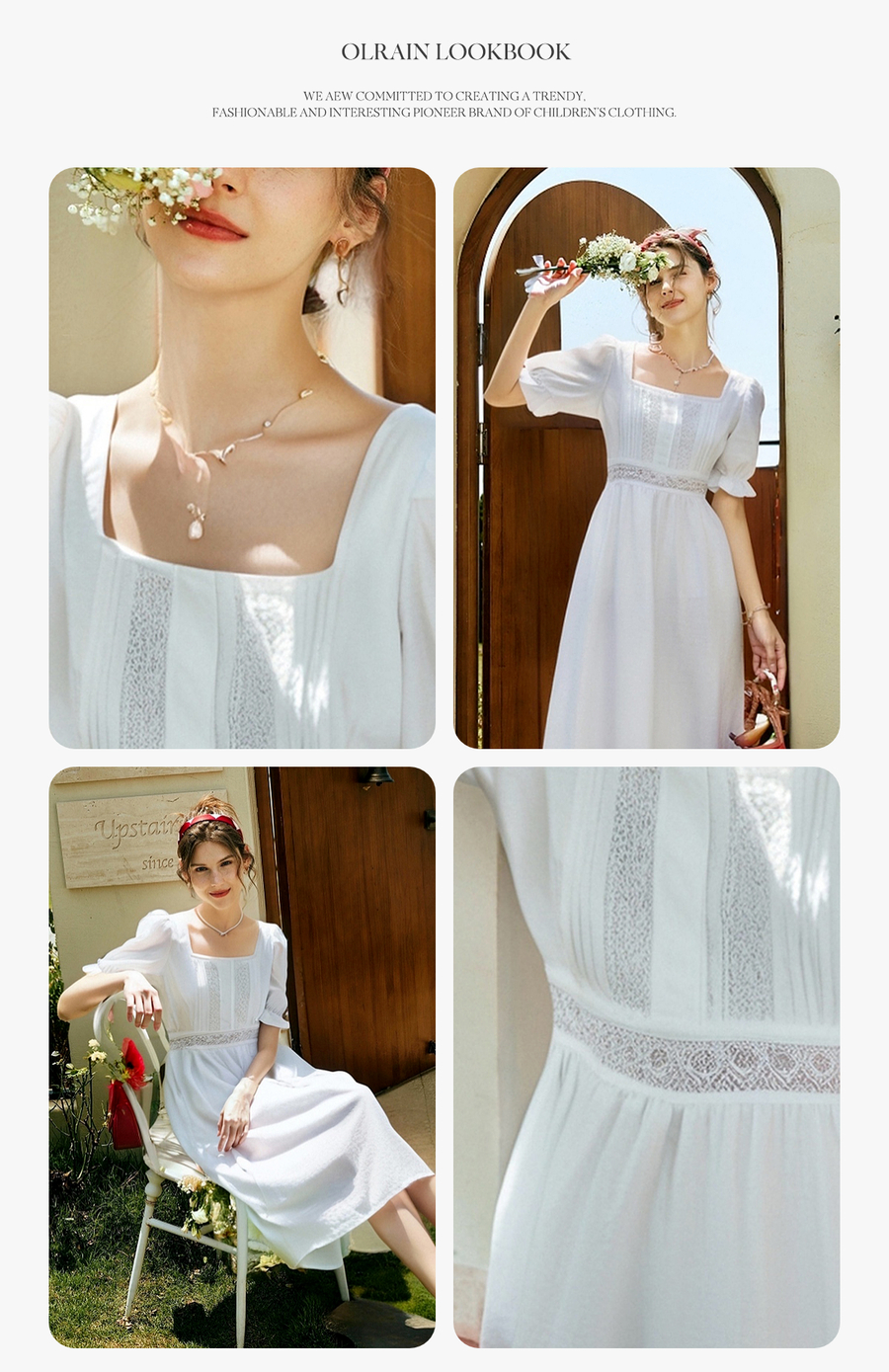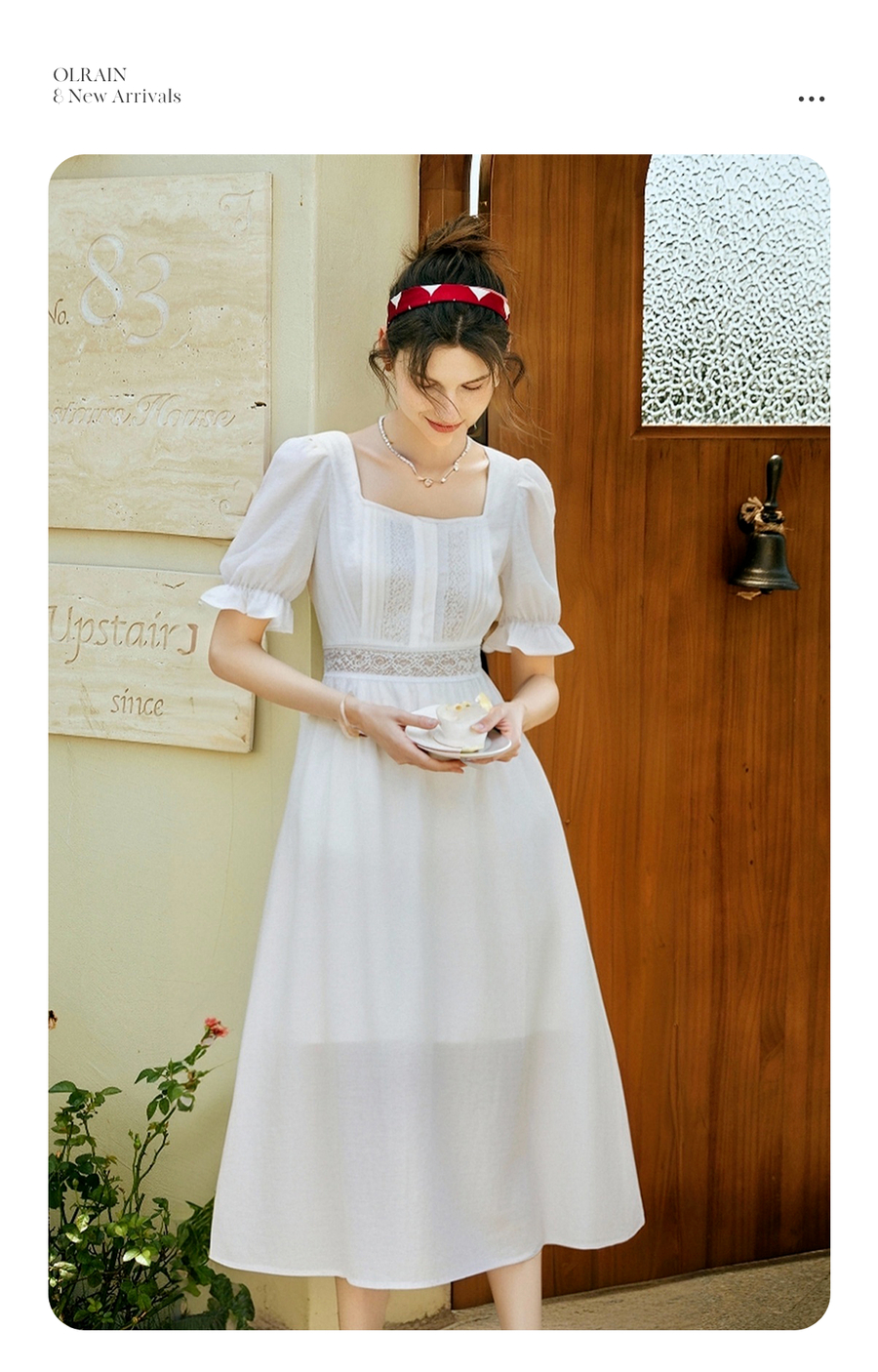 OLrain欧芮儿法式田园米白色短袖方领连衣裙女夏季2025新款小白裙