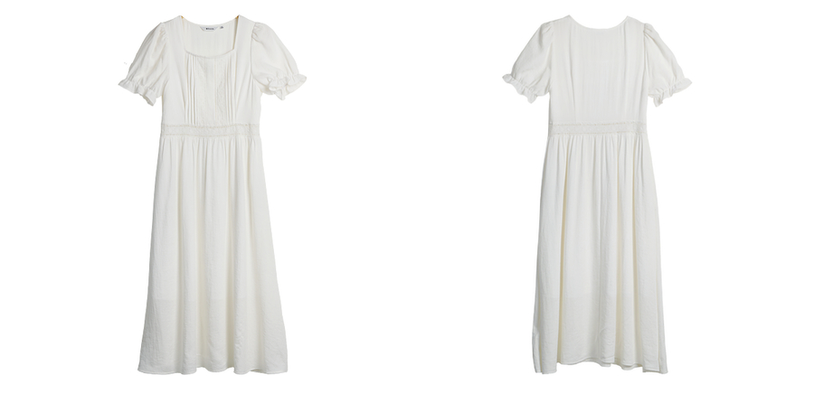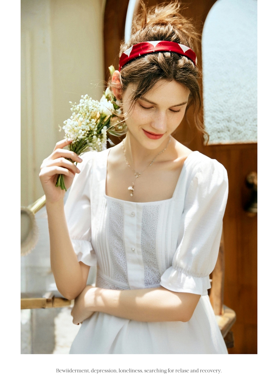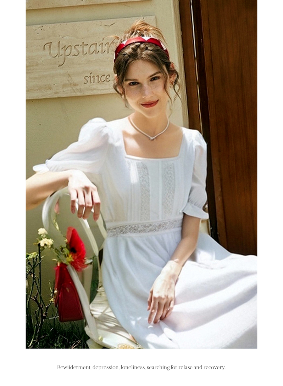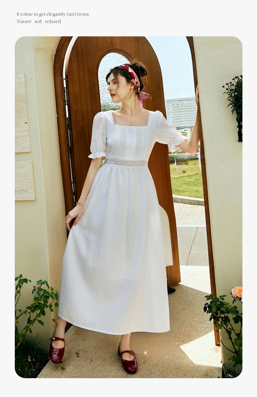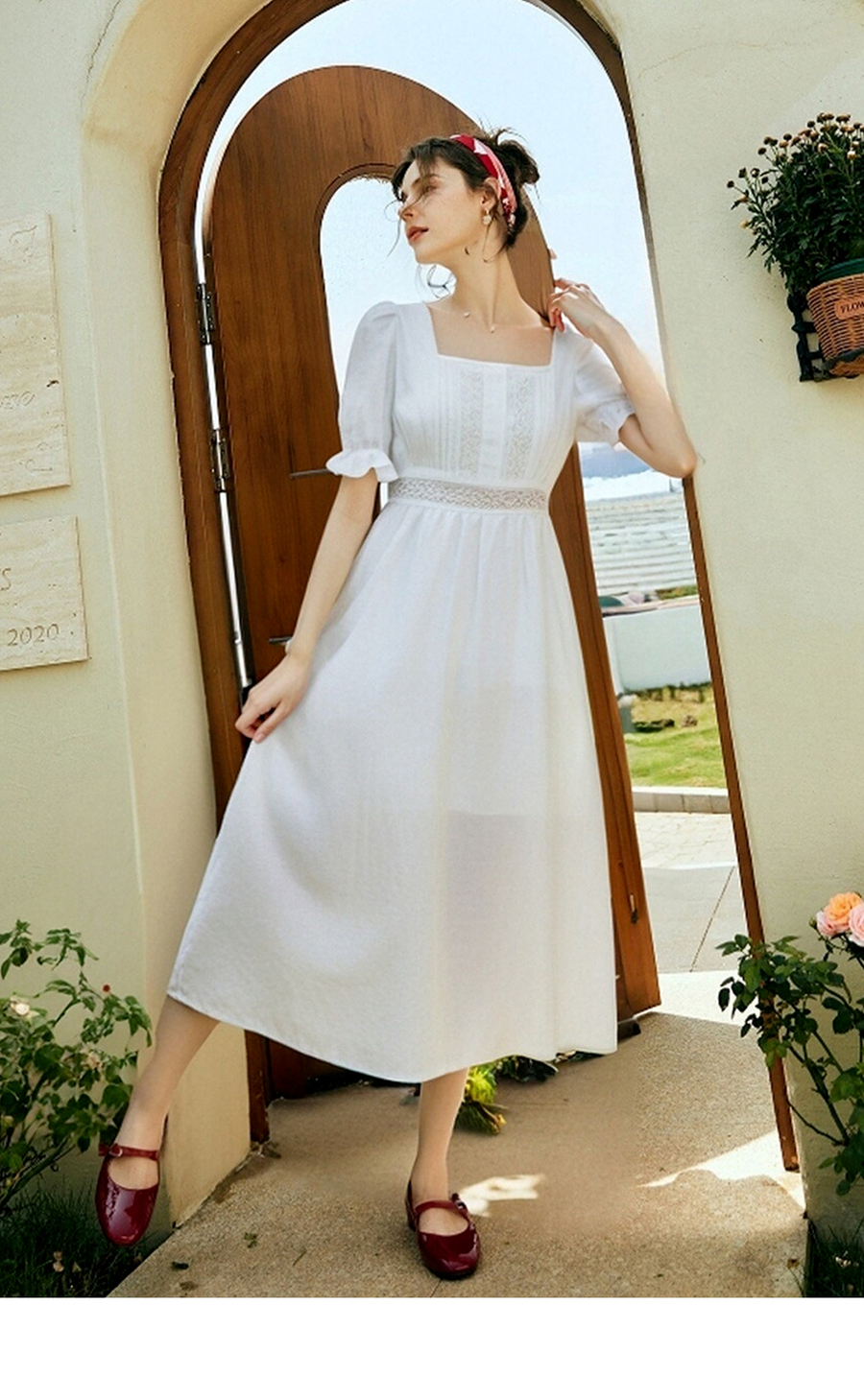OLrain欧芮儿法式田园米白色短袖方领连衣裙女夏季2025新款小白裙