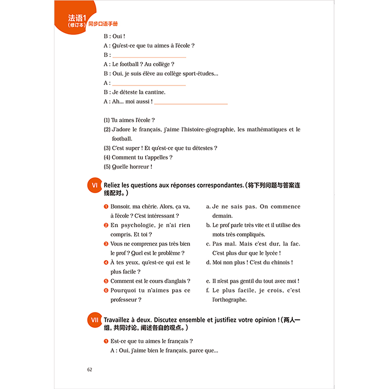 《法语(修订本)1同步口语手册(19新)》与主教材《法语(修订本)1》同步配套,分为18课。采用科学的训练方法,每课从基本的辨音、模仿开始,逐渐在丰富多样的习题中增加口语表达的强度和自主发挥的成分,帮助使用者循序渐进地掌握本课的基本句型和固定表达。