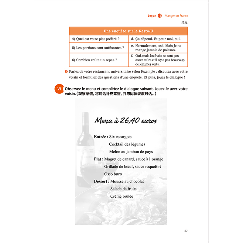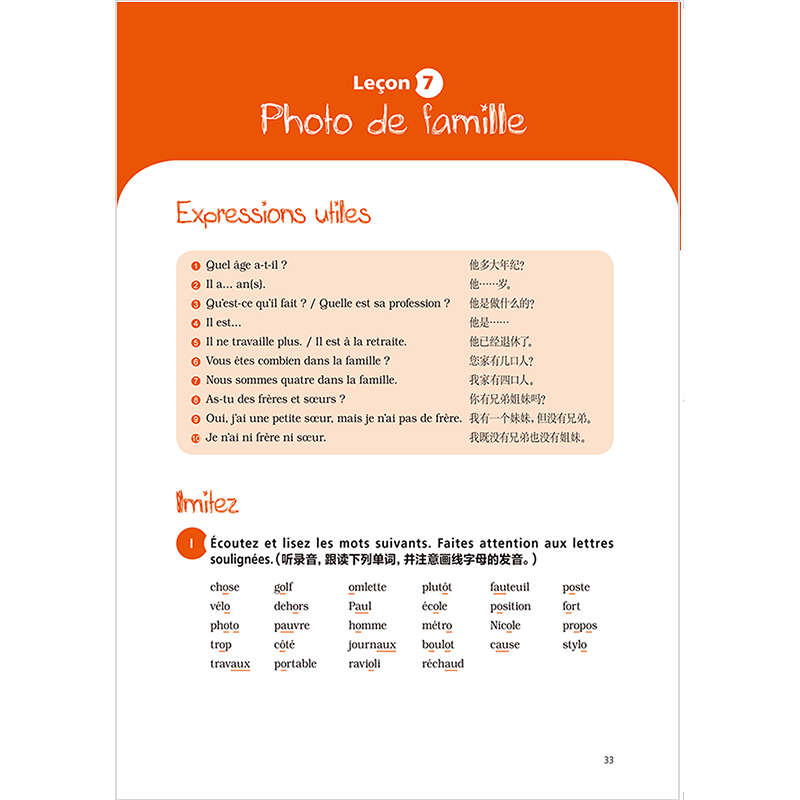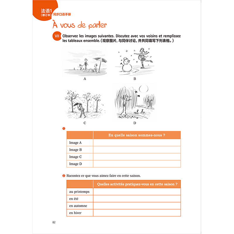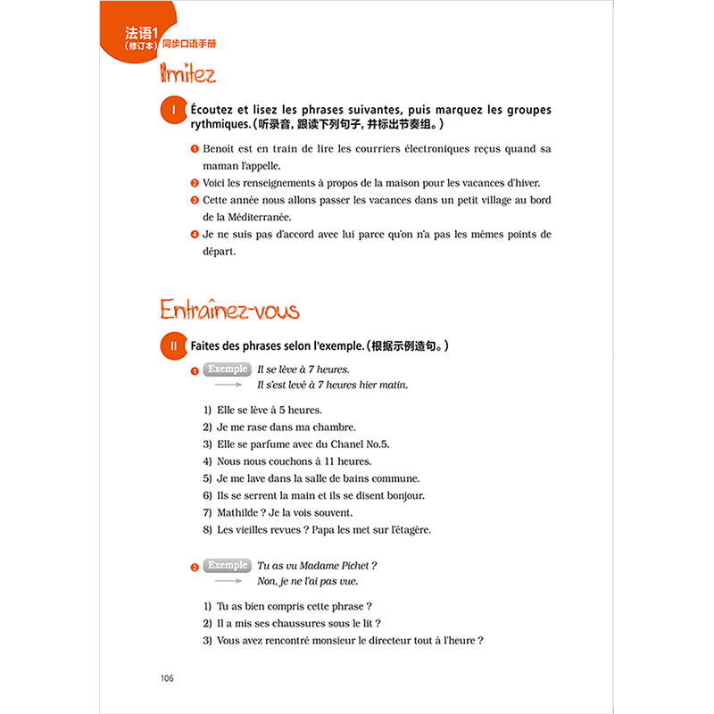 《法语(修订本)1同步口语手册(19新)》每课设Imitez, Entraînez-vous, À vous de parler, Amusez-vous 4个主要练习板块,并在开头列出练习中常用的词汇和表达法Expressions utiles,指导使用者迅速抓住训练重点,强化记忆。