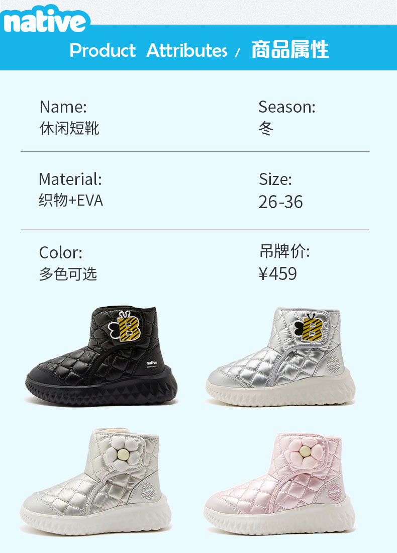 清仓价99元!Native儿童秋冬加绒短靴 加厚毛绒衬里,高帮包裹脚踝,冬天不冻脚