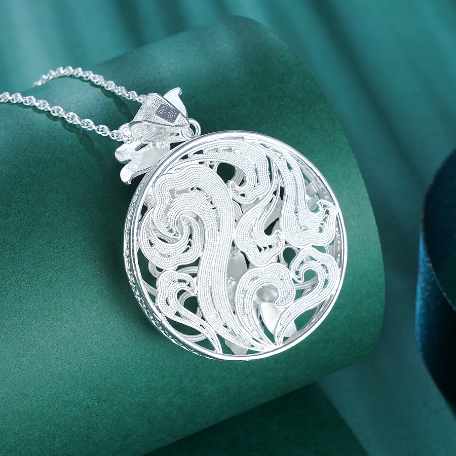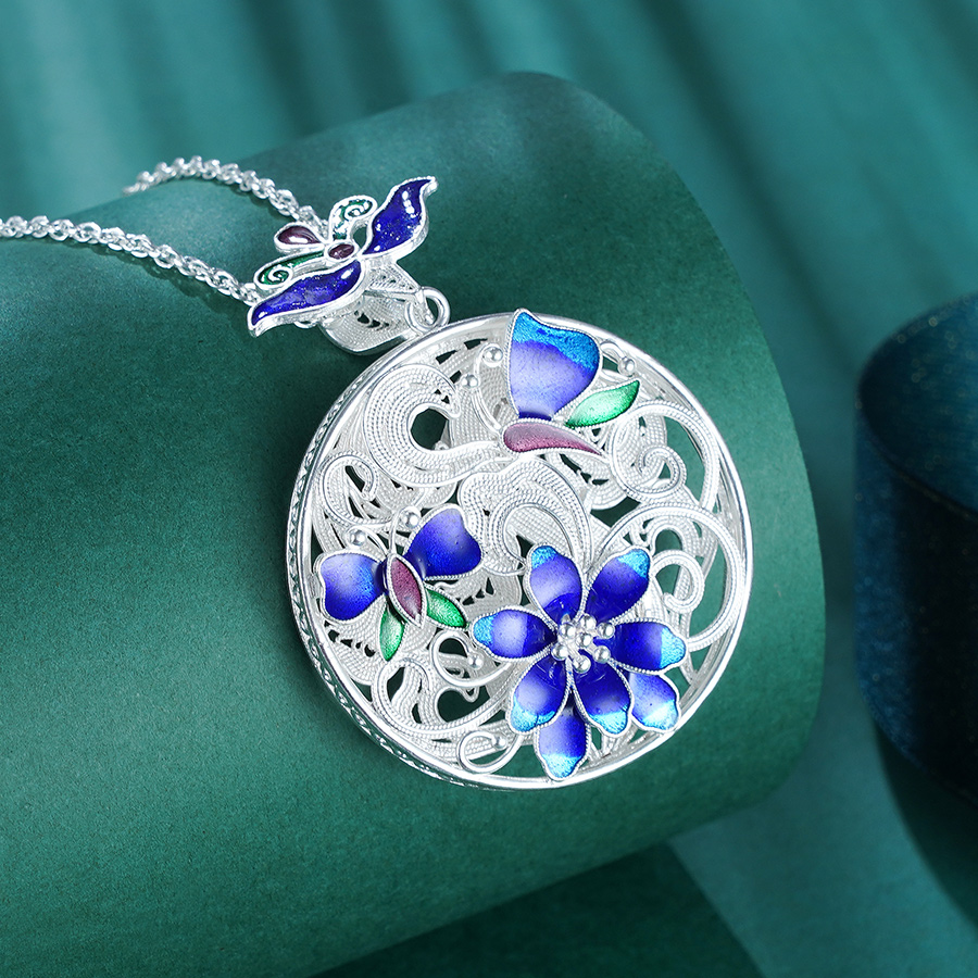 【寓意】:吊坠采用银花丝工艺打造。繁花遇蝶之景,赋予吊坠律动之美。蝴蝶的每一次振翅,花朵的每一缕“芬芳”,都在为佩戴者送上幸福繁荣,福气连天的祝福。
