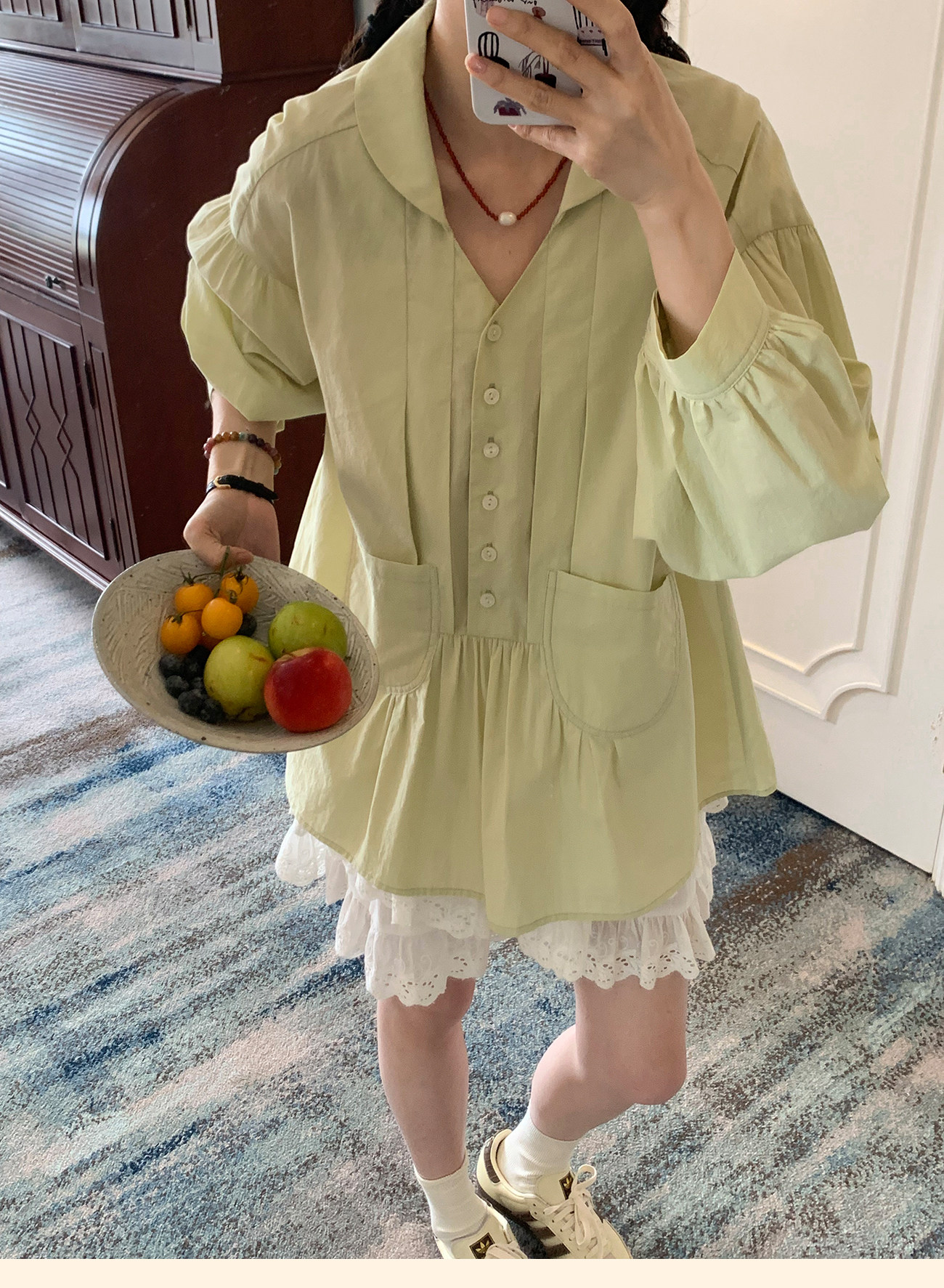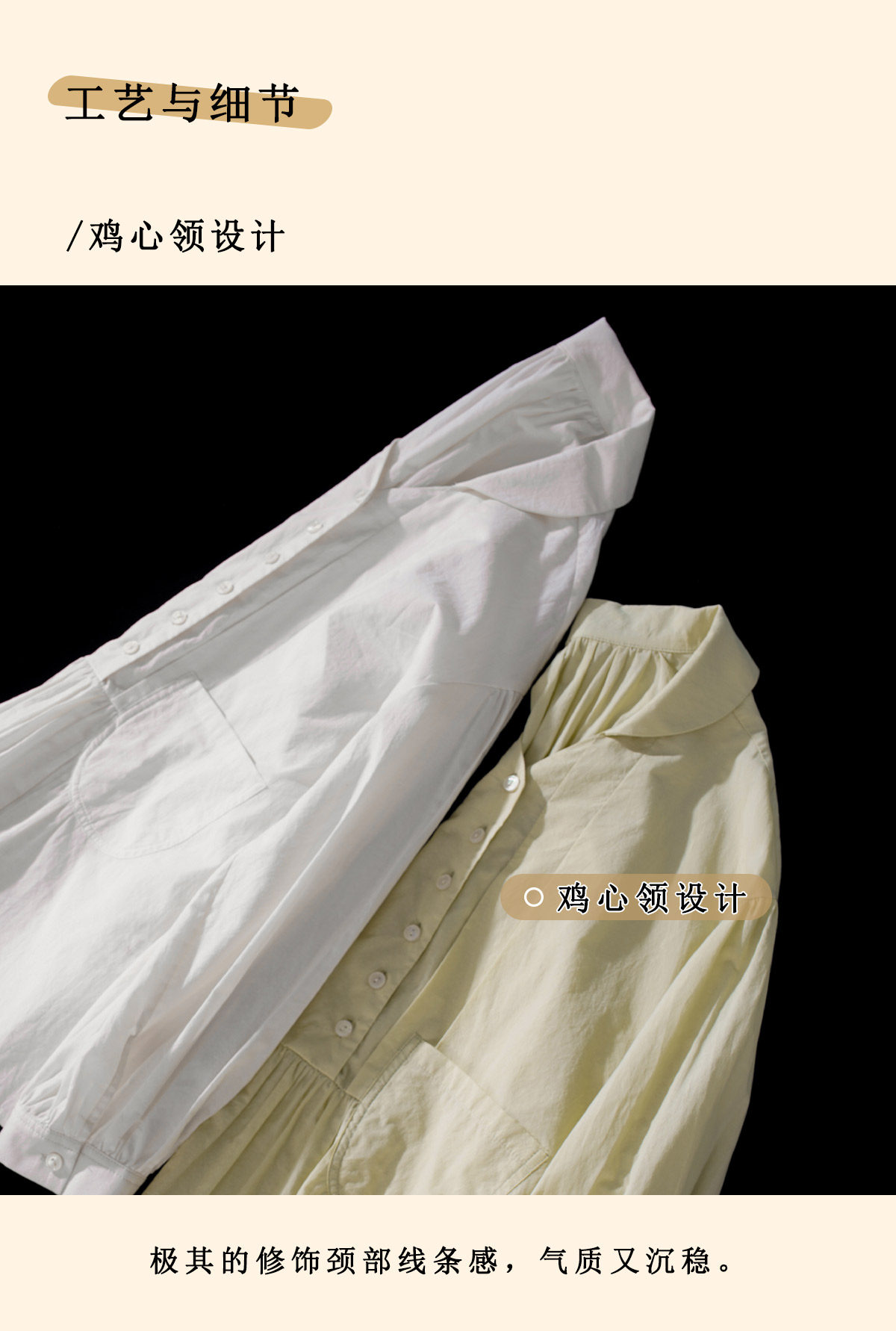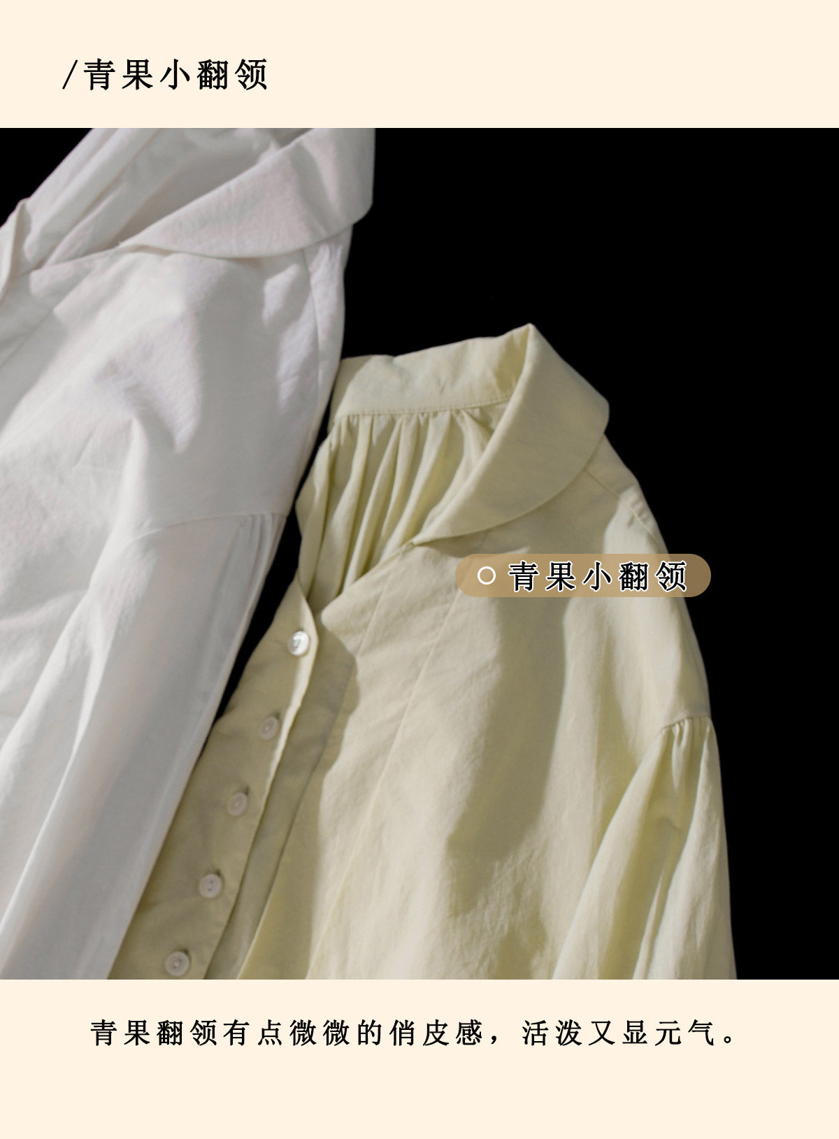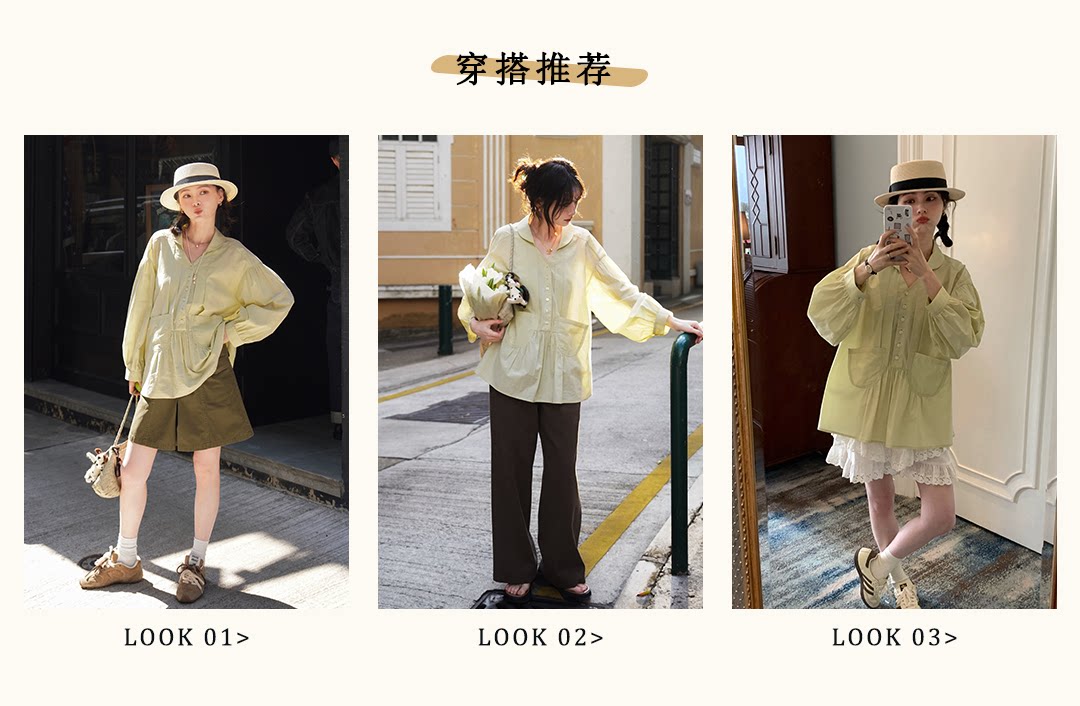 浮生八记/26A017/全棉轻薄青果鸡心领抽皱设计灯笼袖衬衫