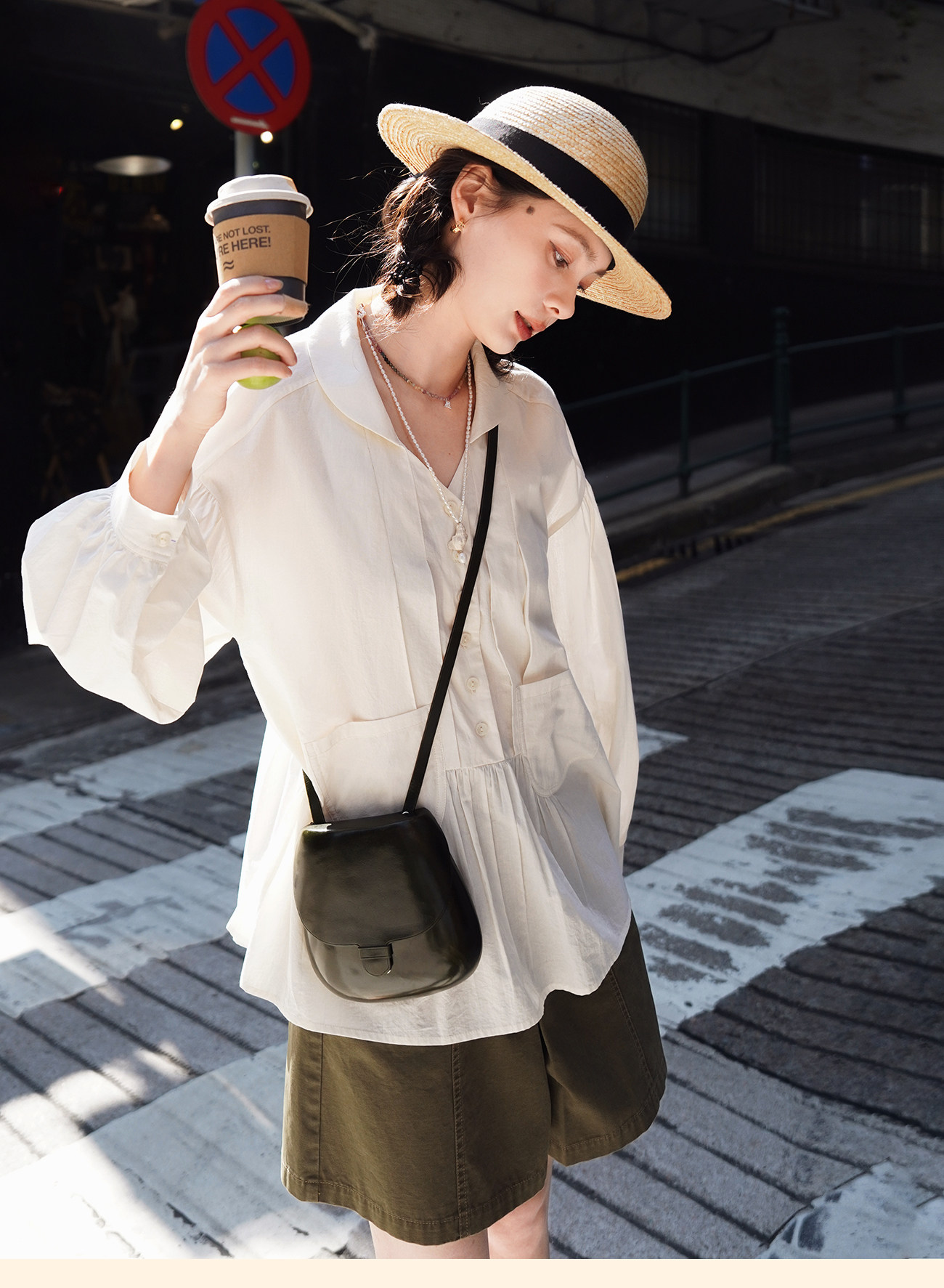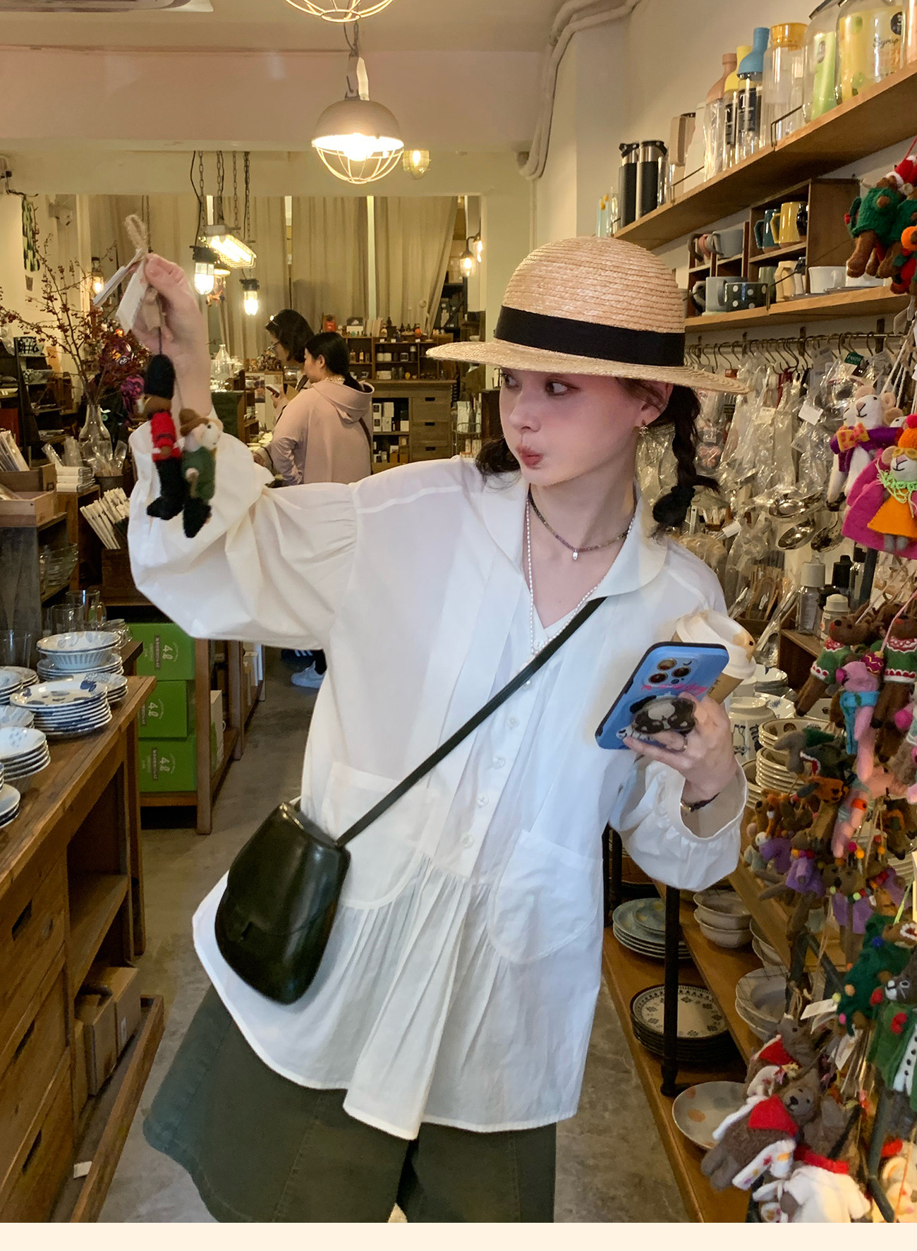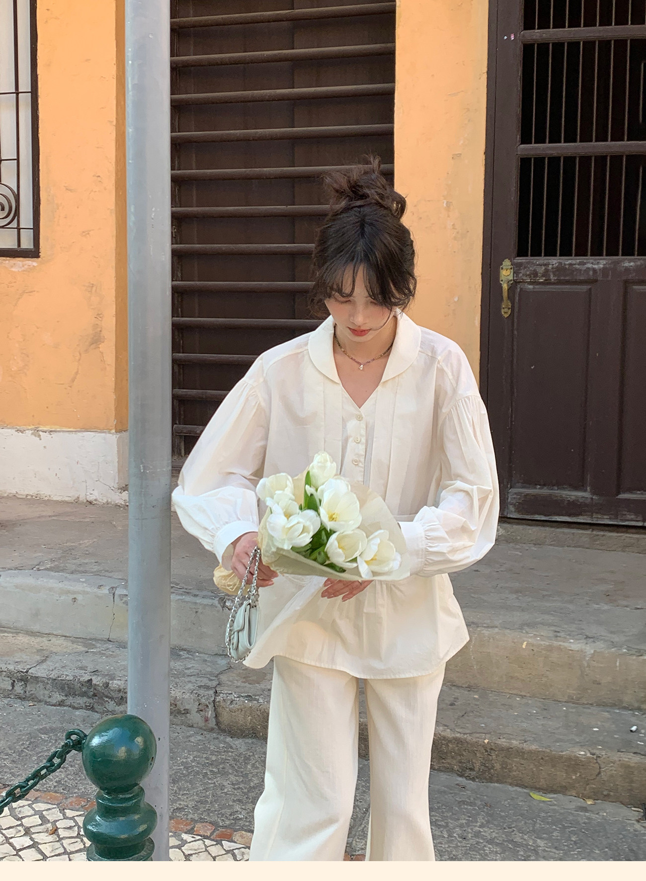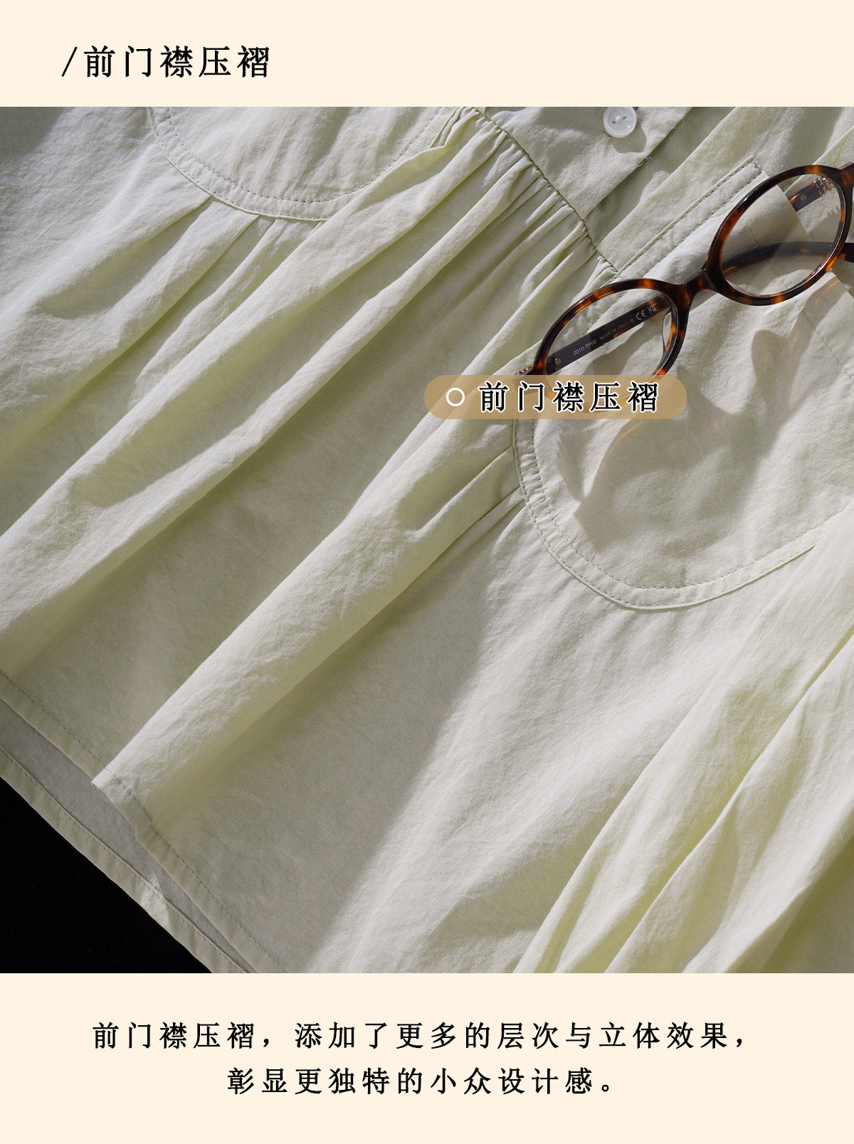 浮生八记/26A017/全棉轻薄青果鸡心领抽皱设计灯笼袖衬衫