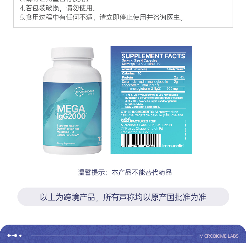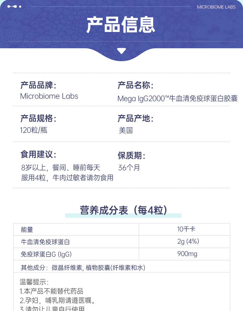 MicrobiomeLabs IgG2000 牛血清免疫球蛋白胶囊120粒/瓶