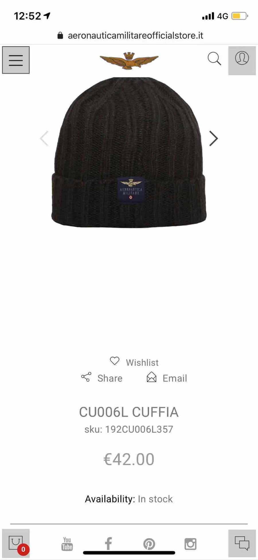说明:1、意大利空军唯一授权指定品牌Aeronautica Militare。东西不便宜。杭州远洋乐堤港,上海新世界大丸百货,都有专柜,档次不低。官网毛线帽的价格在40-60欧左右。对于帽子来讲已经不算便宜了。淘宝都没有卖的东西,不存在假货。正品保真。