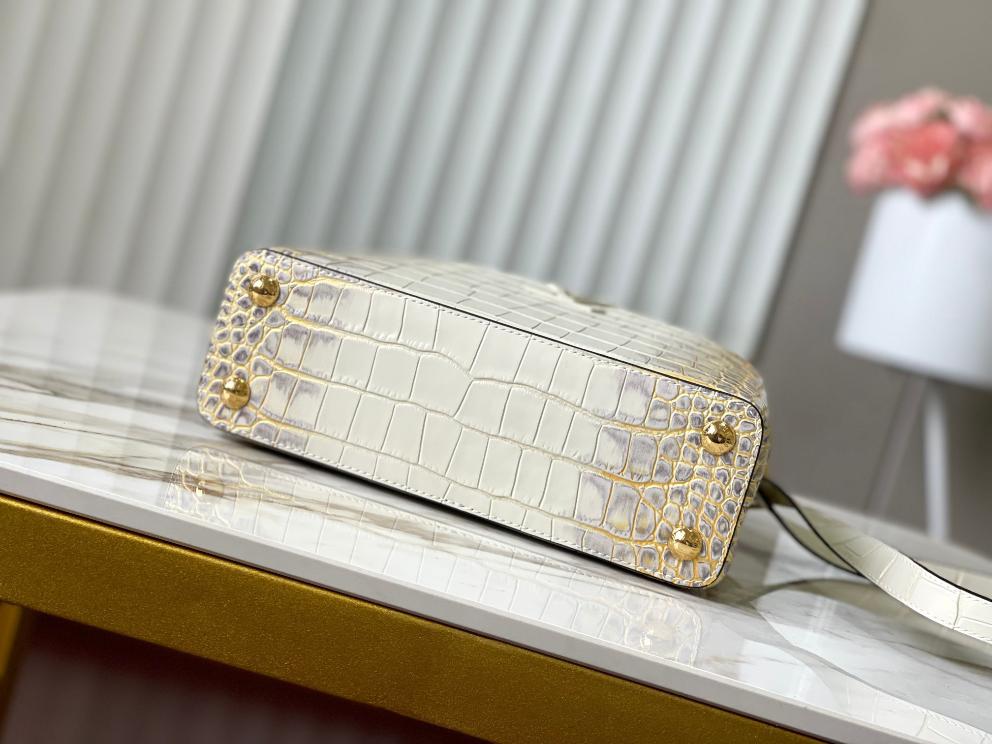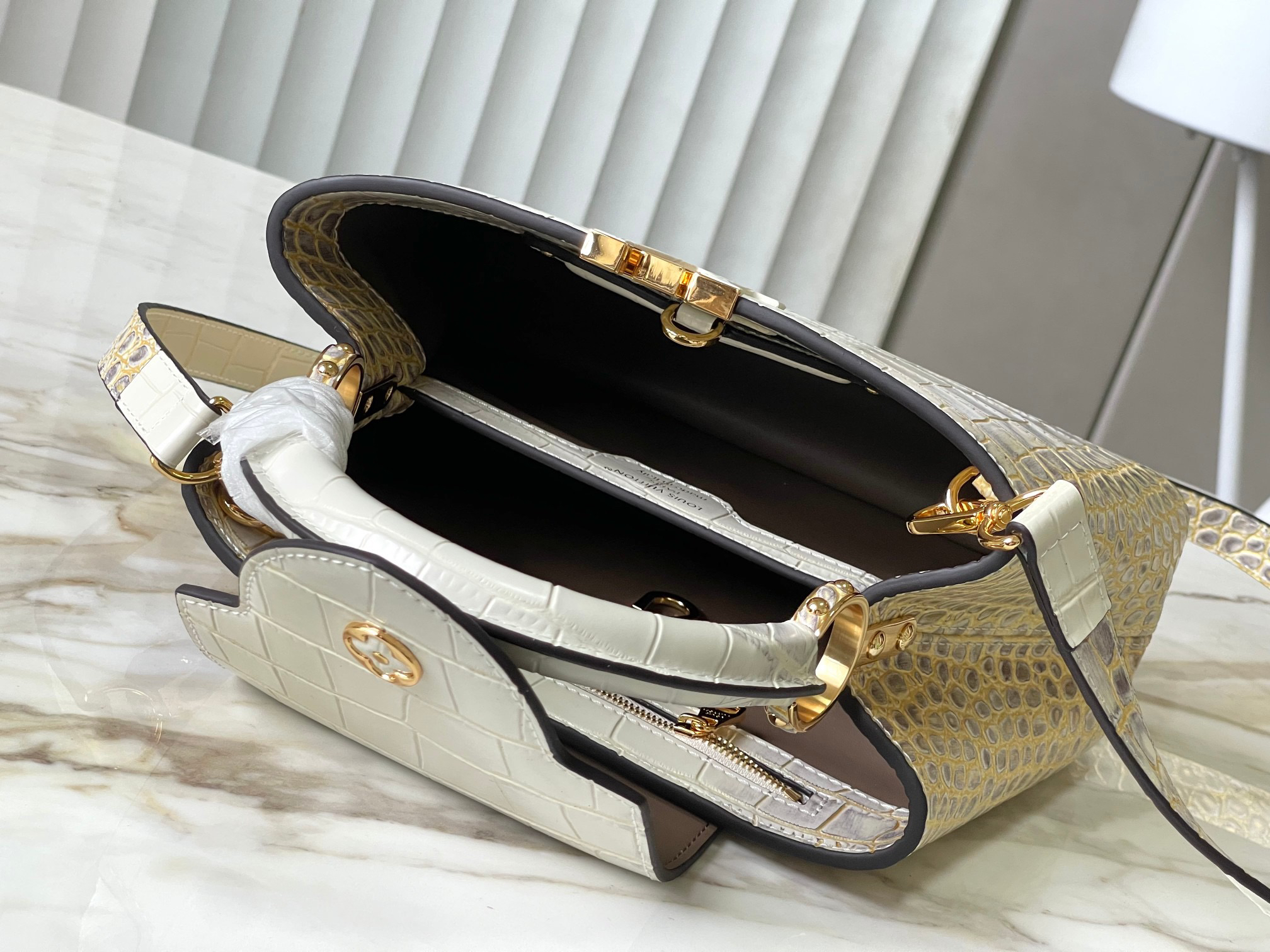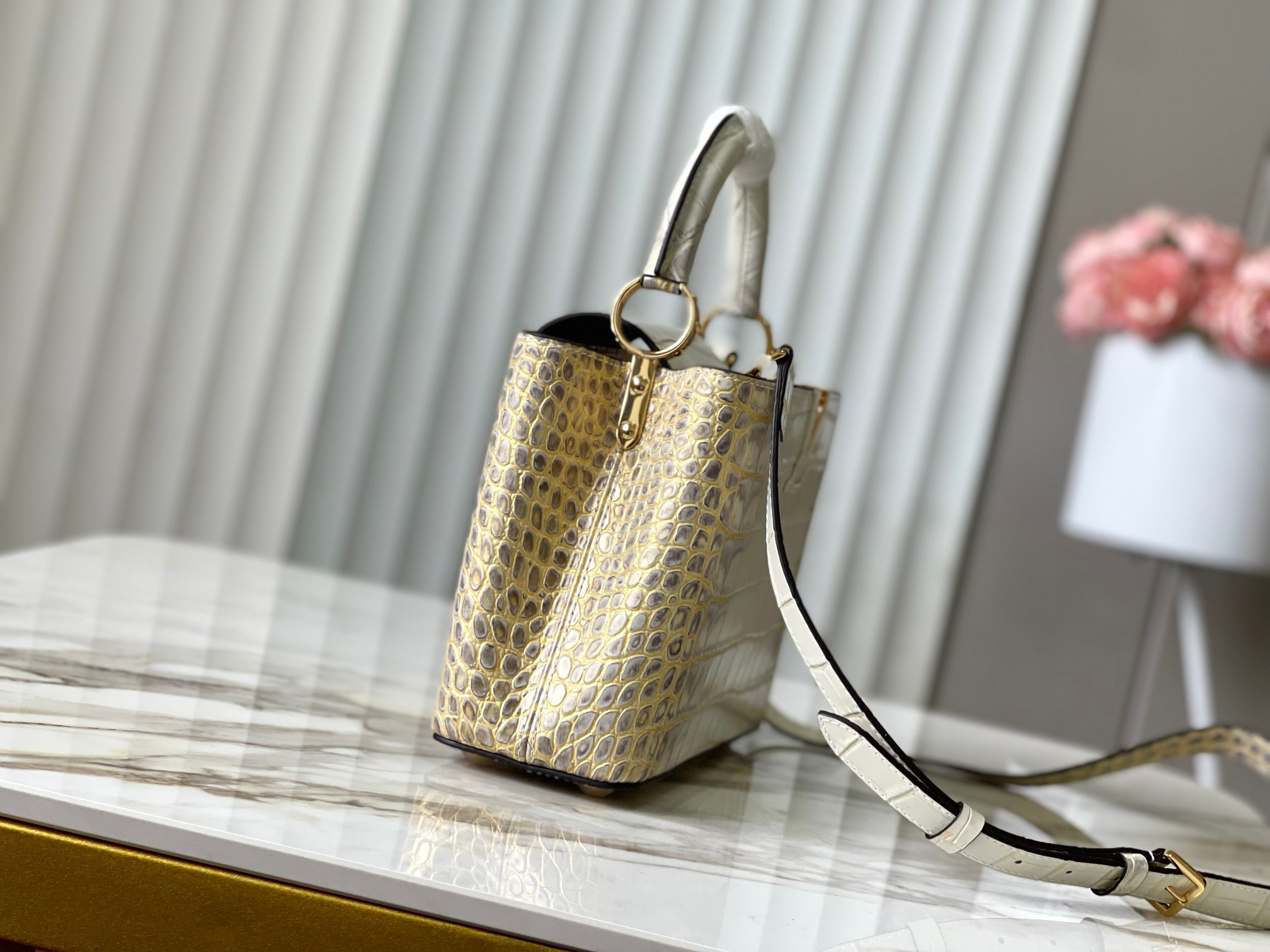 秋冬特惠💰1600 渠道级LV 新品 te级LV N93163/M48865喜马拉雅鳄鱼纹 此款珍贵的Capucines手袋由鳄鱼皮纹 经上高光处理 闪耀迷人 奢华的山羊皮衬里与闪闪发光的金属饰件 特有的Capucines搭盖既可收入包内 展示字母标识 又可外翻 呈现Monogram Flower图案 出行的理想配饰 Size: 27 * 18 * 9 CM