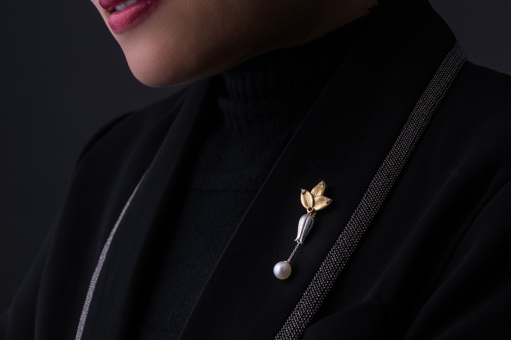 “三生石·新国珠·悦倾城”系列里三生石根据佩戴场景的变化,将这款“静待花开·玉兰”做了胸针、吊坠两用款设计。