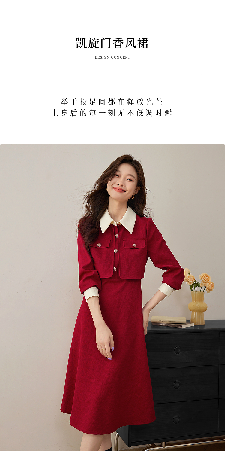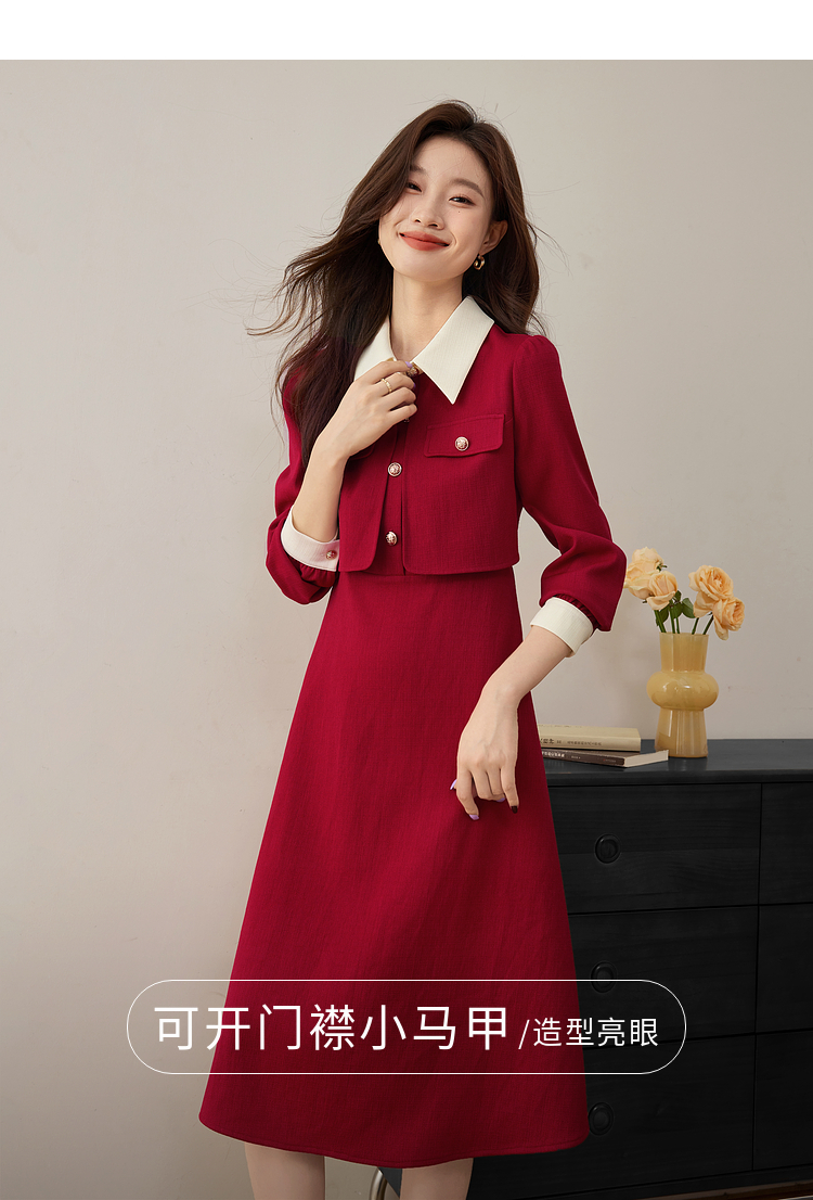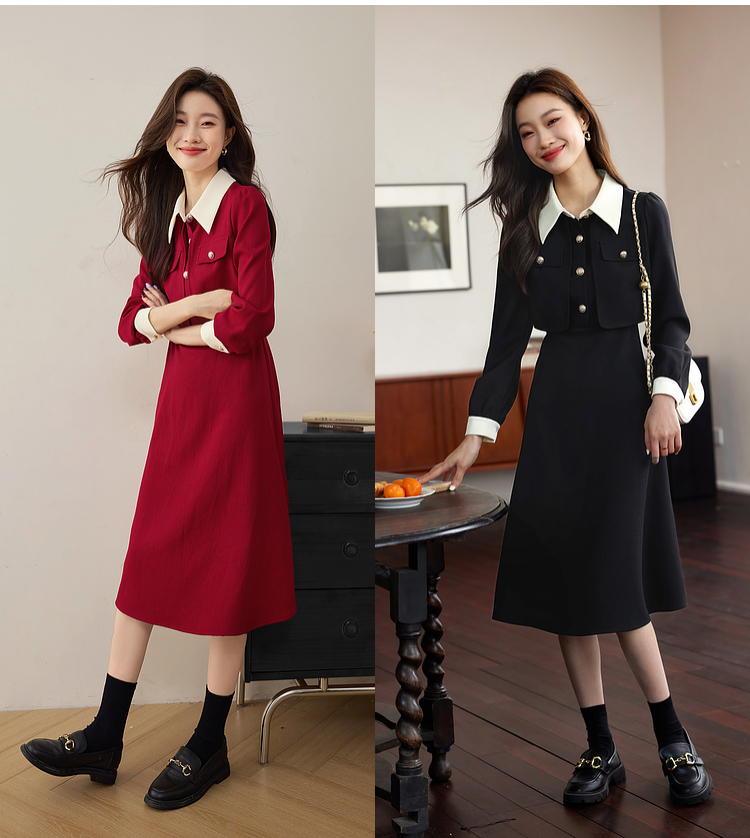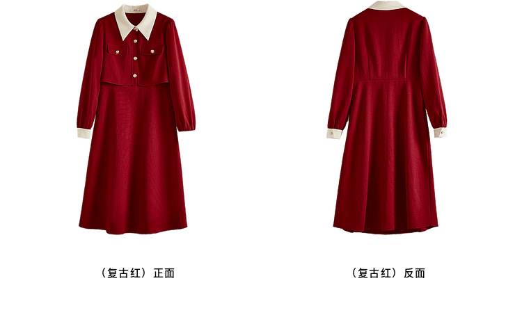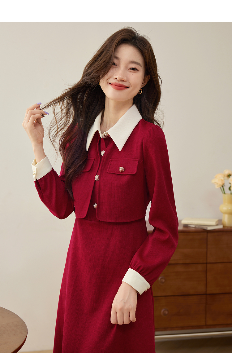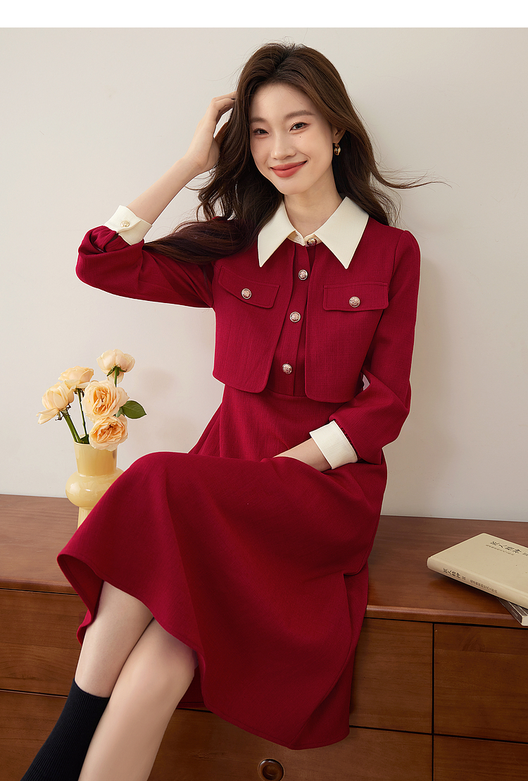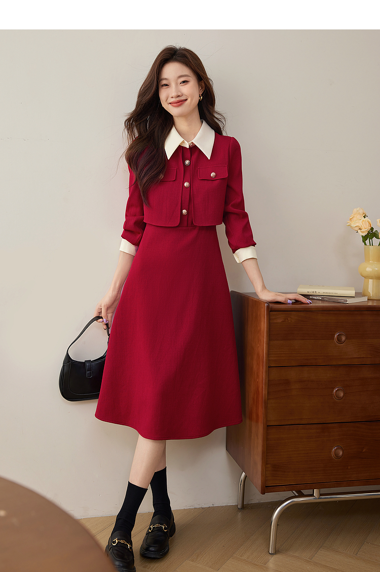 【五折购】熙世界赫本小香风红色连衣裙女2025秋季新款气质衬衫领假两件裙子