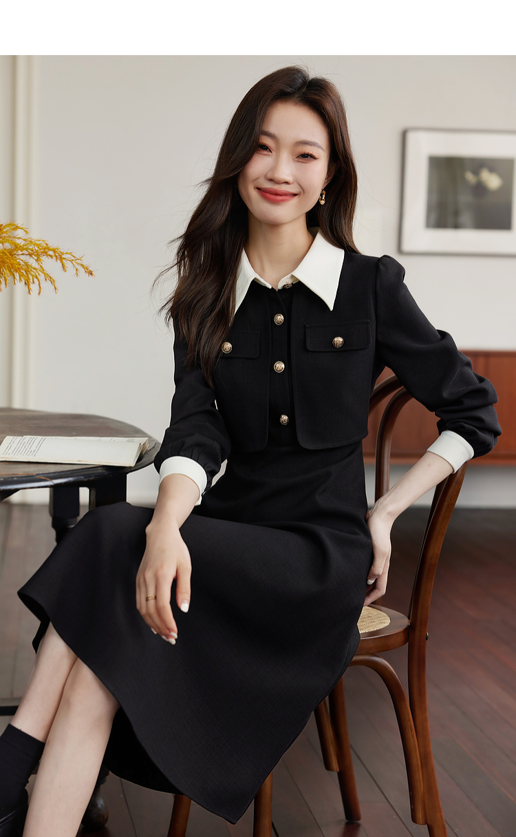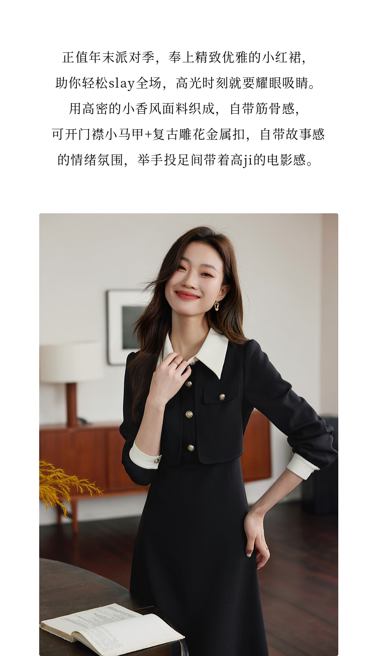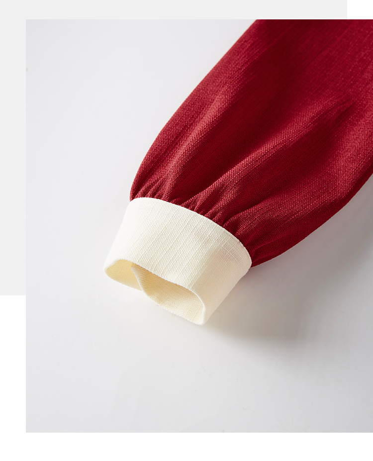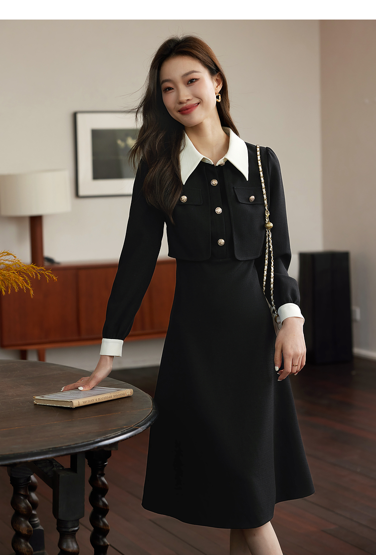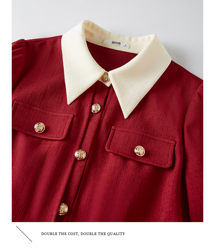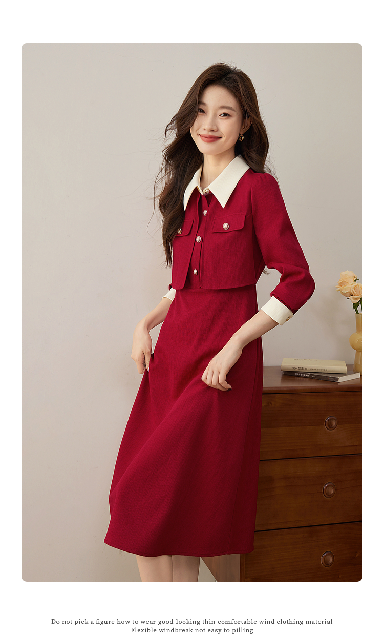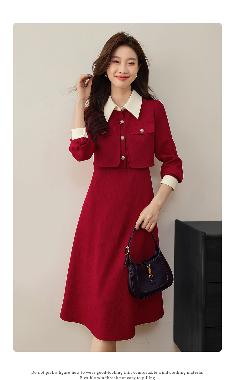 【五折购】熙世界赫本小香风红色连衣裙女2025秋季新款气质衬衫领假两件裙子