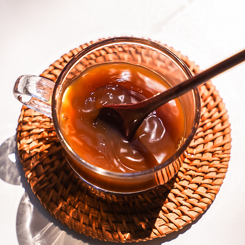 经过数次滤渣熬煮的红糖,放入水中,冲泡5分钟后,融化速度慢,颜色略微偏淡。