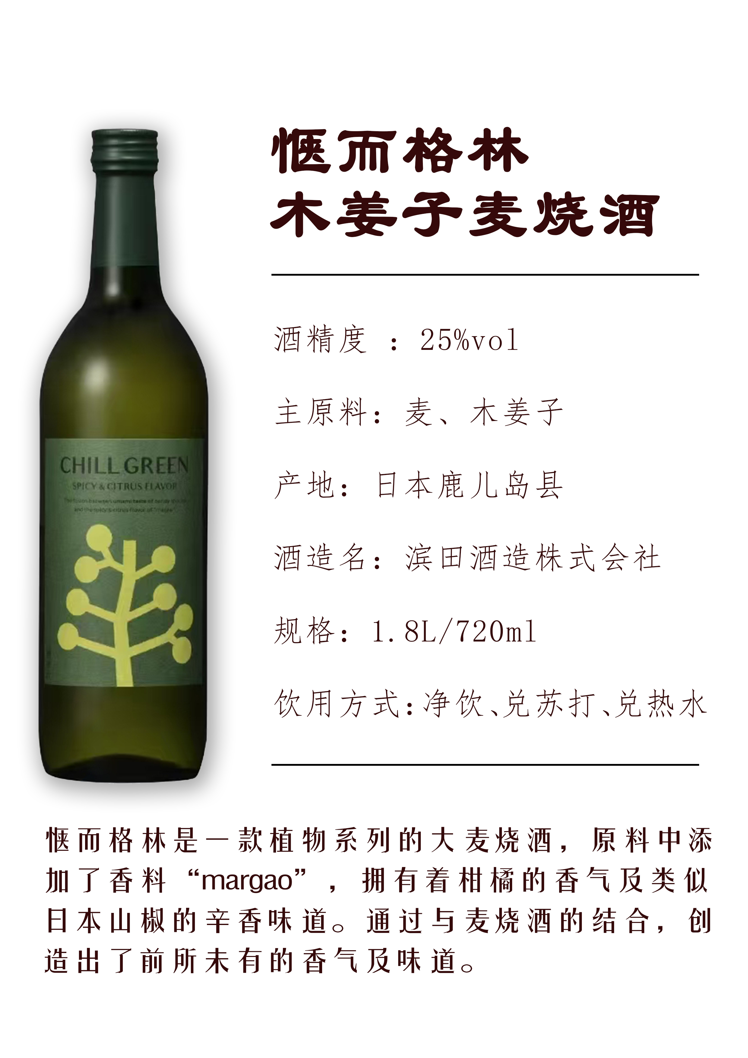 原装进口 惬而格林 木姜子麦烧酒(酒精度 25% vol)