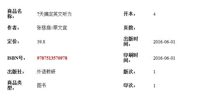 张慈庭、蔡文宜所著的《7天搞定英文听力》是为提高英文学习者的听力水平而专门设计的。1天听1回,7天听懂老外在说什么。《7天搞定英文听力》包含2200个基础单词、200句自信表达关键句和210篇超生动老外亲录生活对话,逐级深入学习,只要7天,英文听力、理解力、沟通力手到擒来。