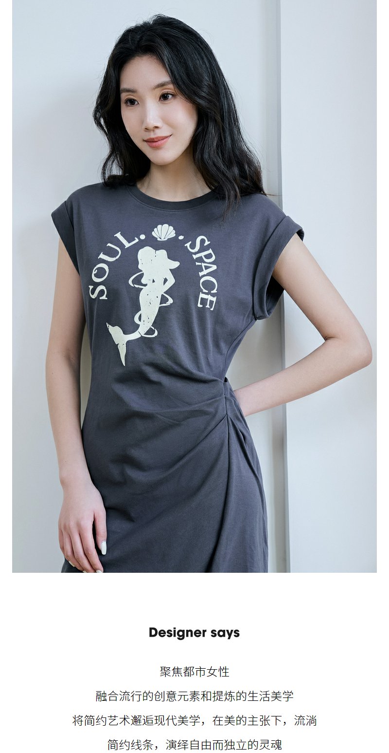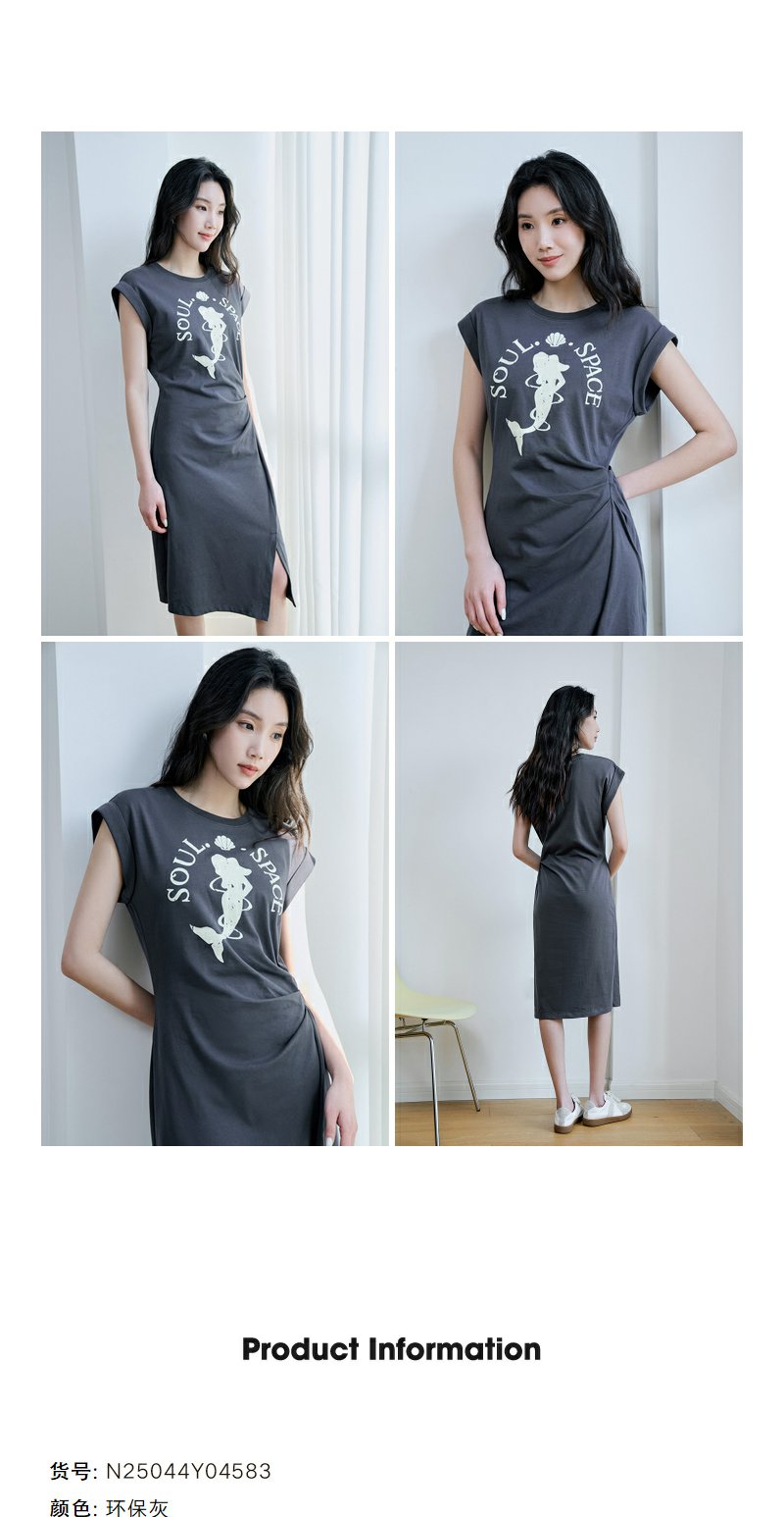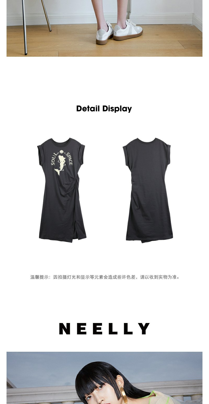 NEELLY纳俪商场同款夏季新款烟灰色收腰休闲连衣裙女印花褶皱长裙N25044Y04583