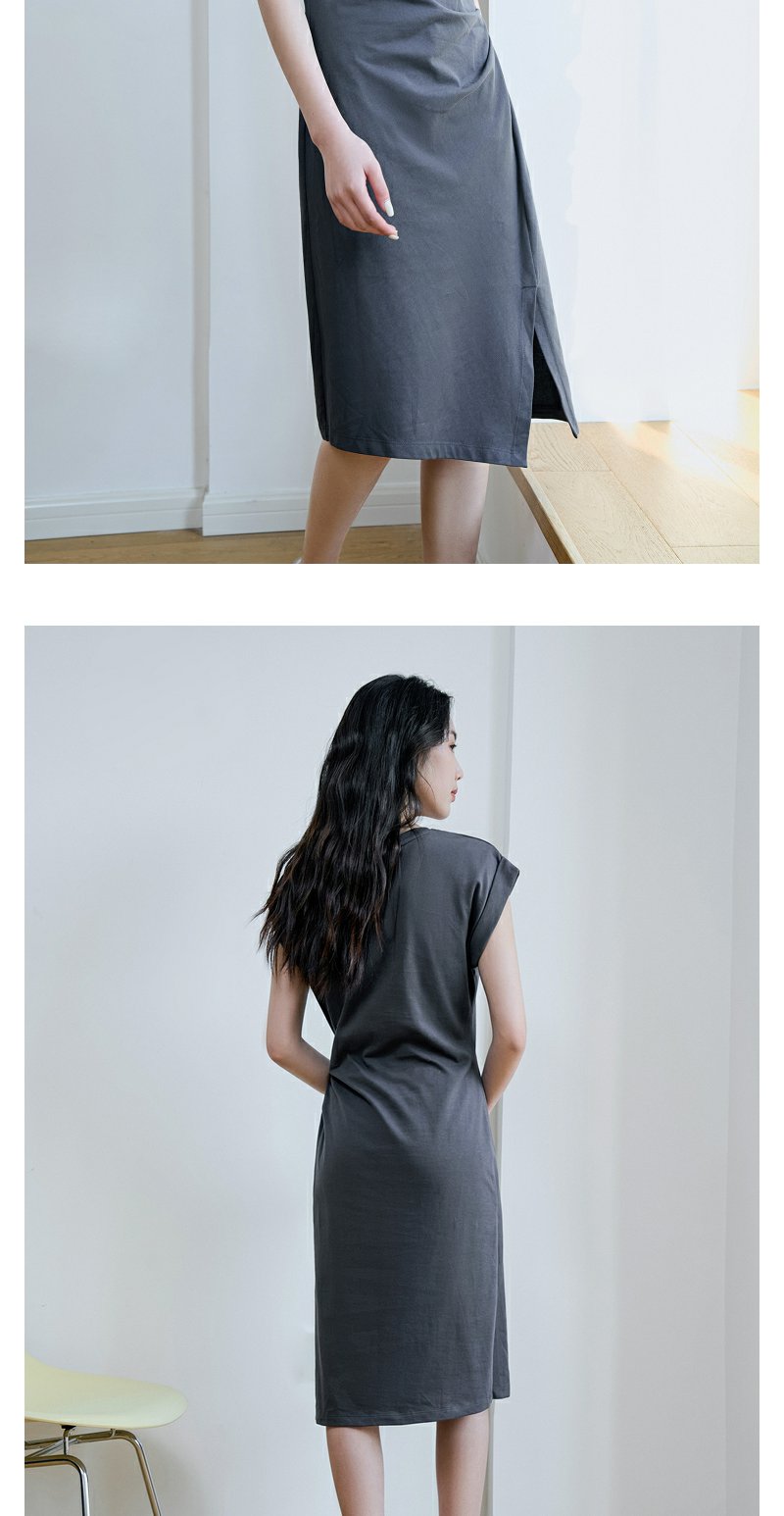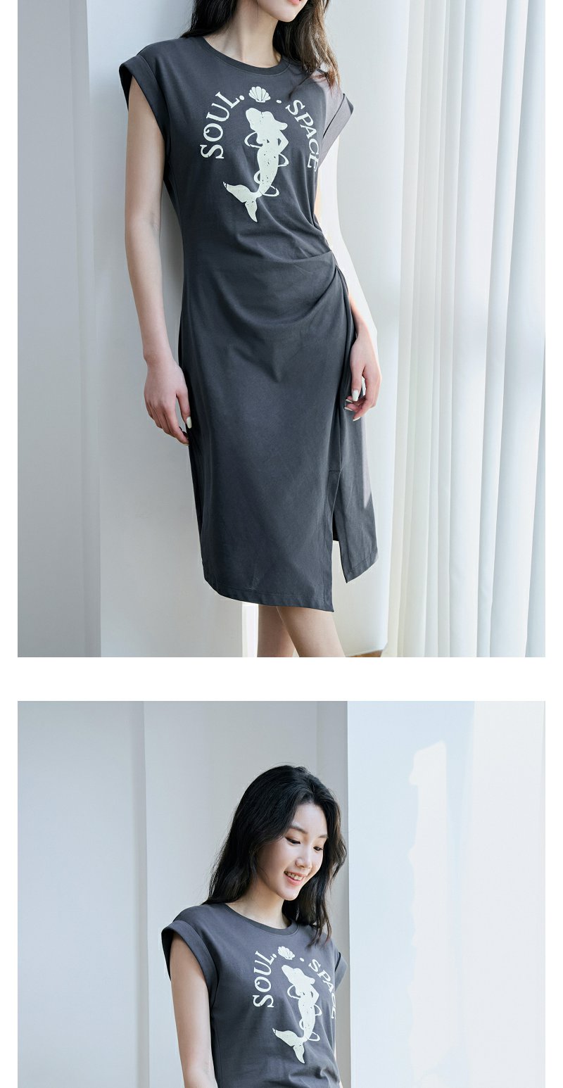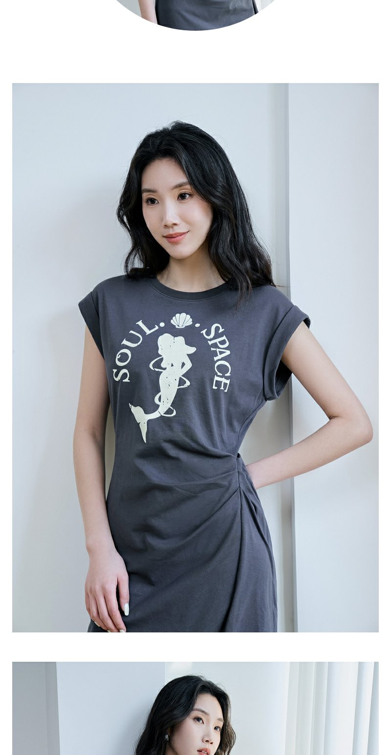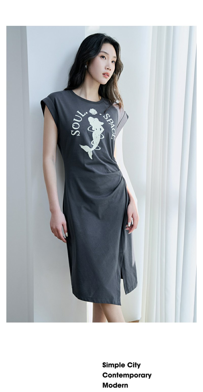 NEELLY纳俪商场同款夏季新款烟灰色收腰休闲连衣裙女印花褶皱长裙N25044Y04583