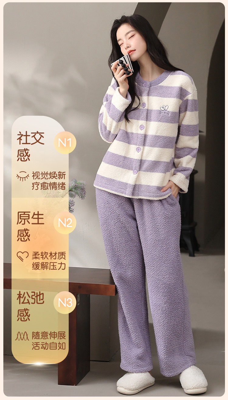 【M-2XL】【猫人】女士条纹半边绒家居服套装