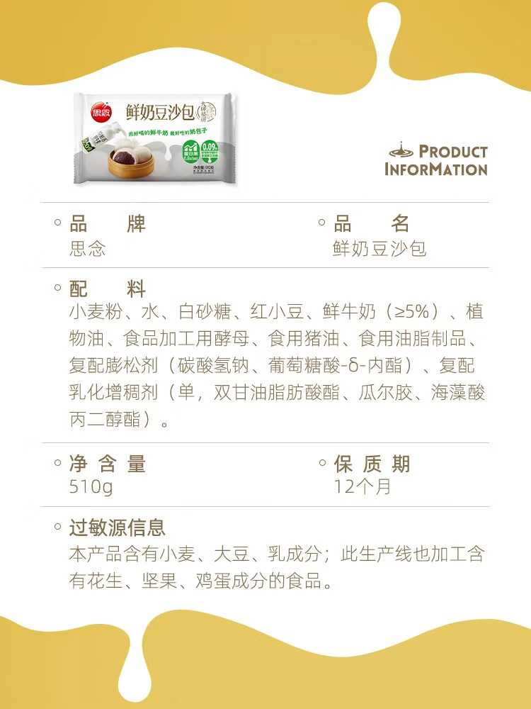 思念大师精研鲜奶豆沙包510g